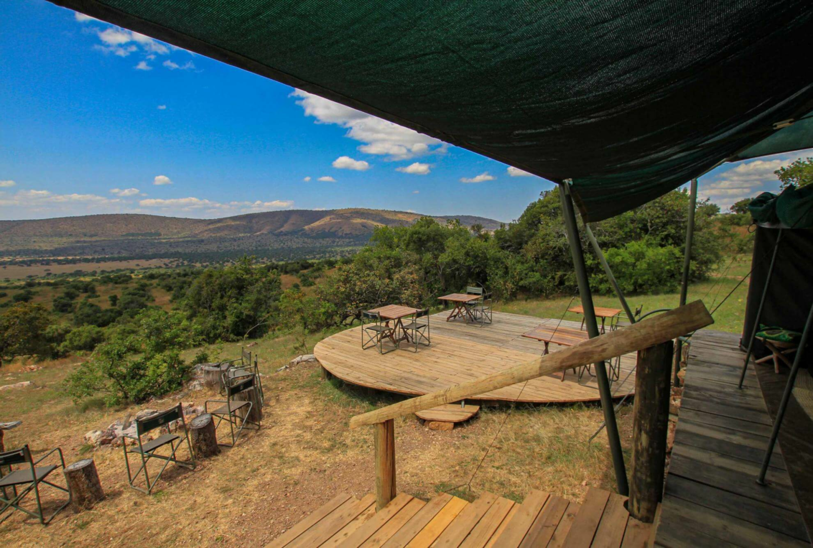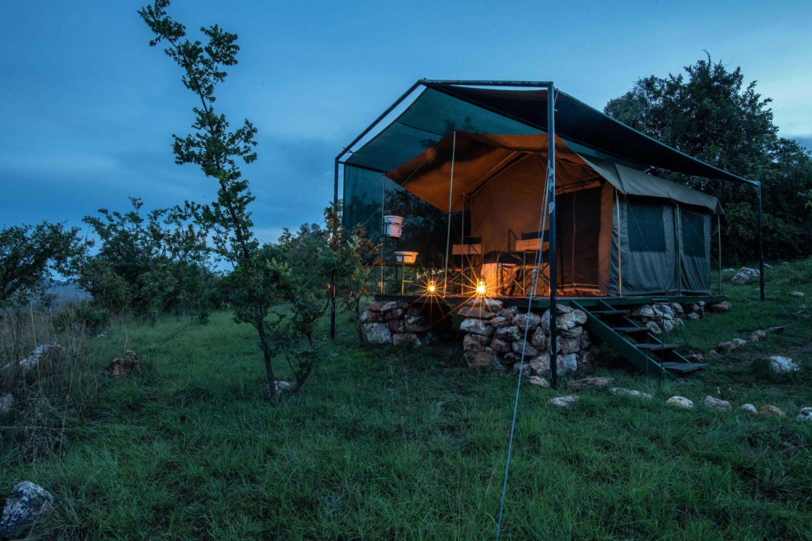 Der zentrale Bereich wird von der Feuerstelle dominiert und bietet einen weiten Blick über den wenig besuchten nördlichen Teil von Akagera, wo Karenge liegt. Natürlich gibt es auch eine öffentliche Zeltmesse mit bequemen Wagen und Sitzen in schrillen Farben, die den optimistischen Geist des Betreibers widerspiegeln. Die Unterbringung erfolgt in sechs einfachen Safarizelten, die leicht erhöht auf dem Boden stehen. Die Mahlzeiten werden zusammen mit dem Manager und den Führern am gemeinsamen Tisch eingenommen.