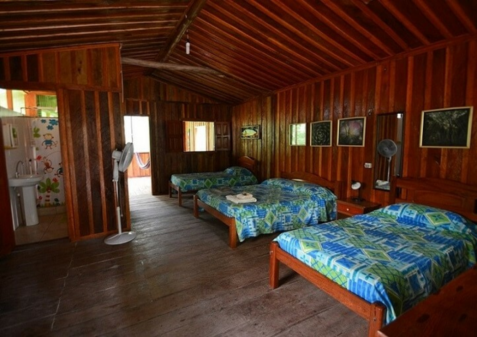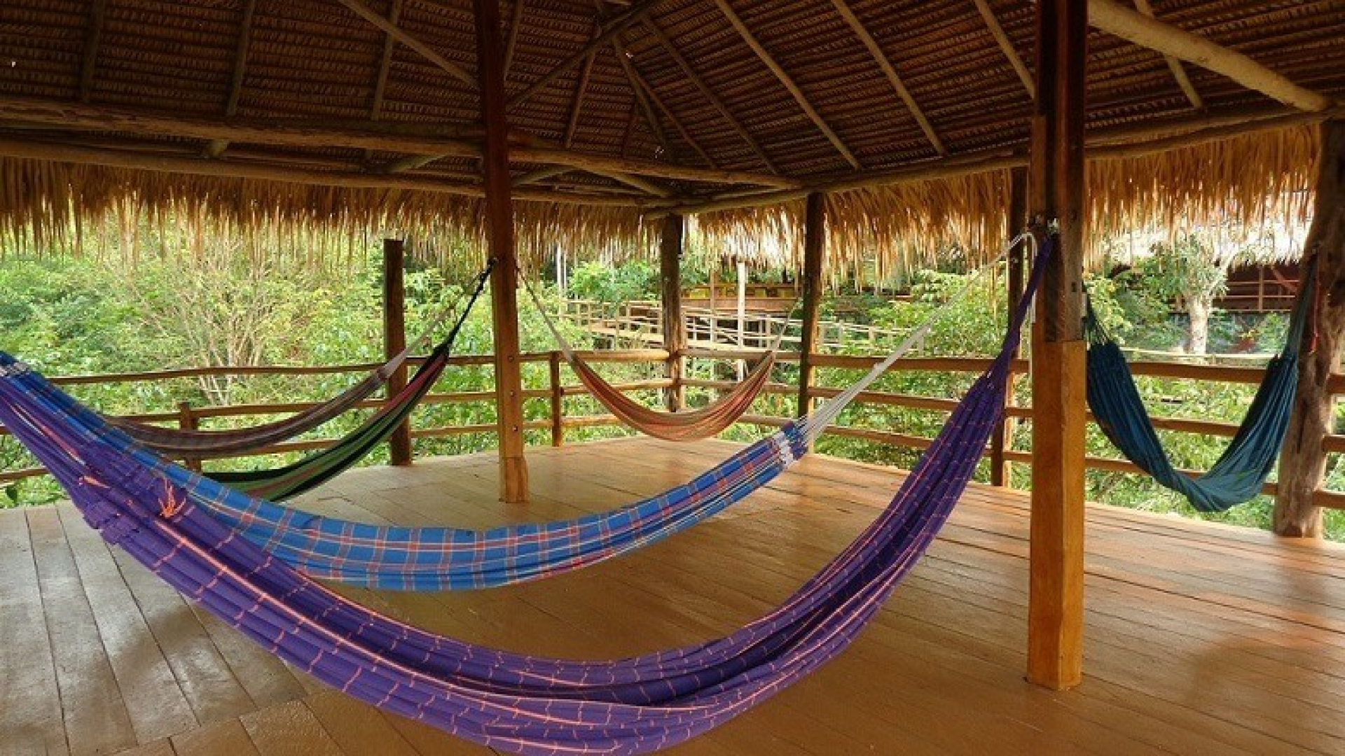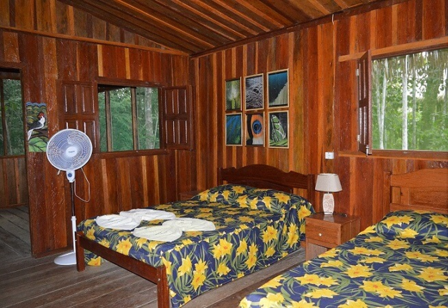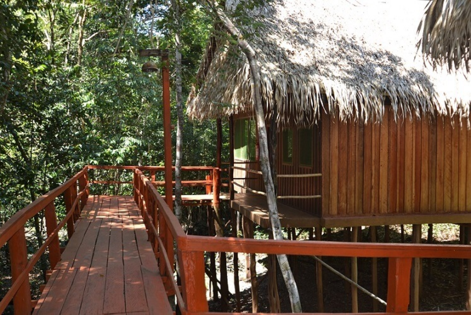 Die Lodge besteht aus acht einzelnstehenden rustikalen Bungalows aus Holz auf Stelzen, die mit einander über Stegen verbunden sind. Eingerichtet wurden sie mit regionaler Kunst und alle verfügen über Ventilatoren sowie ein privates Bad. Die Zimmer haben Doppel- oder Einzelbetten, einen Ventilator (keine Klimaanlage), viele kleine, verglaste Fenster, die den Blick auf die Bäume freigeben und einen Balkon mit Hängematte.