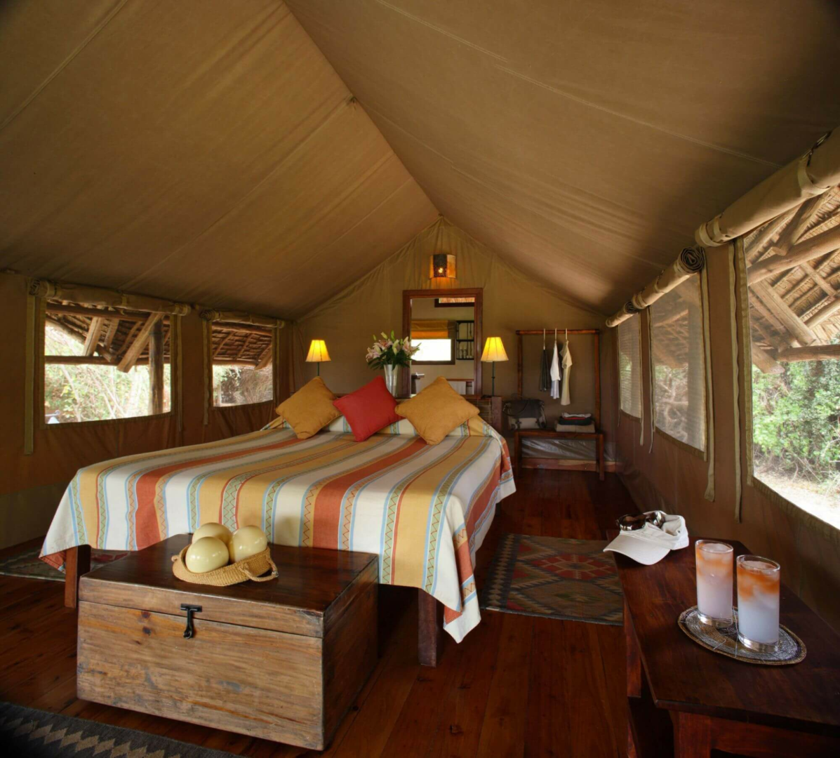 Die Gäste werden in insgesamt 15 Luxuszelten unter Reetdach untergebracht, die über schmale gepflasterte Wege erreicht werden. Man kann dabei eigentlich nicht mehr von richtigen Zelten sprechen, das stilvolle Schlafzimmer wurde auf einer Holzplattform errichtet, das Badezimmer ist aus festen Materialien gebaut. Eine kleine Veranda rundet das Bild ab.