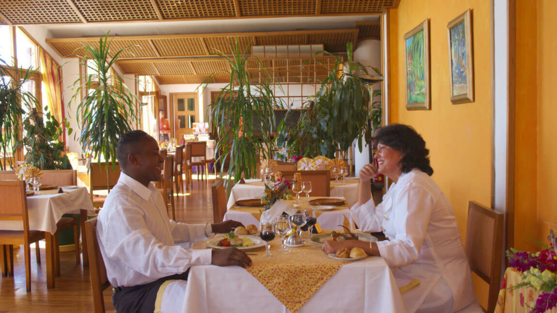 Es gibt auch ein ziemlich gutes Restaurant, in dem ein angemessenes Frühstück und Abendessen serviert wird. Manchmal wird das Abendessen durch Live-Musik untermalt. Es gibt auch eine schöne Terrasse mit Blick auf den Palast. Und natürlich einen nicht beheizten Pool (manchmal zu kalt für die kühlen Temperaturen in Tanas) und ein Hammam.