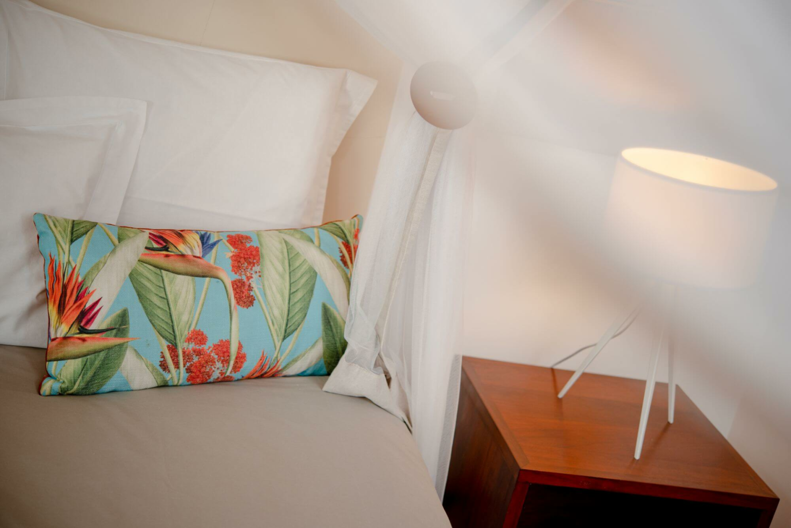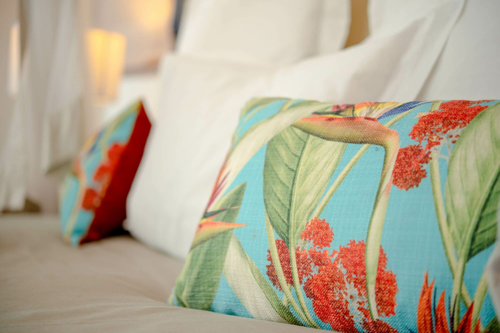 Eine Treppe führt hinauf zu den sechs Deluxe Zimmern im Obergeschoss. Diese sind in fröhlichen und schillernden Farben gehalten und mit schicken und modernen Designmöbeln ausgestattet. Das Doppelbett mit Moskitonetz thront in dem geräumigen Zimmer, dem das Holzdekor und die Wandteppiche einen Hauch von Romantik verleihen. Außerdem gibt es ein schönes Badezimmer und eine Terrasse oder Balkon.