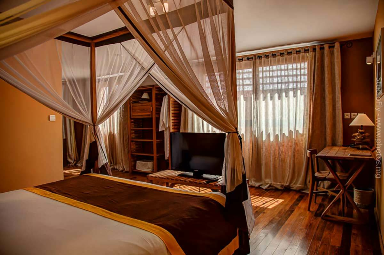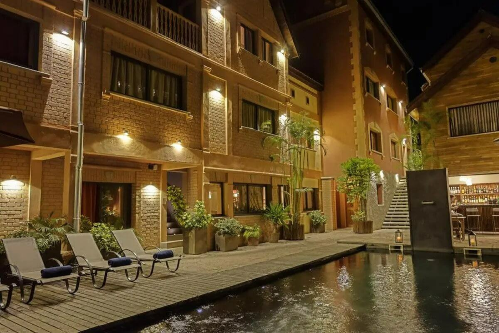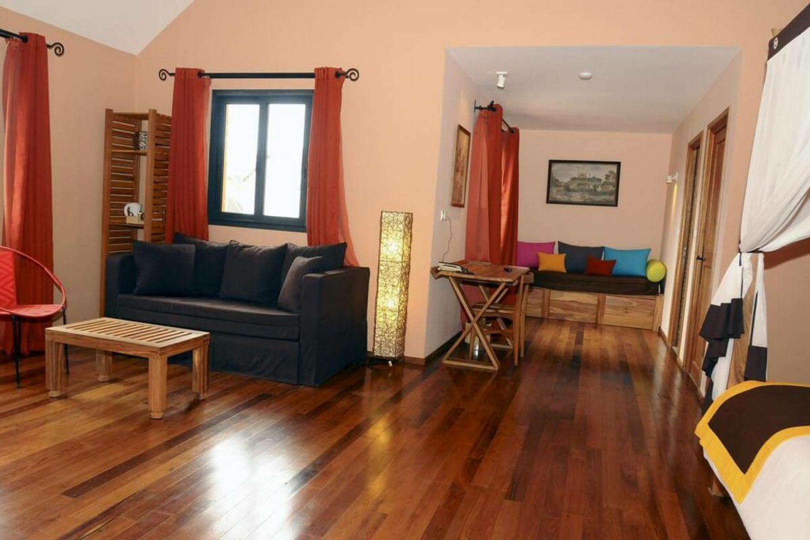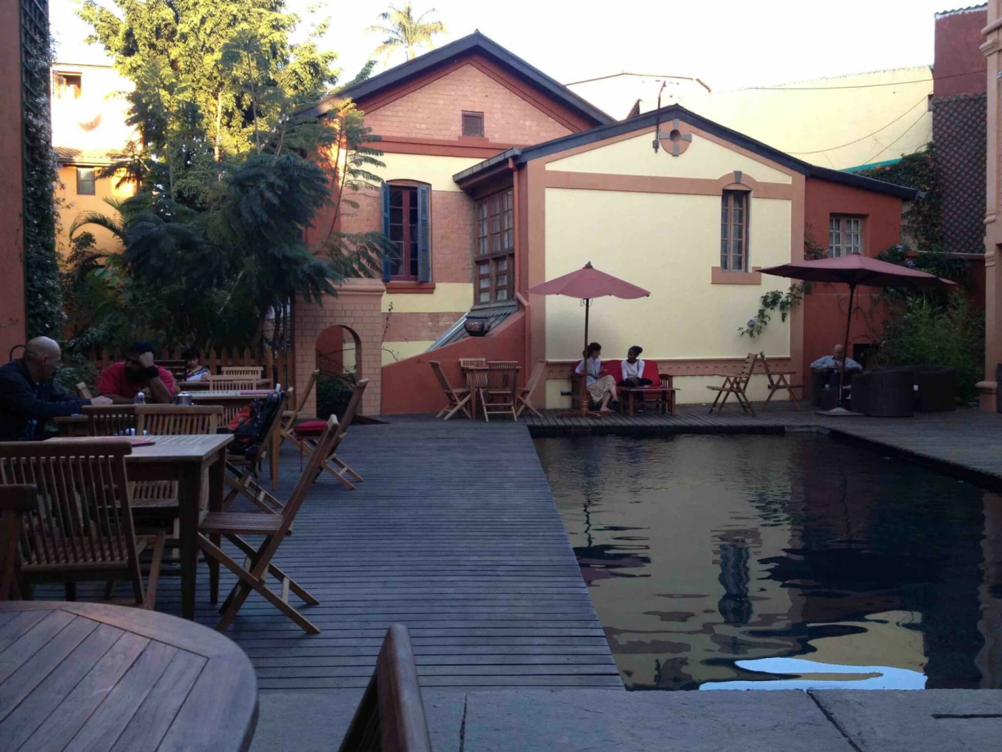 Die Zimmer sind nicht auf herkömmliche Weise angeordnet, sondern etwas ungeordnet, was zur Atmosphäre nur beiträgt. Sakamanga erstreckt sich über mehrere Gebäude in einem komplexen Layout von kleinen Patios und Korridoren mit einem Swimmingpool und einem kleinen Garten in der Mitte. Es gibt eine nette Bar am Pool und viele Sitzgelegenheiten im Freien. Die Zimmer sind alle unterschiedlich gestaltet, aber alle sind sehr groß und sauber. Alle Zimmer haben Wechselstrom, mehrere Steckdosen, Ladegeräte, Fernseher, Kühlschrank und Kaffeemaschine.
