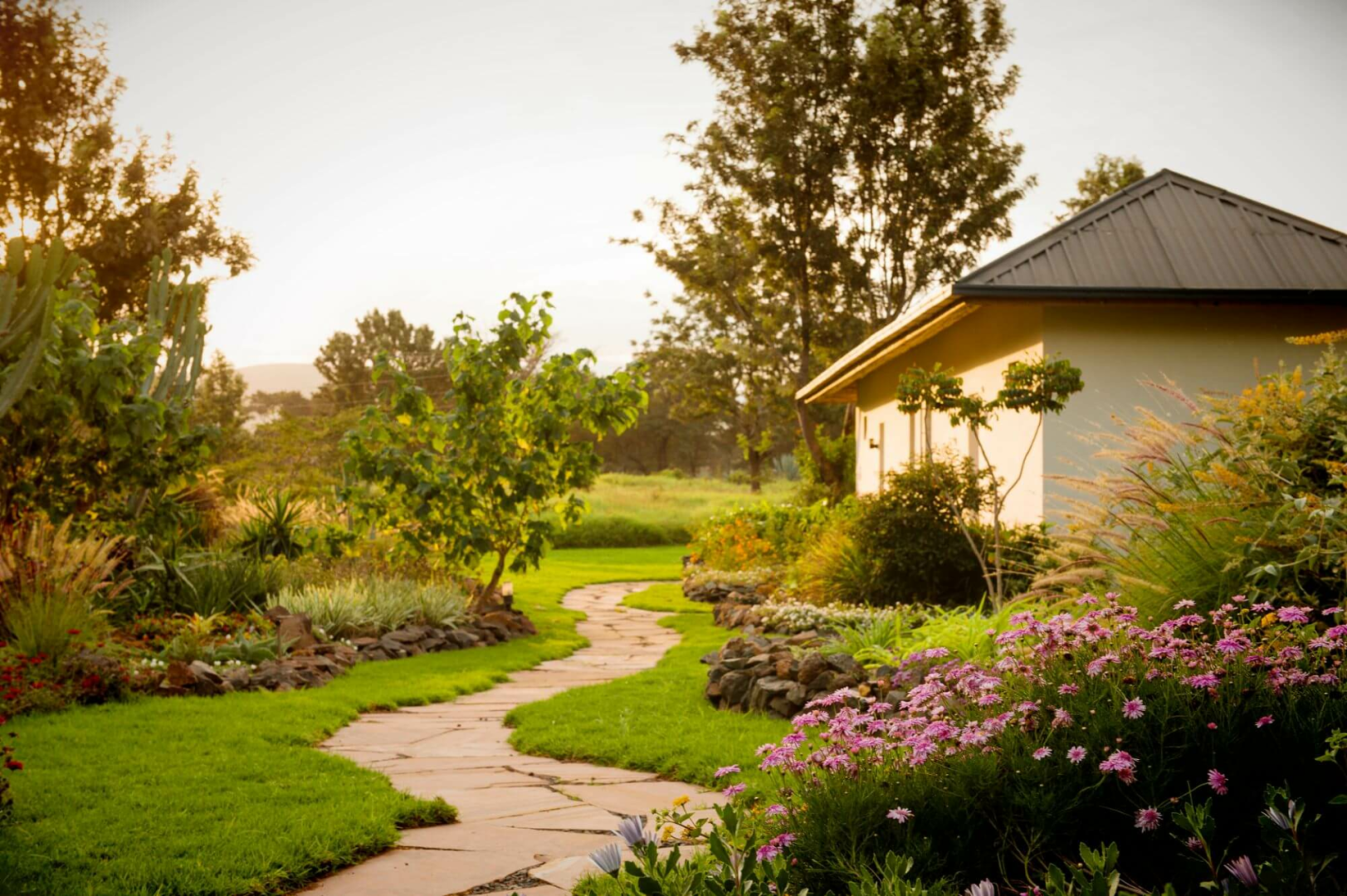 Die Gärten sind wunderschön, voller tropischer Blumen und an einem klaren Tag kann man den Berg Meru sehen.