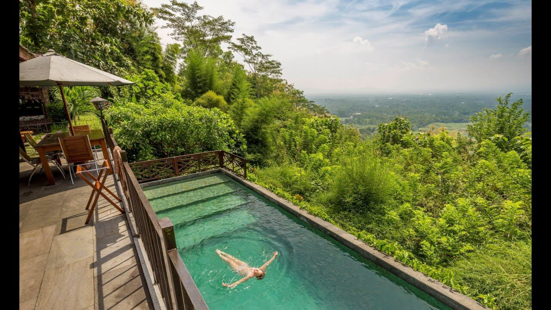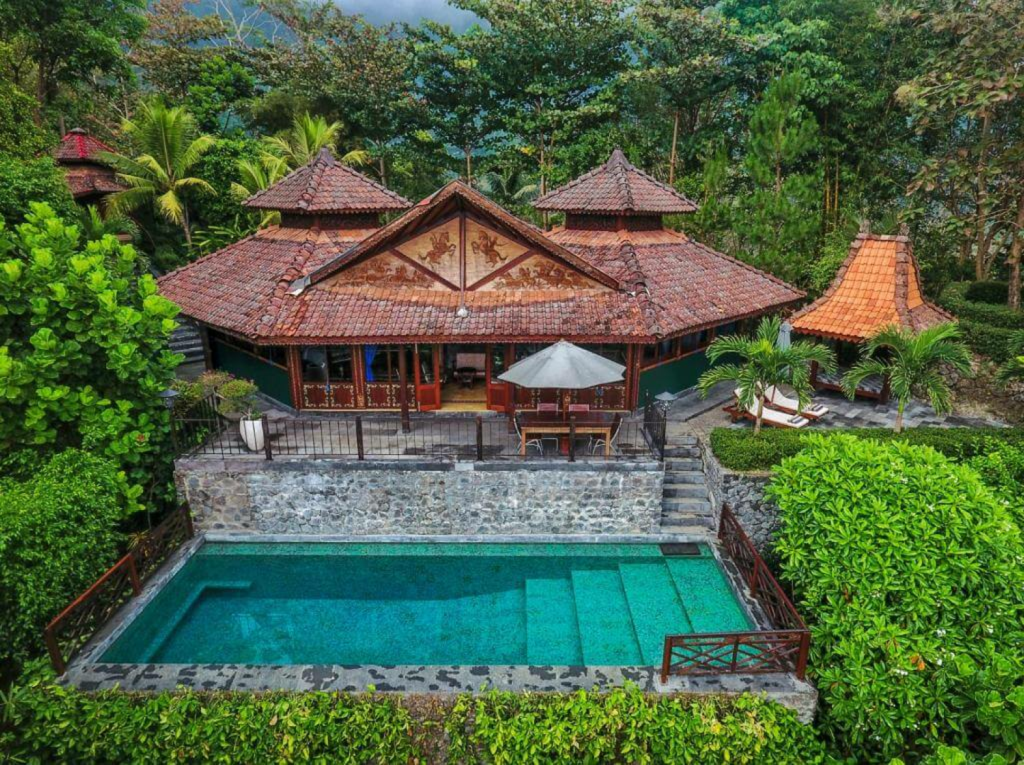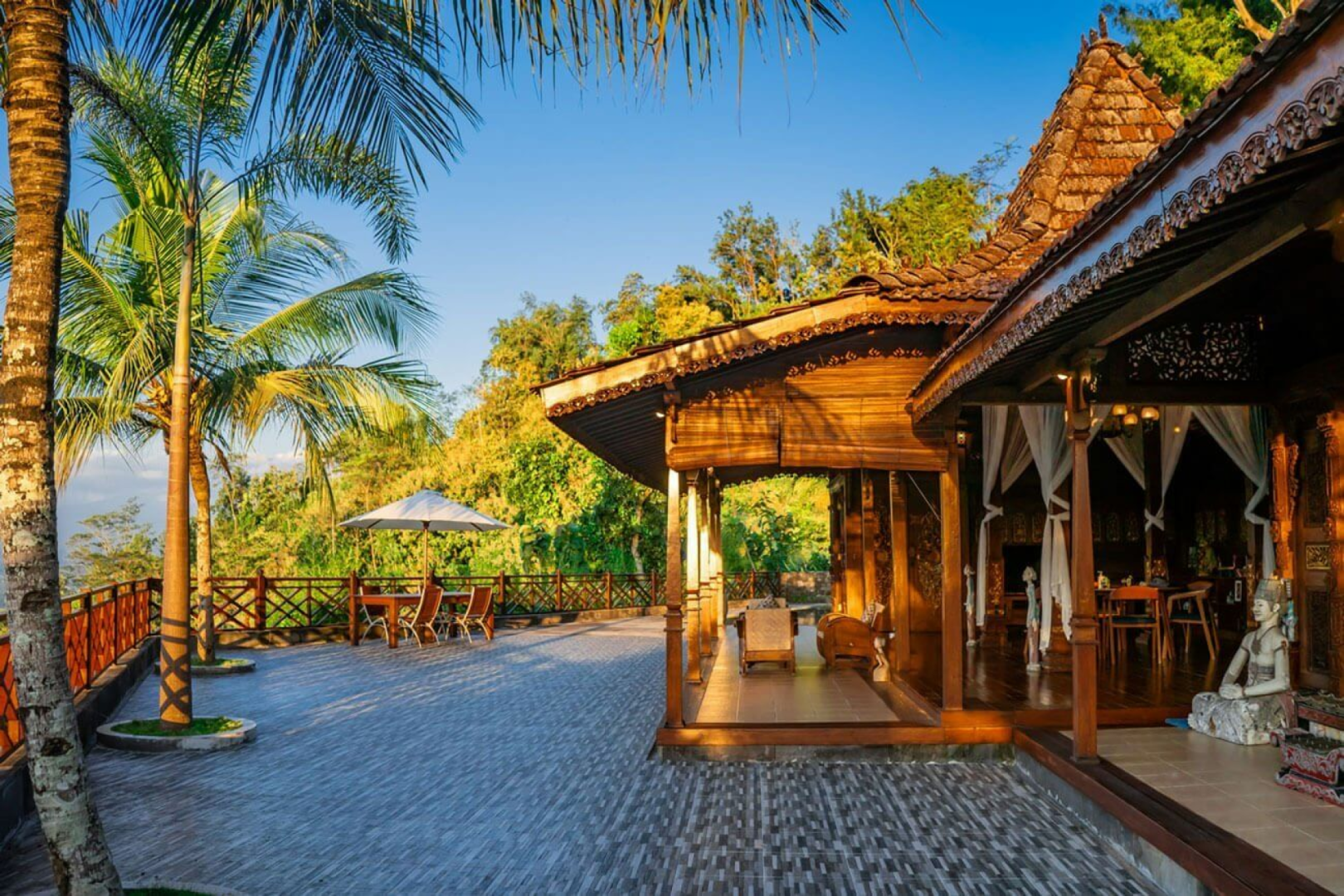 Es erwartet Dich eine ganz private Villa mit Blick auf die Vulkane von Yogyakarta, den Borobudur-Tempel und die charmanten Dörfer der Region. Die Villen sind alle unterschiedlich, aber alle sind wunderschön, offen gestaltet, mit schönen Holzschnitzereien im traditionellen javanischen Stil dekoriert, mit einer geschnitzten javanischen Decke und einem großen und spektakulären Badezimmer, inmitten der Natur. Die Villen liegen auf einem Hügel, umgeben von üppigem Dschungel, und bieten einen herrlichen Blick auf den Borobudur-Tempel.