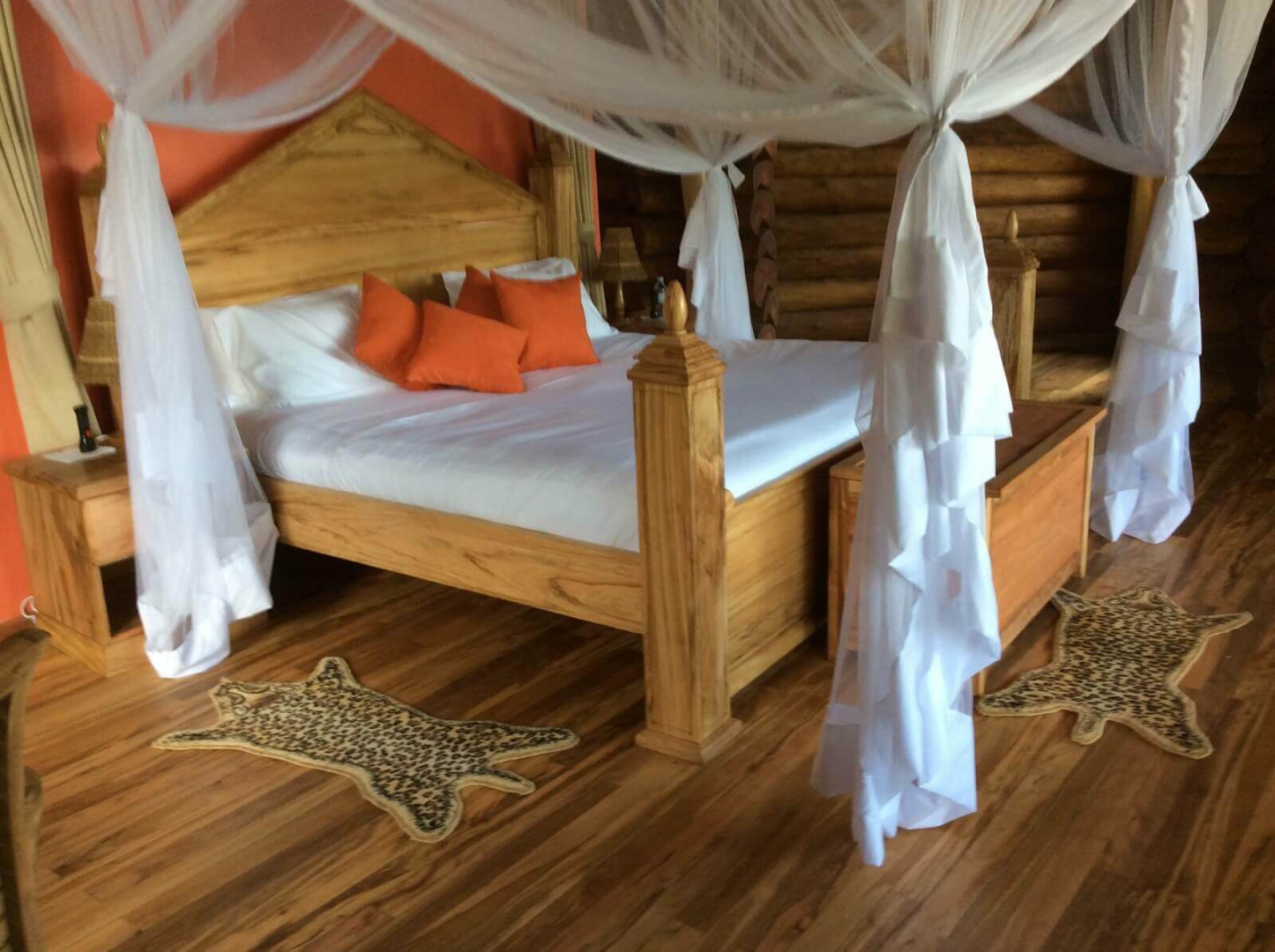 Von hier geht ein Plankweg mit Treppen den Hügel hinunter zu den elf luxuriösen Suiten im gleichen Blockhütten-Stil. Die Zimmer sind sehr komfortabel eingerichtet und haben super geräumige Bäder inklusive Whirlpool-Dusche und einer Terrasse mit Traumausblick auf den Regenwald.