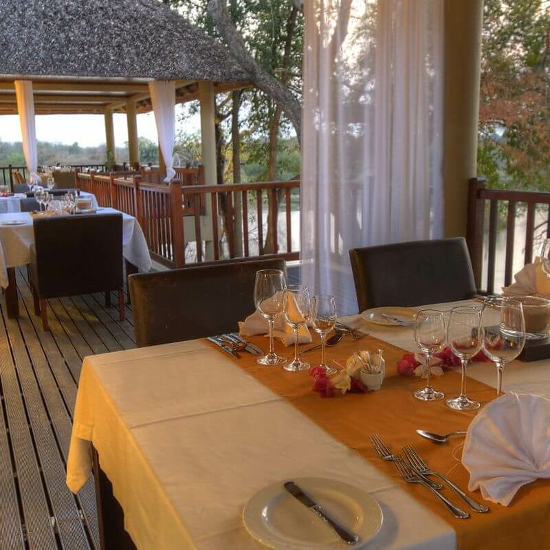 Herzstück der Lodge ist eine große Hauptlodge direkt am Flussufer unter Reetdach mit Lounge und Souvenirladen. Eine lange Treppe führt hinunter zur Bar mit bequemen Sitzgelegenheiten und einigen traditionellen Spielen und interessanten Büchern, die auf den Tischen verstreut sind. Hier liegt auch das Restaurant. Draußen auf der Terrasse hat man teilweise einen Blick auf die Stromschnellen flussaufwärts. Die Mahlzeiten werden drinnen als auch im Freien eingenommen.