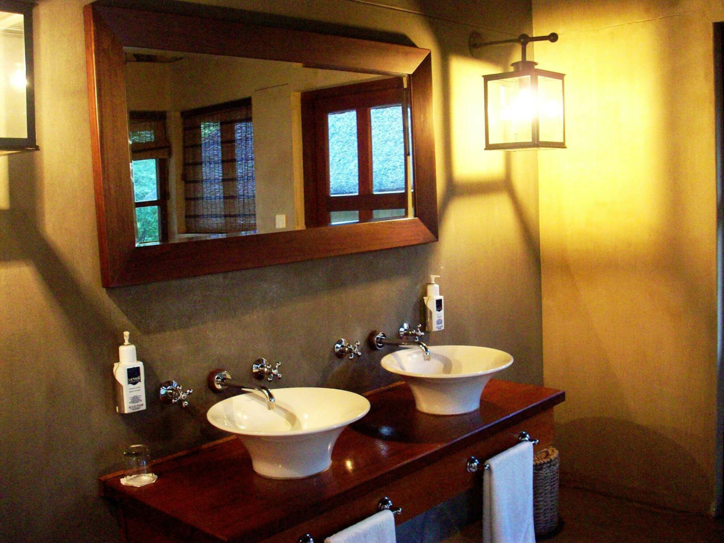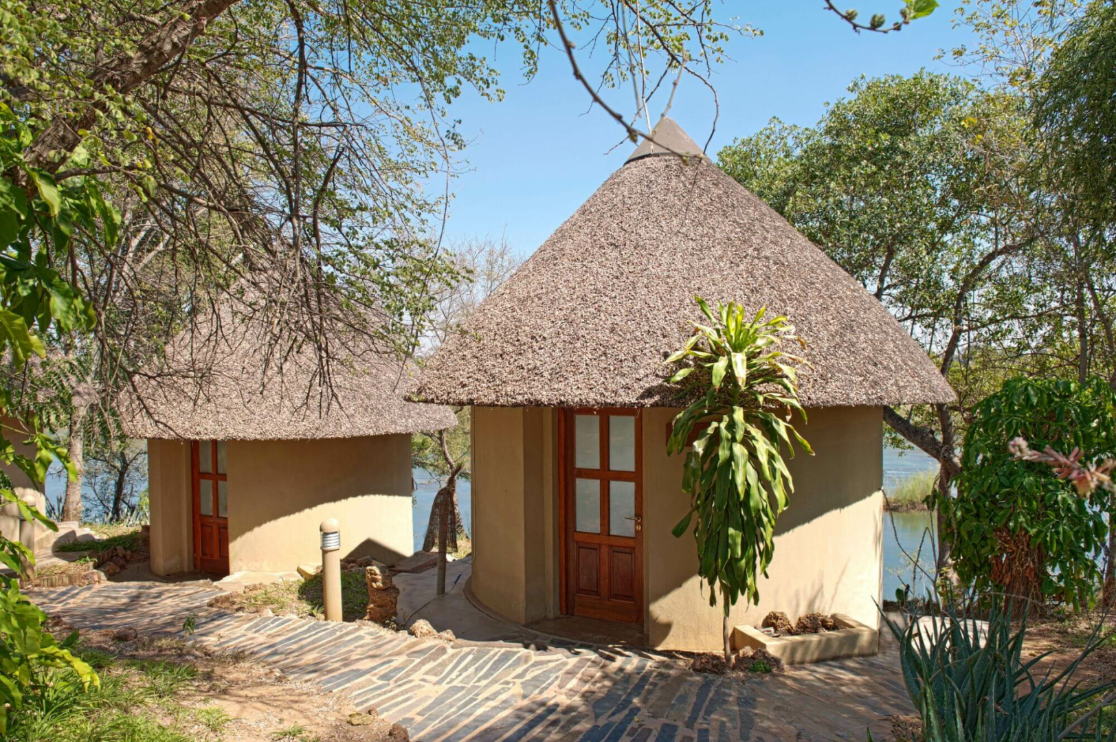 Gäste werden in 20 luftige klimatisierte Chalets mit Strohdach, die über Pflasterwege zu erreichen sind. Diese sind mit Holzschrank, Regale, ein Minikühlschrank, Safe, Großbett sowie Nachttischen und einem Sessel ausgestattet. Vom Schlafzimmer aus führt eine große Tür auf eine private Aussichtsplattform mit zwei schweren Außenstühlen und einem Couchtisch - der perfekte Ort, um die Aussicht auf den Fluss in Ruhe zu genießen. Die Badezimmer sind groß und mit zwei Waschbecken, frei stehender Badewanne und einem großen Panoramafenster ausgestattet. Die Inneneinrichtung ist dezent und unauffällig, die Möbel sind in neutralen Sandtönen gehalten, die durch ein oder zwei orangefarbene "Akzente" aufgelockert werden.