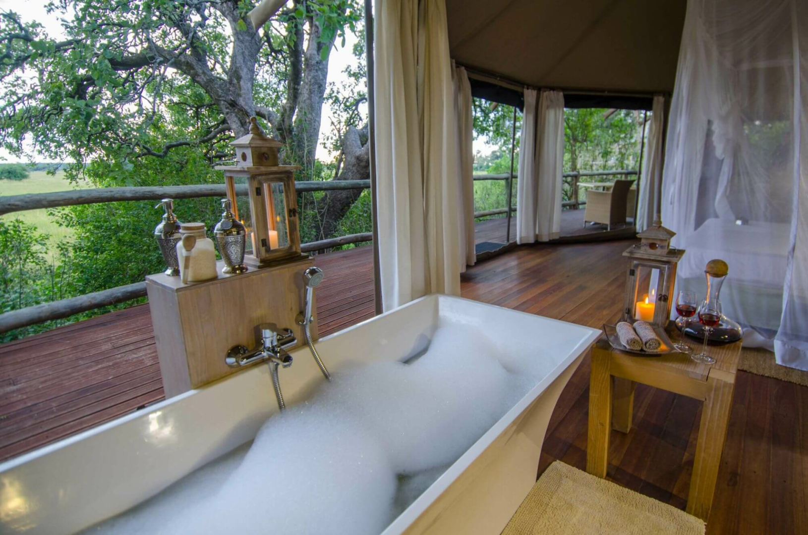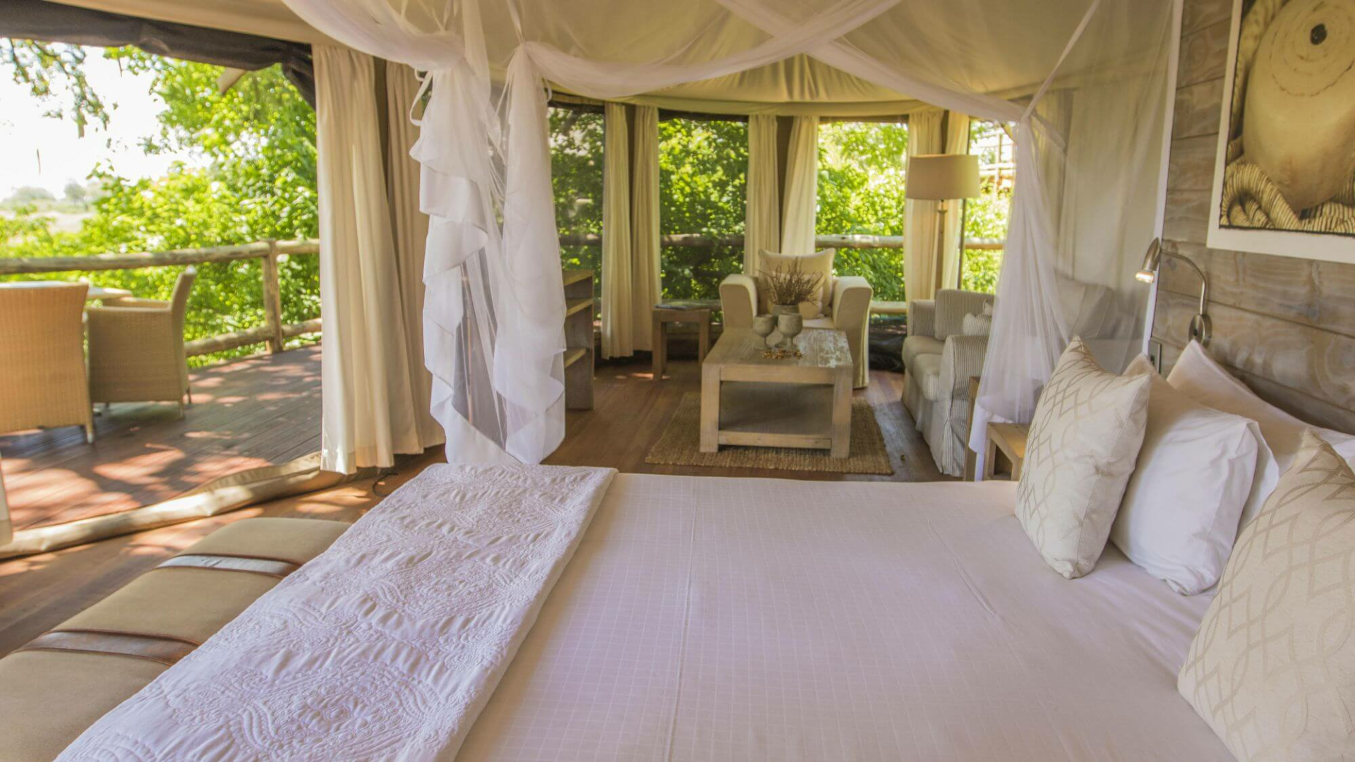 Vielleicht kommt eine Elefantenfamilie direkt bis zur Zelttür, um ihren Hunger an den Bäumen zu stillen. Ein Ort zum Verwöhnen und Entspannen, der sich als Pause einer anstrengenden Safari gut eignet.