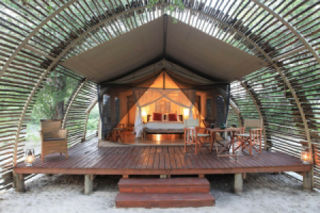 Von den beiden im Kalahari Game Reserve bestehende Camps ist das Tau Pan, 2009 gebaut, das vielleicht komfortabelste. Dabei handelt es sich um eher eine Lodge als ein Camp, mit großzügigen elegant dekorierten öffentlichen Bereichen, einen Pool und neun auf dem Boden errichteten Chalets mit Inn...