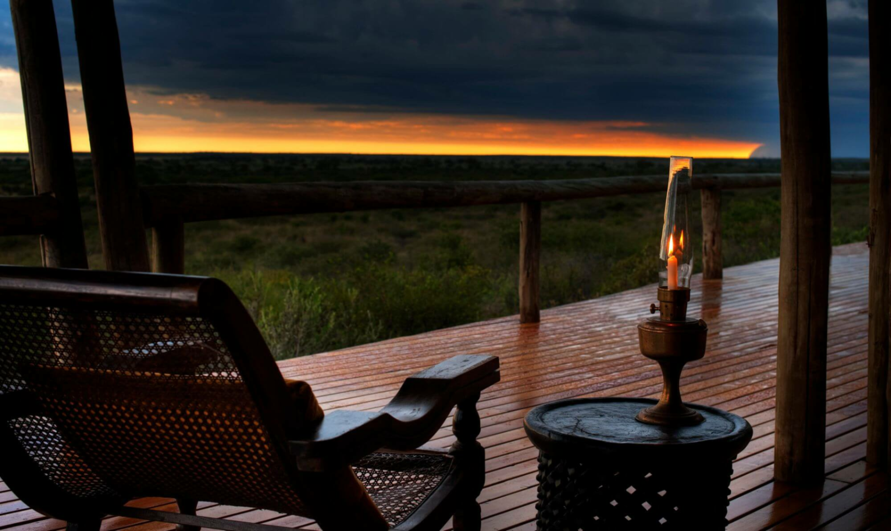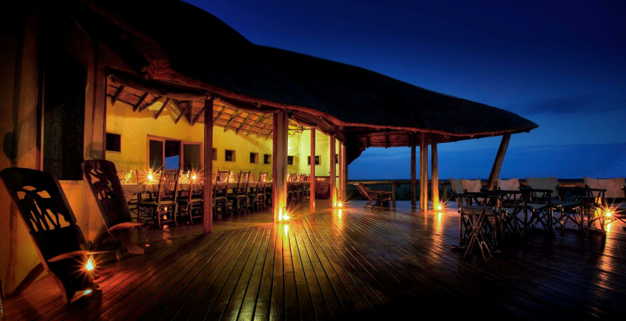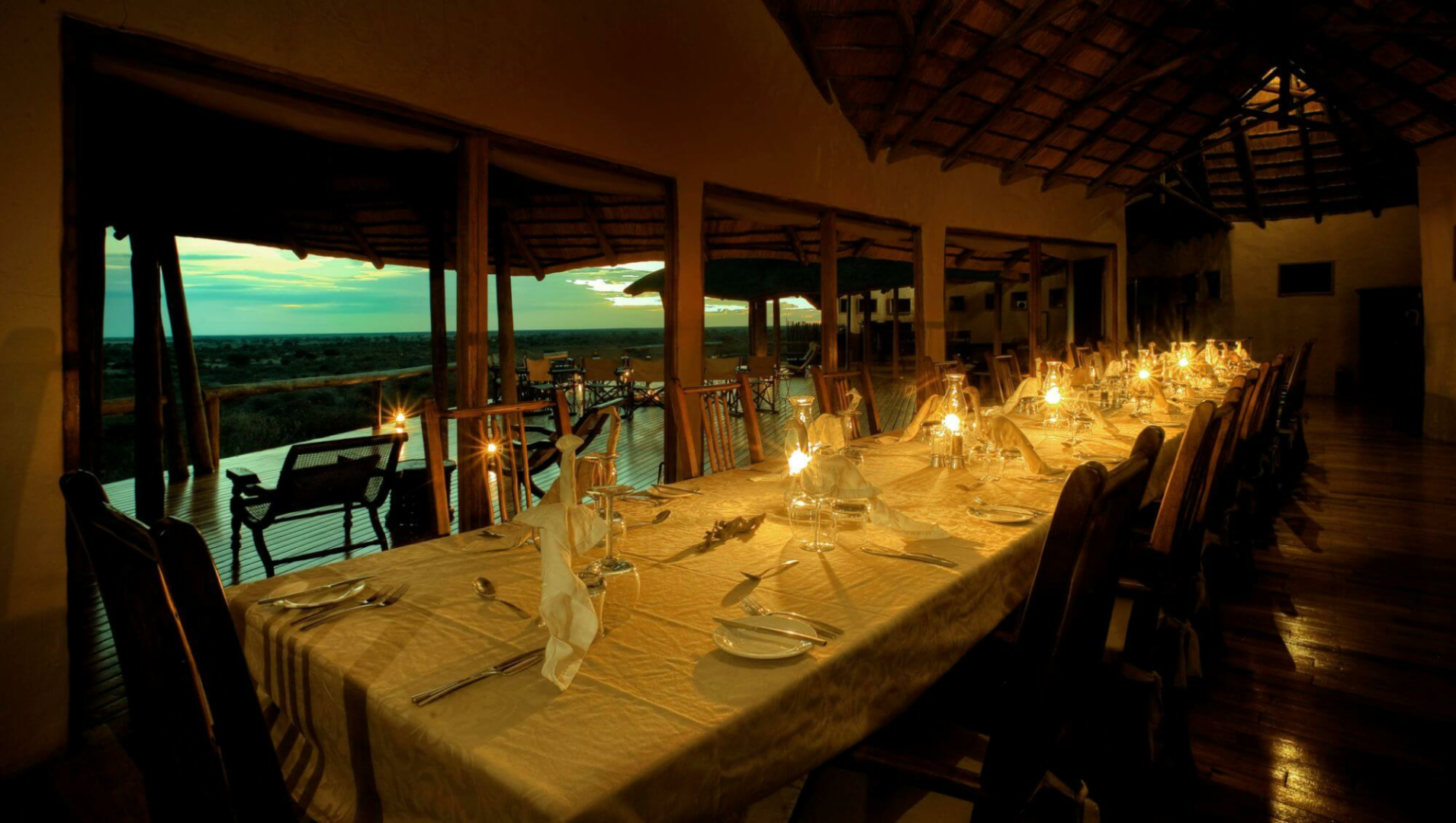 Durch die erhöhte Lage der Lodge auf einer Erhebung direkt am Rande der Tau-Salzpfanne ist ein Panoramablick auf die atemberaubende Kalahari-Landschaft von fast überall garantiert. Ein nah gelegenes Wasserloch zieht gelegenlich Tiere an.