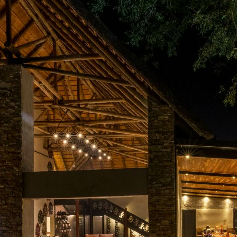 Der Zugang erfolgt über ein Empfangsgebäude, das zur Haupt-Boma führt: ein robustes, offenes Gebäude in eleganter Grau-Farbe, das sich nach vorn öffnet und einen ungehinderten Blick auf die Gärten und den Fluss Ferne bietet. Die Lage an der Hauptstraße ist überhaupt nicht störend, da die Lodge hinüber zur Lodge gebaut wurde.