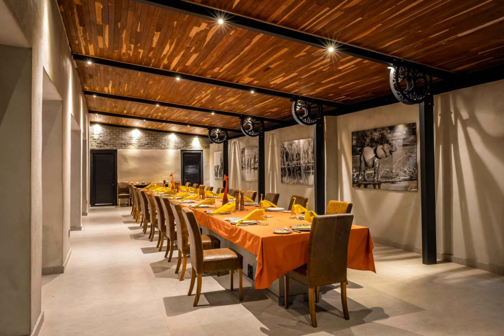 Auf der linken Seite befindet sich ein langer Tisch, an dem die gemeinsamen Mahlzeiten (Frühstück und Abendessen) serviert werden. Dahinter befindet sich die Bar und eine kleine Tee- und Kaffeestation, an der man sich vor Beginn der Nachmittagssafari erfrischen kann.