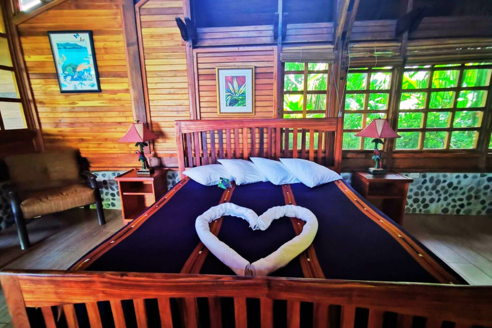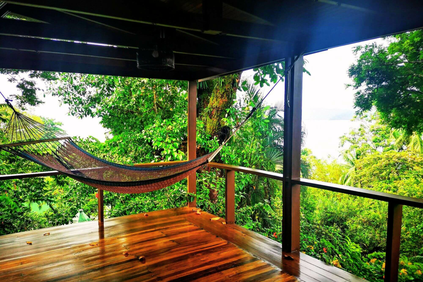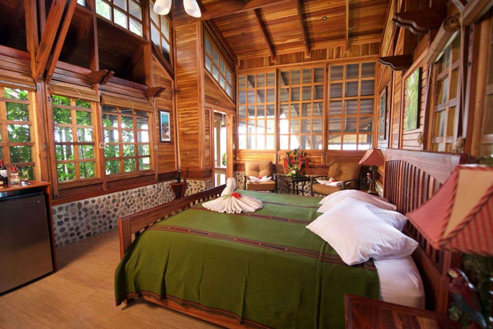 Diese Öko-Lodge ist perfekt integriert in die Natur der Region und diese ist atemberaubend. Das Gelände der Lodge ist spektakulär und wimmelt von wilden Tieren. Es gibt Bugalows unterschiedlicher Kategorien und jeder hat hohe Decken, Deckenventilatoren, bequeme Betten, eine Dusche mit Geräuschkulisse und Blick in den Dschungel sowie eine große Veranda mit Bäumen direkt davor, auf der es jede Menge Affen und Wildtiere zu sehen gibt (Kolibris, Tukane, Leguane, Klammeraffen und weiße Kapuzineräffchen.)