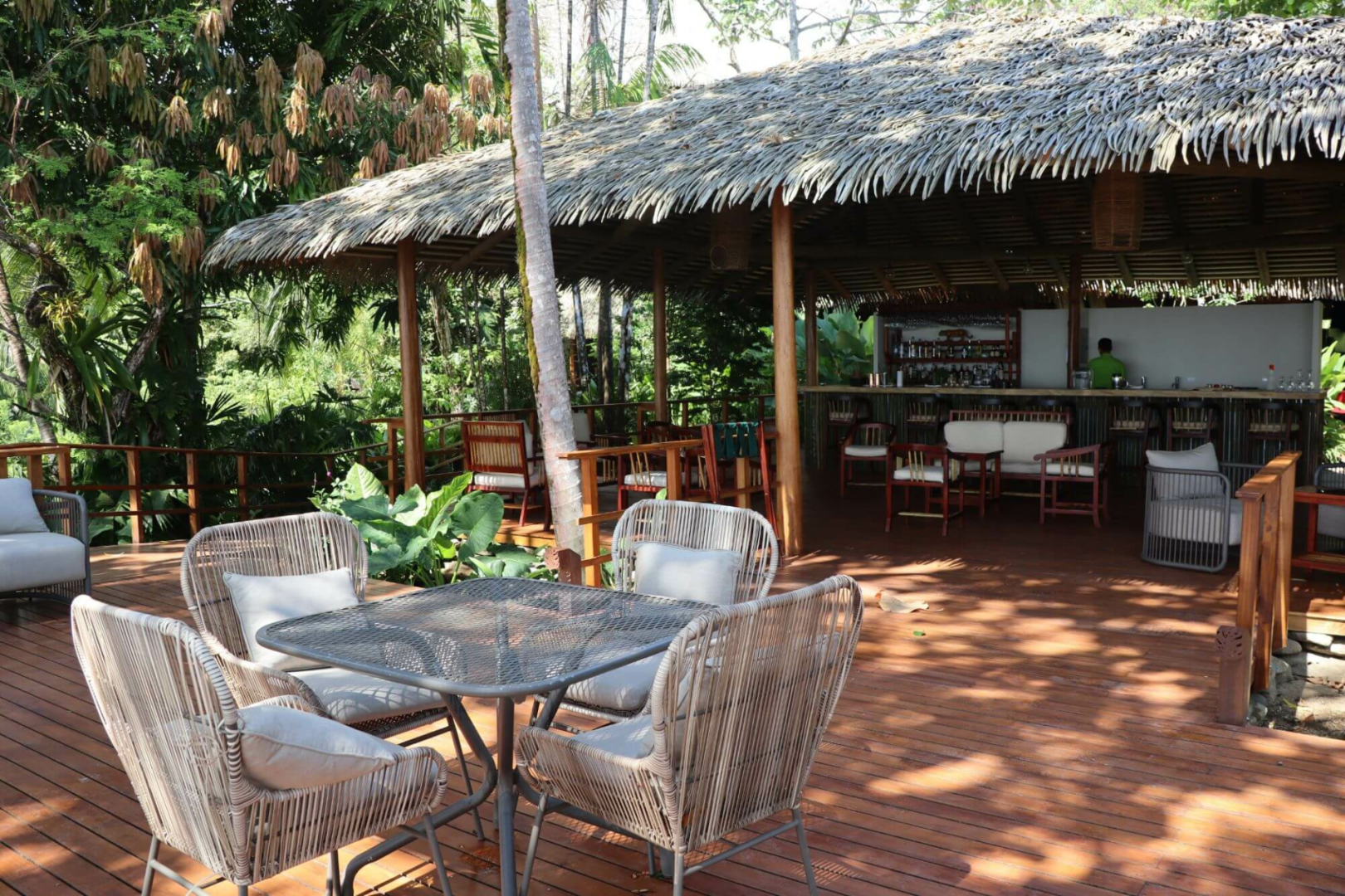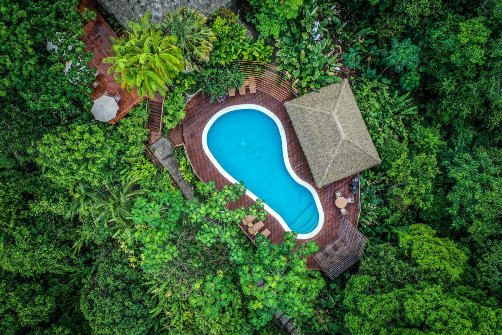 Es gibt auch einen Gemeinschaftspool, der ein beliebter Aufenthaltsort für Gäste und Wildtiere ist, da er regelmäßig von Tukanen und Lapas (Aras) mit herum hüpfenden Totenkopfäffchen gestreift wird. Die Ess- und Barbereiche sind wunderschön und das Essen ist absolut unglaublich. Die Mahlzeiten, die im Hauptrestaurant serviert werden, sind, gelinde gesagt, exquisit und basieren auf lokal angebauten Bio-Zutaten. Der schönste Strand, den man sich vorstellen kann, ist etwa 15 Minuten entfernt und ein Abholservice erspart Ihnen den Weg zurück zur Lodge.
