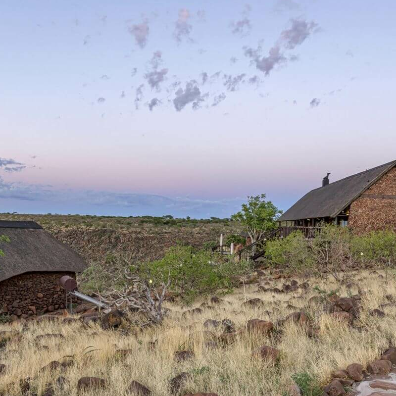 Die zwölf Bungalows, aus Naturstein erbaut und strohgedeckt, fügen sich harmonisch in die Landschaft ein und sind mit schlichter Eleganz eingerichtet. Jede Hütte hat einen Balkon mit Canyonblick, und nachts ist kein besserer Platz vorstellbar, um zu den Sternen zu schauen. Sowohl vom Hauptgebäude mit Restaurant und Bar als auch von den Bungalows ist der Blick im wahrsten Sinne des Wortes atemberaubend – die Weite und ungezügelte Schönheit des Damaralandes werden zu einem echten Erlebnis. Die Lodge wird in Zusammenarbeit mit der einheimischen Bevölkerung betrieben.
