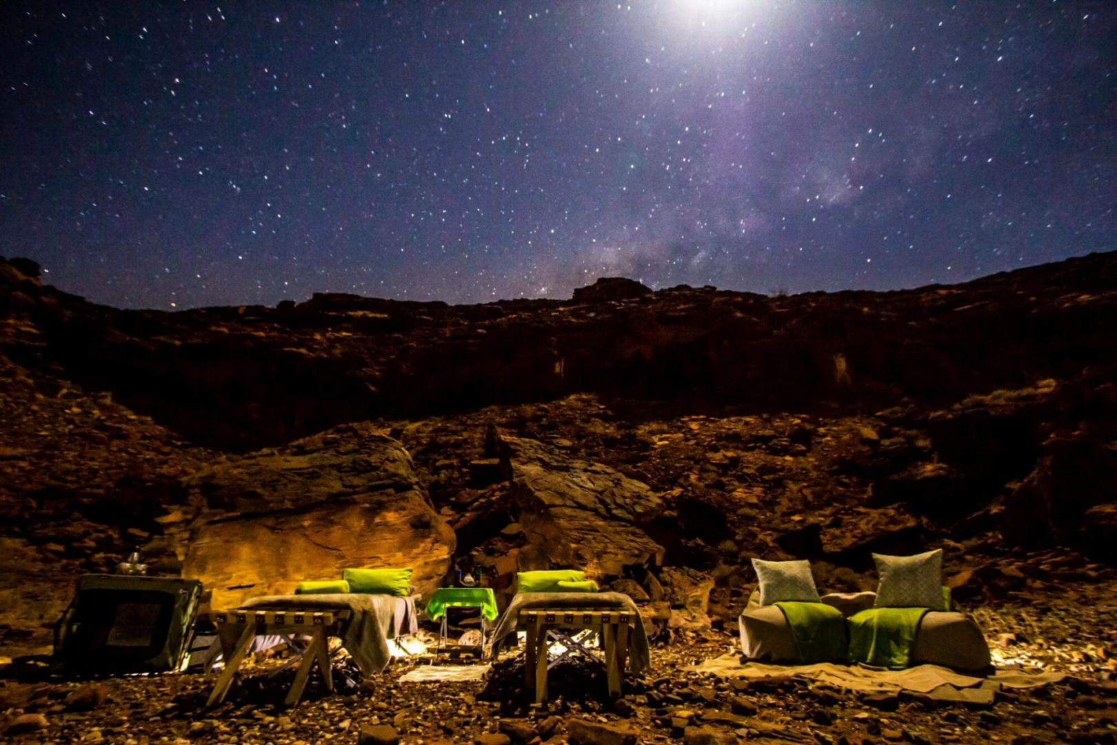 Alles im Huab under Canvas dreht sich um das Aufspüren von Nashörnern zu Fuß, ein unbeschreibliches Erlebnis, das für Gänsehaut sorgt. Pirschfahrten auf der Suche von Wüstenelefanten, Wanderungen und Ausflüge zur den Felsenmalereien werden auch angeboten.