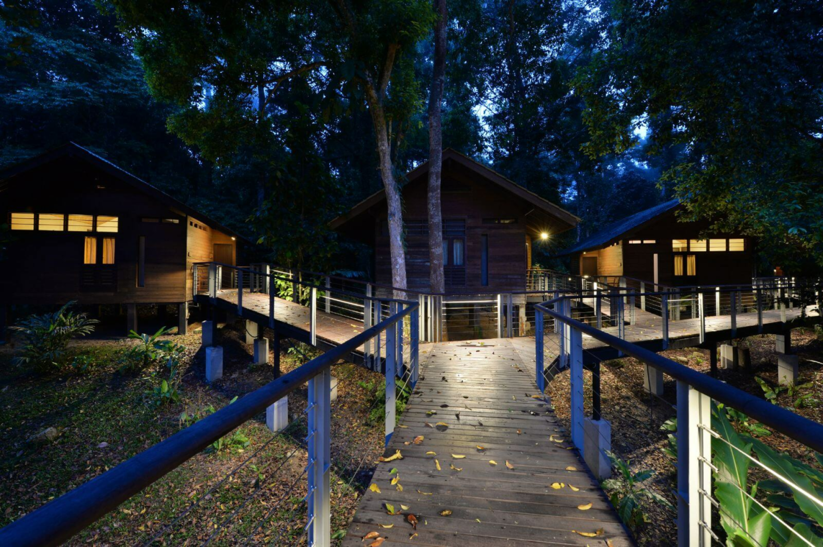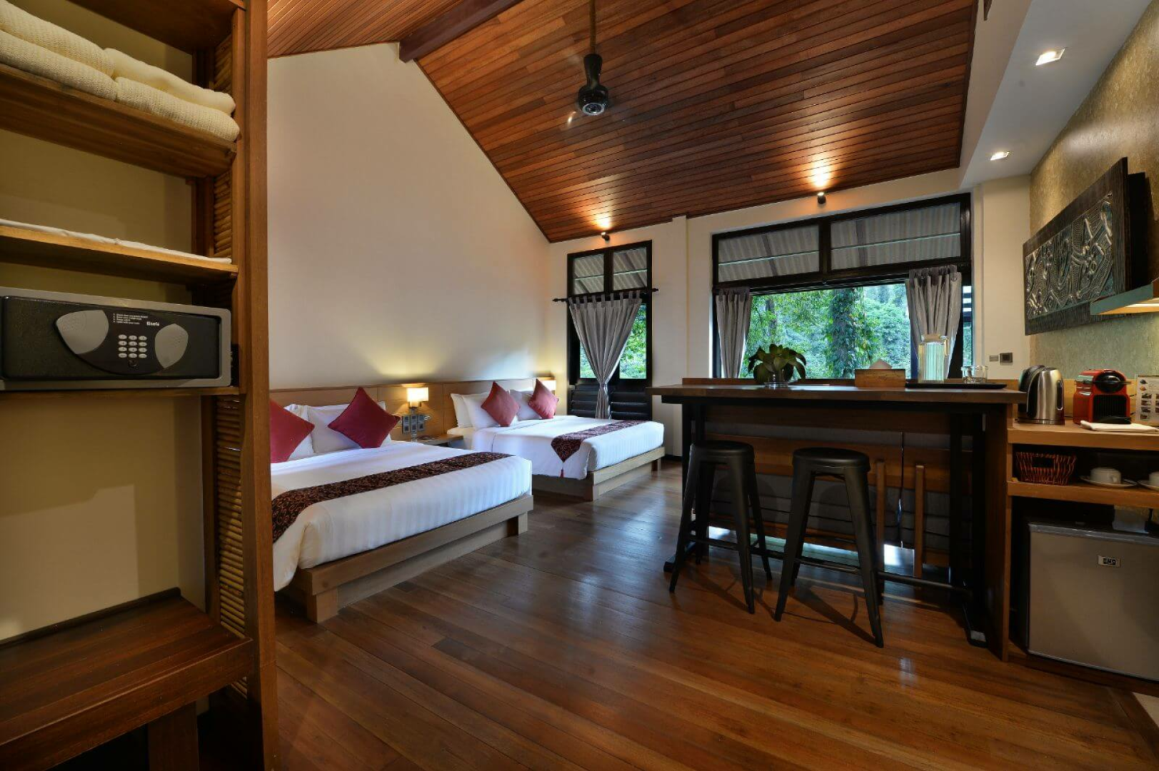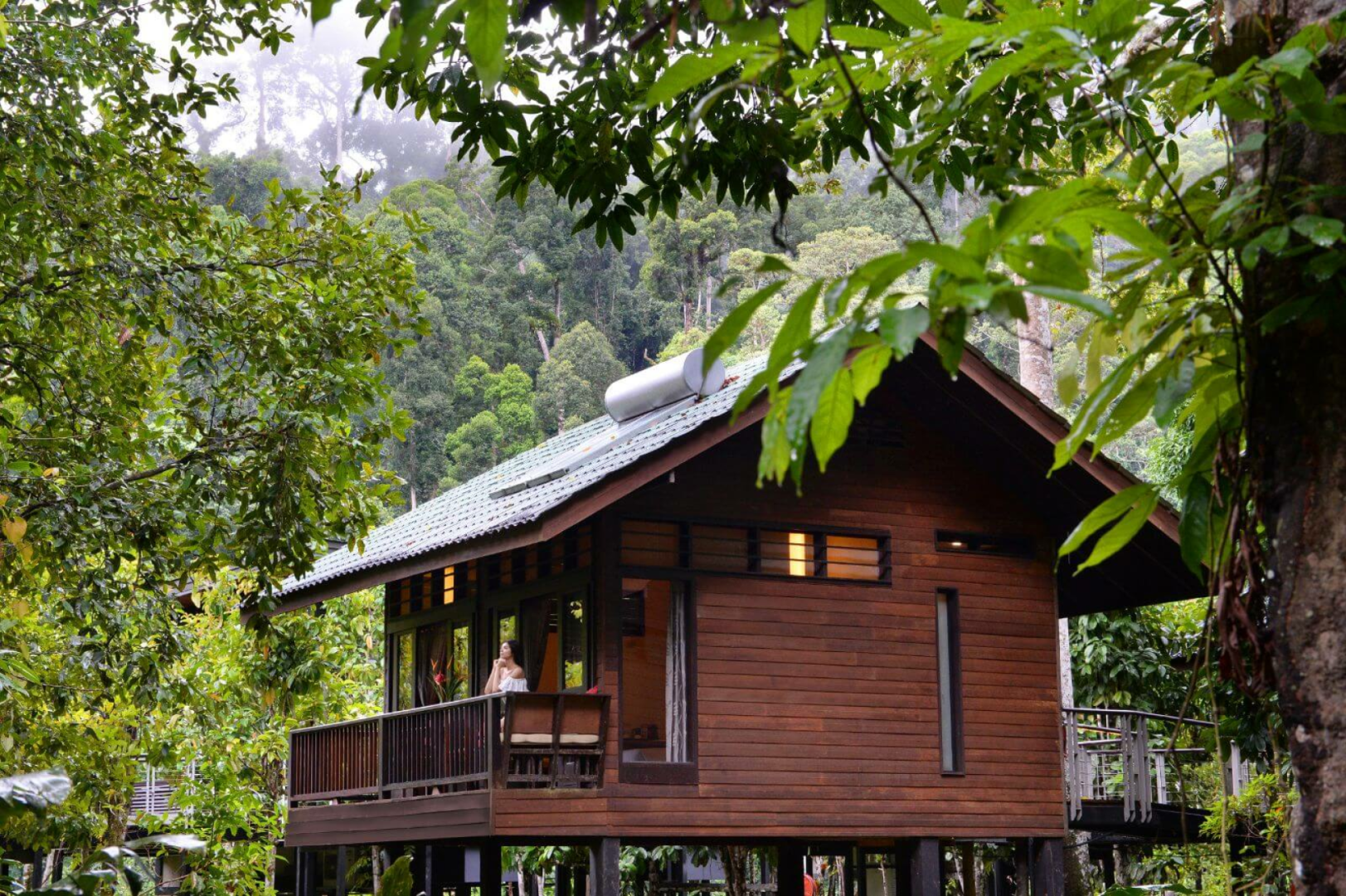 Der Komplex besteht aus insgesamt 23 Holz-Chalets zwei verschiedener Kategorien, die sich auf Stelzen über den Boden erheben und Platz für jeweils zwei Wohneinheiten bieten. Die etwas besseren Deluxe-Zimmer sind größer, blicken auf den Fluss und sind mit einem Outdoor-Whirlpool ausgestattet.