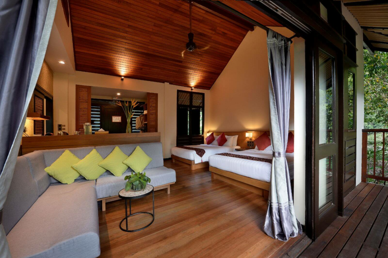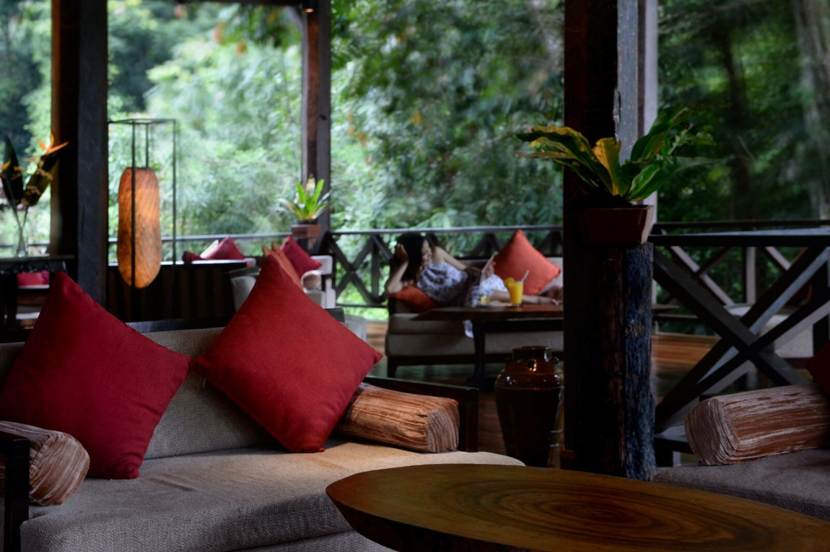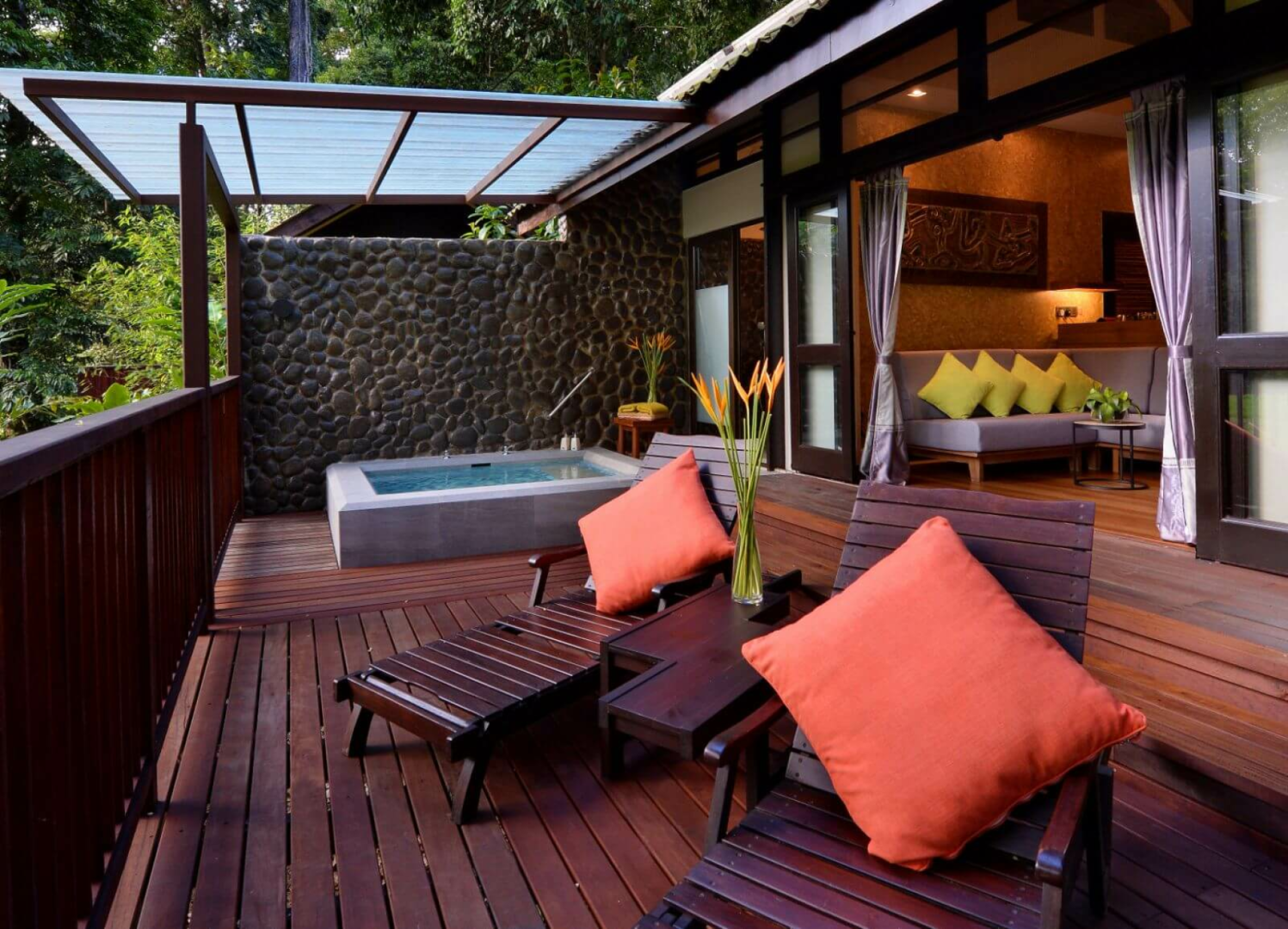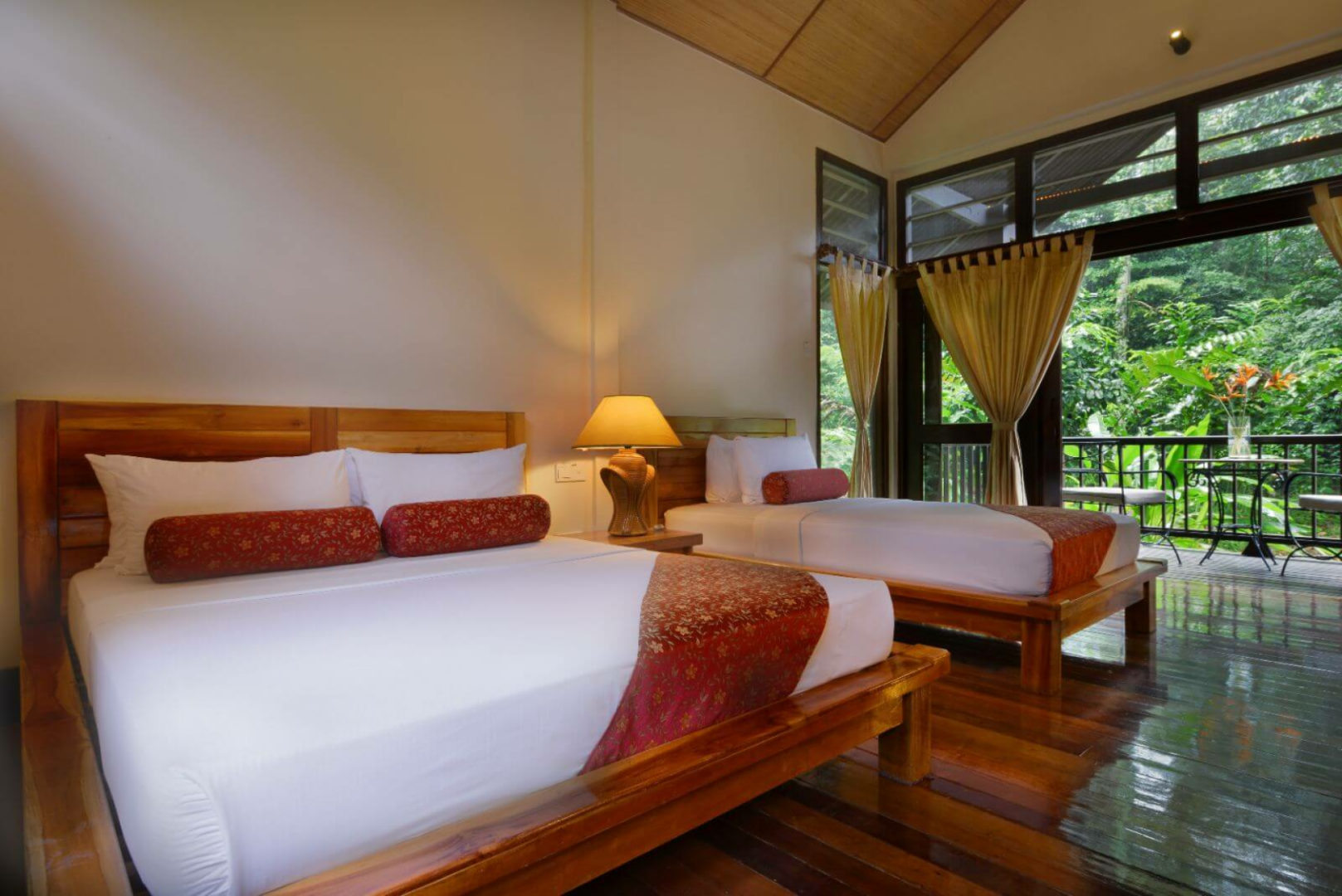 Der Komplex besteht aus insgesamt 23 Holz-Chalets zwei verschiedener Kategorien, die sich auf Stelzen über den Boden erheben und Platz für jeweils zwei Wohneinheiten bieten. Die etwas besseren Deluxe-Zimmer sind größer, blicken auf den Fluss und sind mit einem Outdoor-Whirlpool ausgestattet.