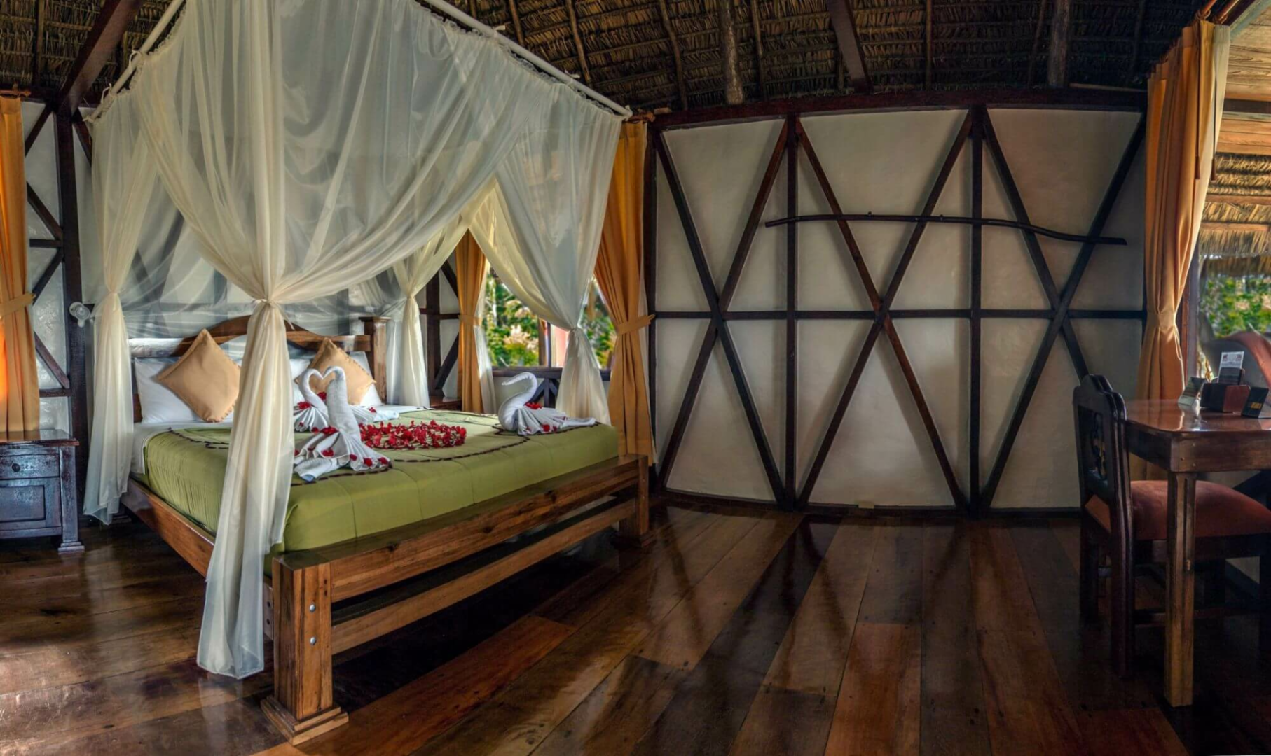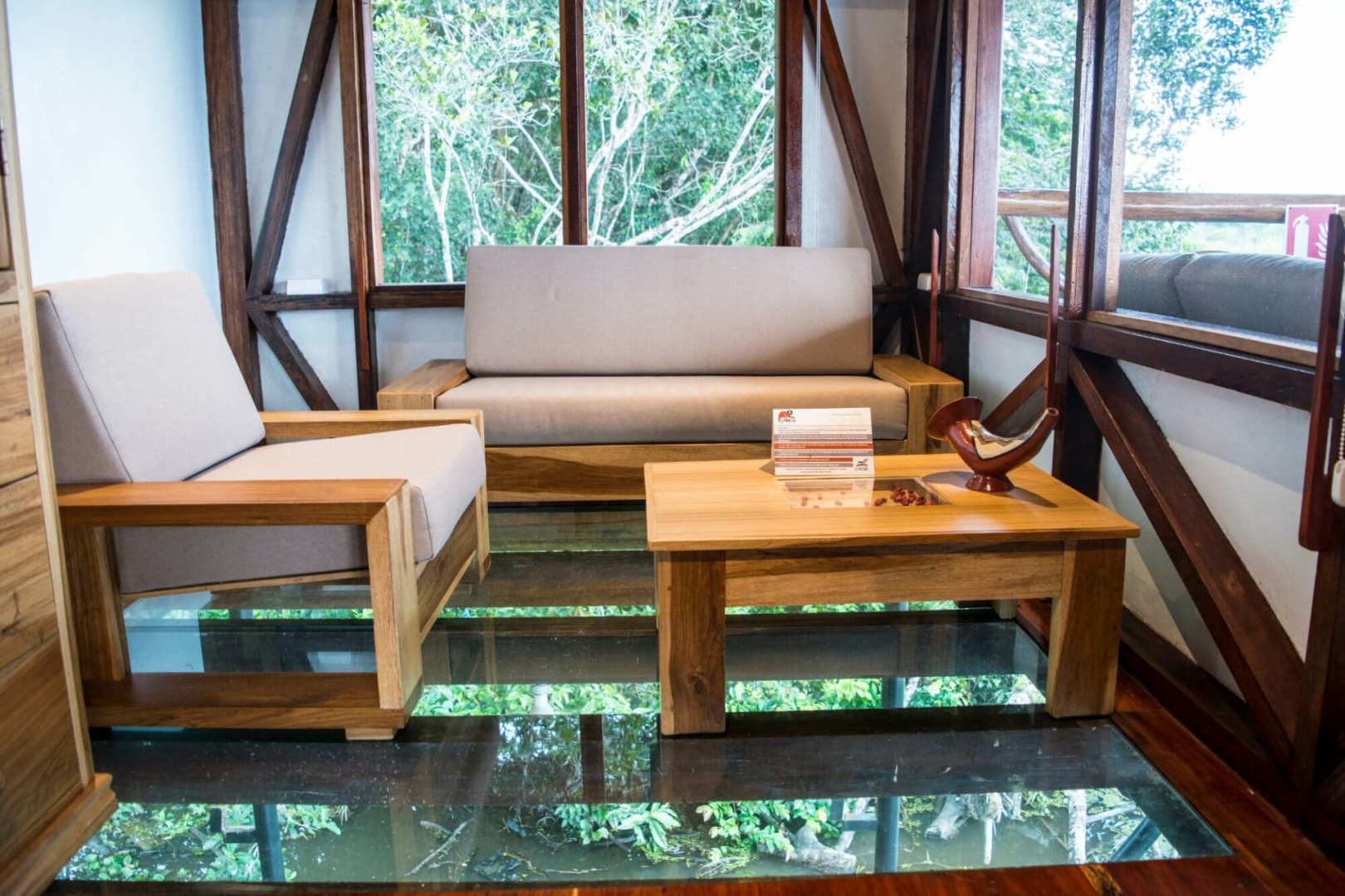 Die Lodge selbst besteht aus einer Hauptlodge, einem unglaublichen Bauwerk unter einem beeindruckenden siebenstöckigen Dach, in dem sich der Speisesaal, eine Bar und eine Lounge/Bibliothek zum Lesen befinden. Im obersten Stockwerk des Daches befindet sich der Aussichtsturm, ein unglaublicher Ort, der aus 15 Metern Höhe einen 360-Grad-Blick auf die Umgebung bietet.