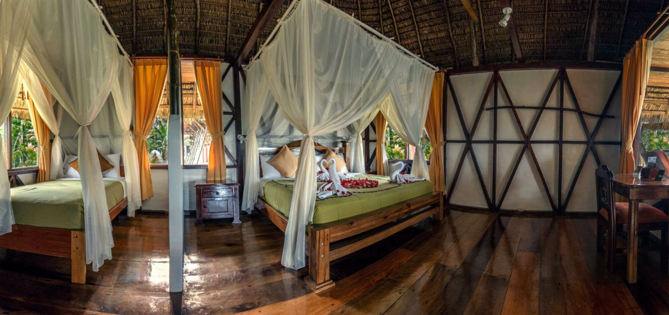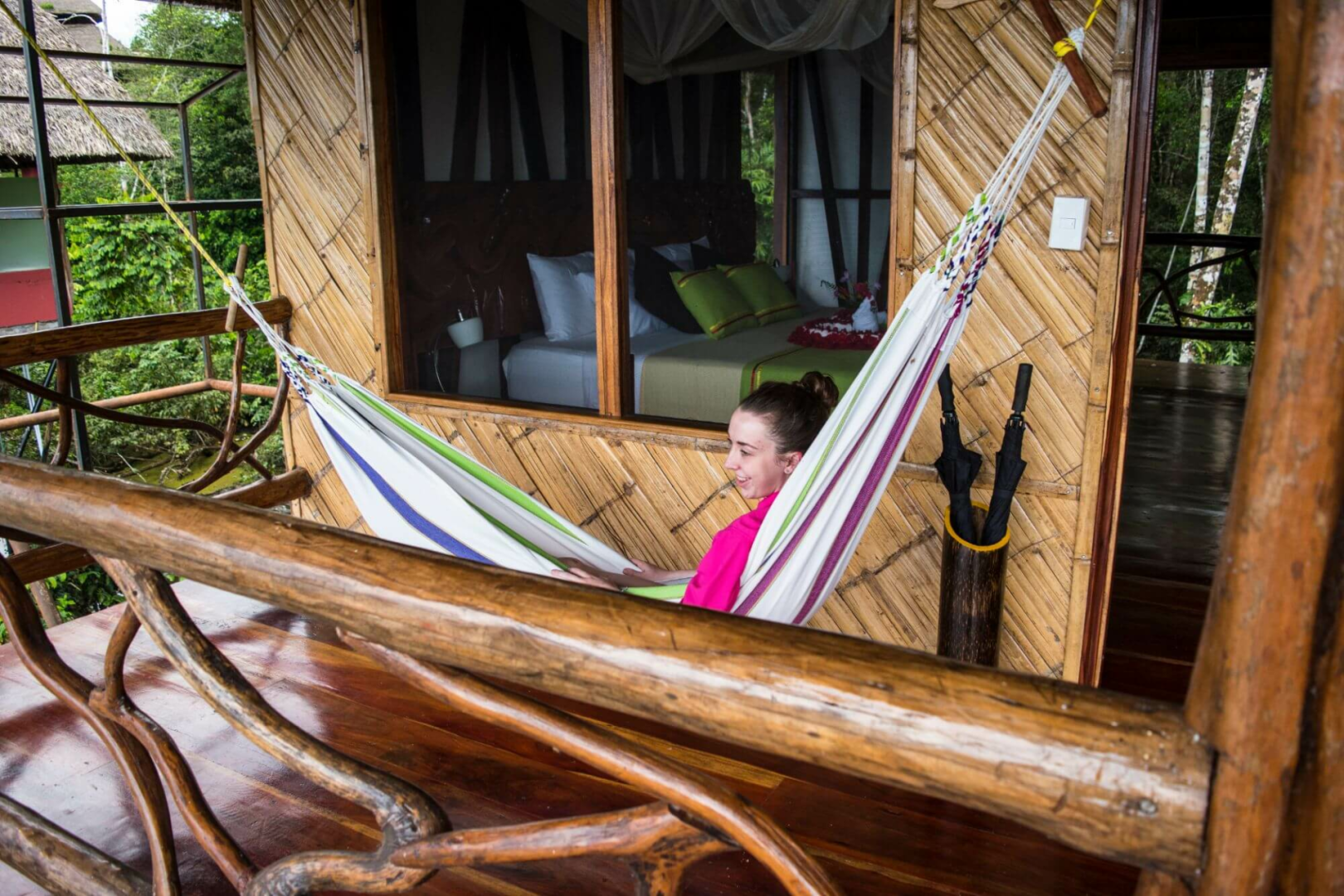 Die Bamboo Eco Lodge befindet sich im Cuyabeno-Reservat, in einem tropischen Waldgebiet mit saisonalen Lagunen und Wasserkanälen. Die Lodge ist aus lokalem Holz und Palmendächern gebaut und steht auf Stelzen.