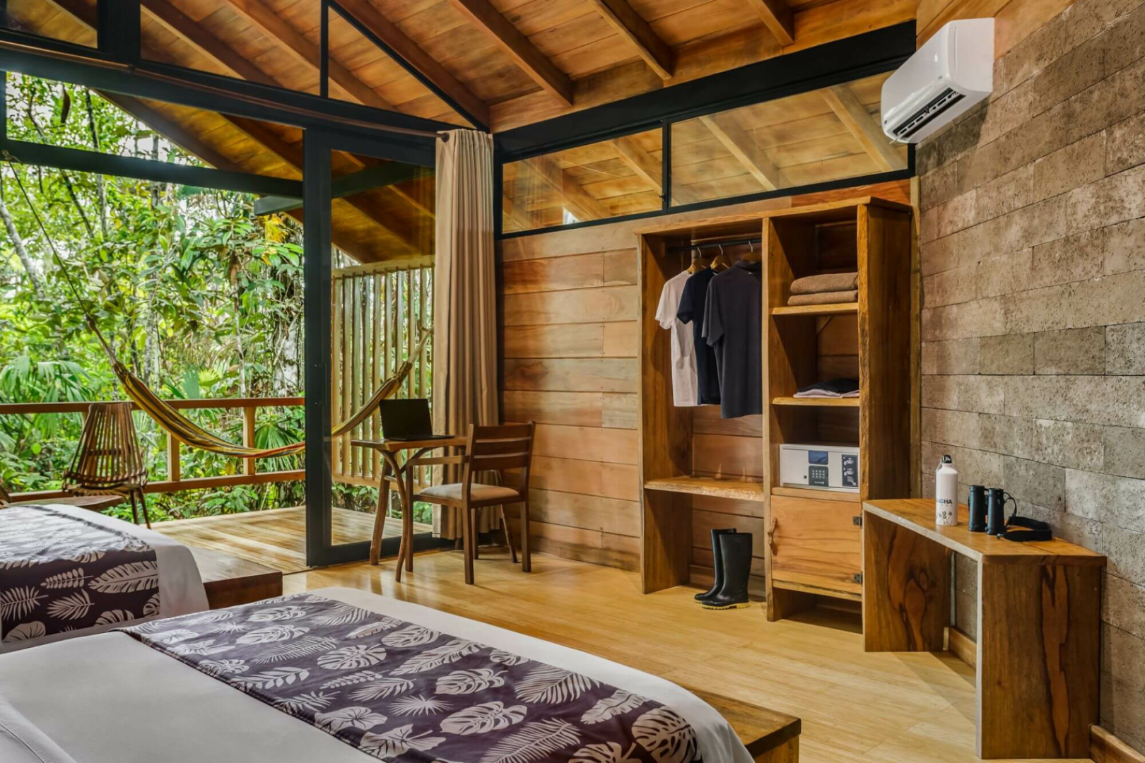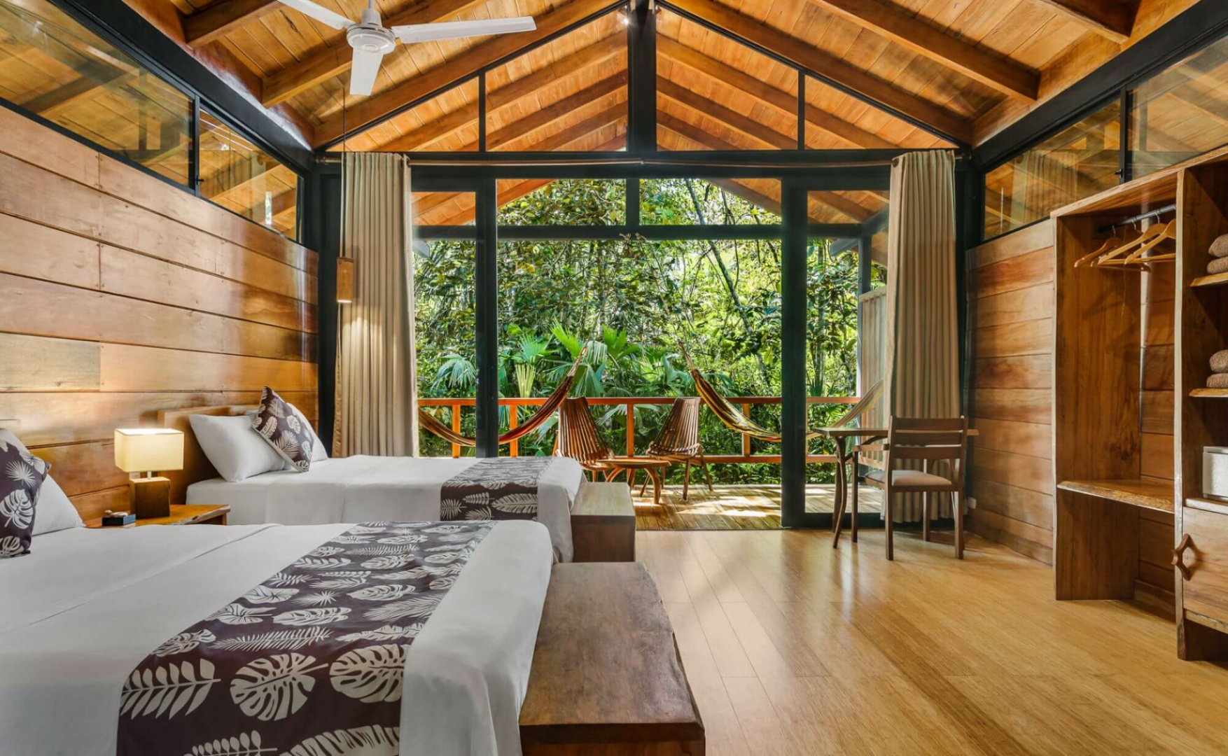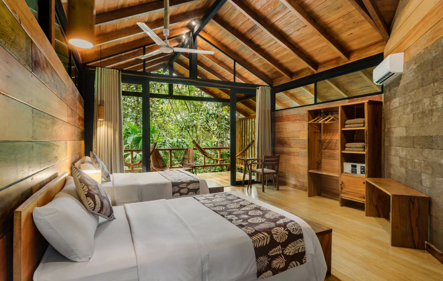 Terrasse. Für deinen Komfort sind Deckenventilatoren über den Doppelbetten angebracht und alle Cabanas sind mit einem Insektenschutz ausgestattet. Die Einrichtung ist einfach, aber die Cabanas fügen sich harmonisch in die Umgebung des Regenwaldes ein und schaffen ein Dschungel-Ambiente. Alle Bungalows verfügen über ein eigenes Bad mit Spültoilette und Warmwasserdusche. Hängematten stehen ebenfalls zur Verfügung und bieten die perfekte Möglichkeit, die natürliche Umgebung zu genießen und nach wilden Tieren Ausschau zu halten!