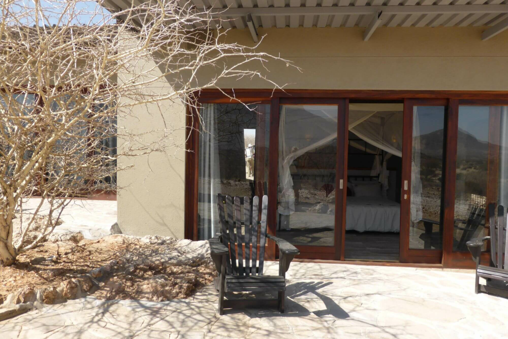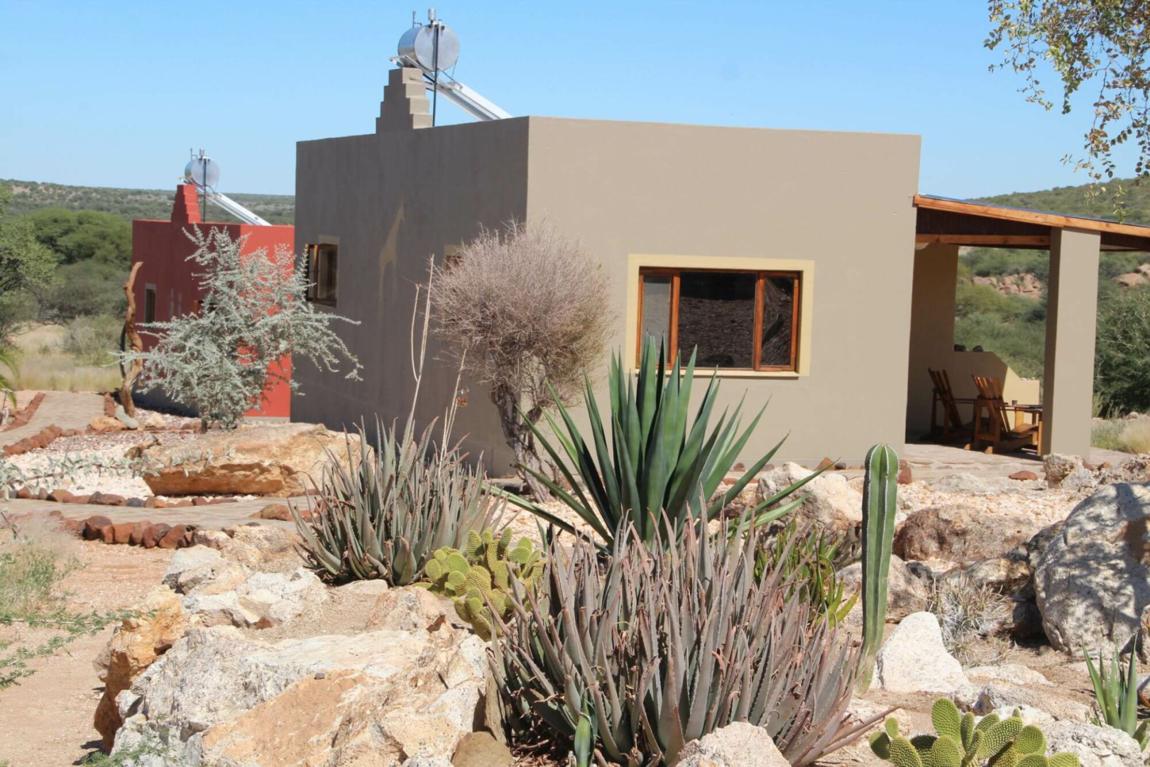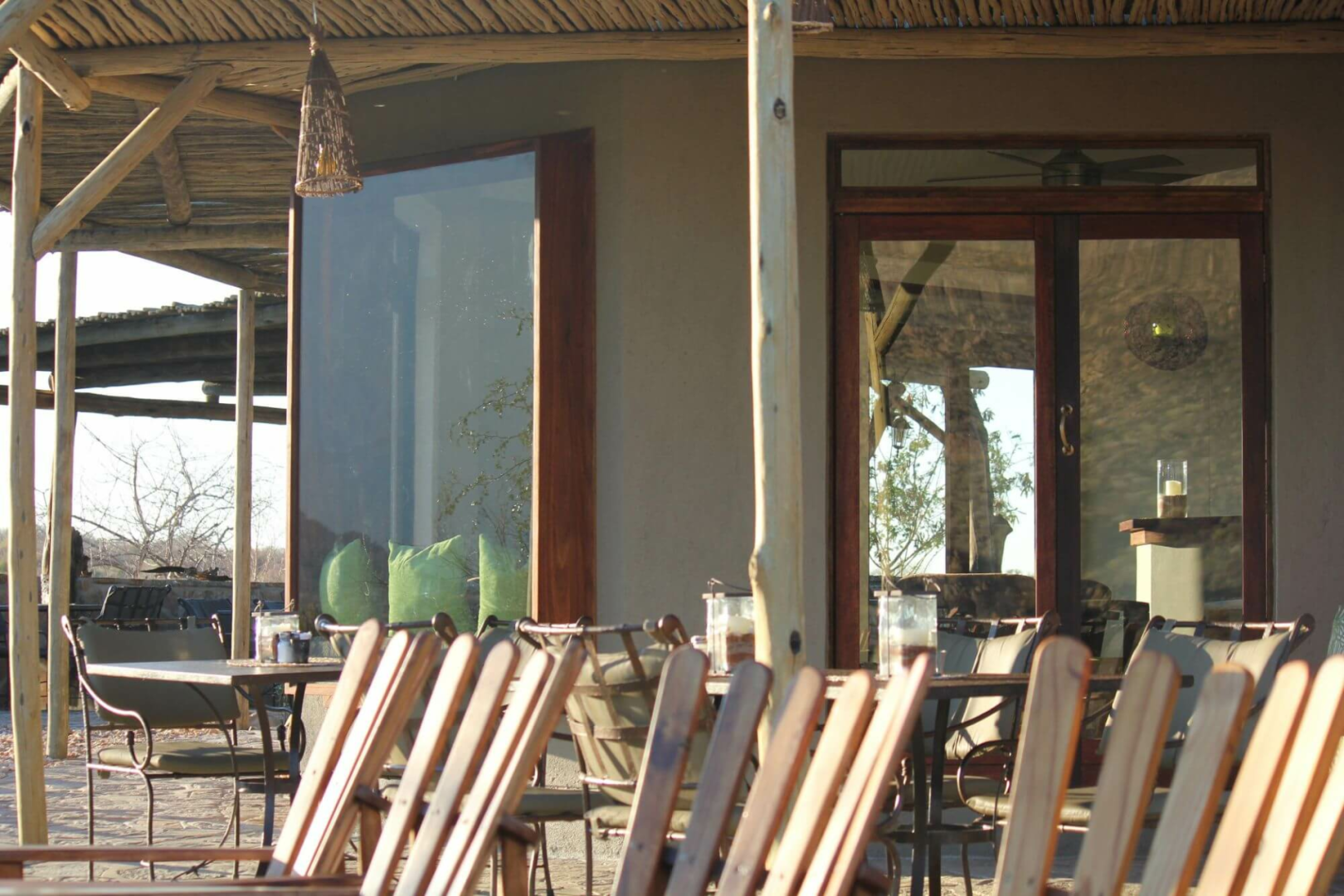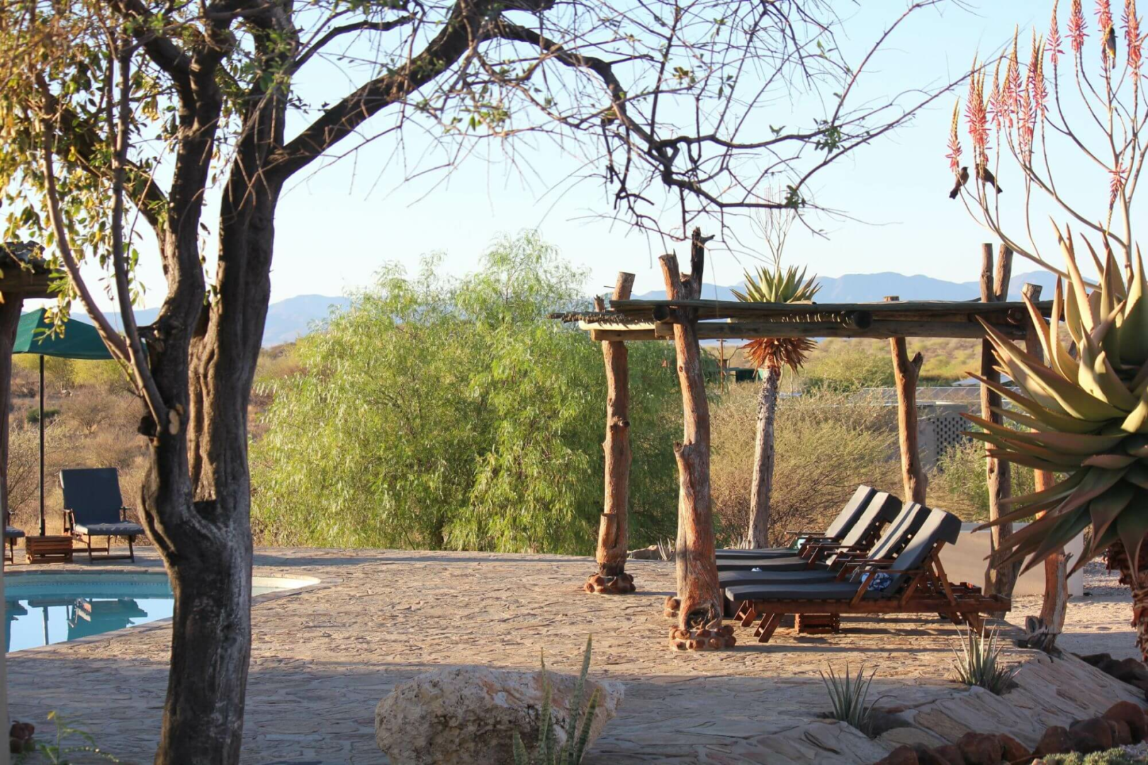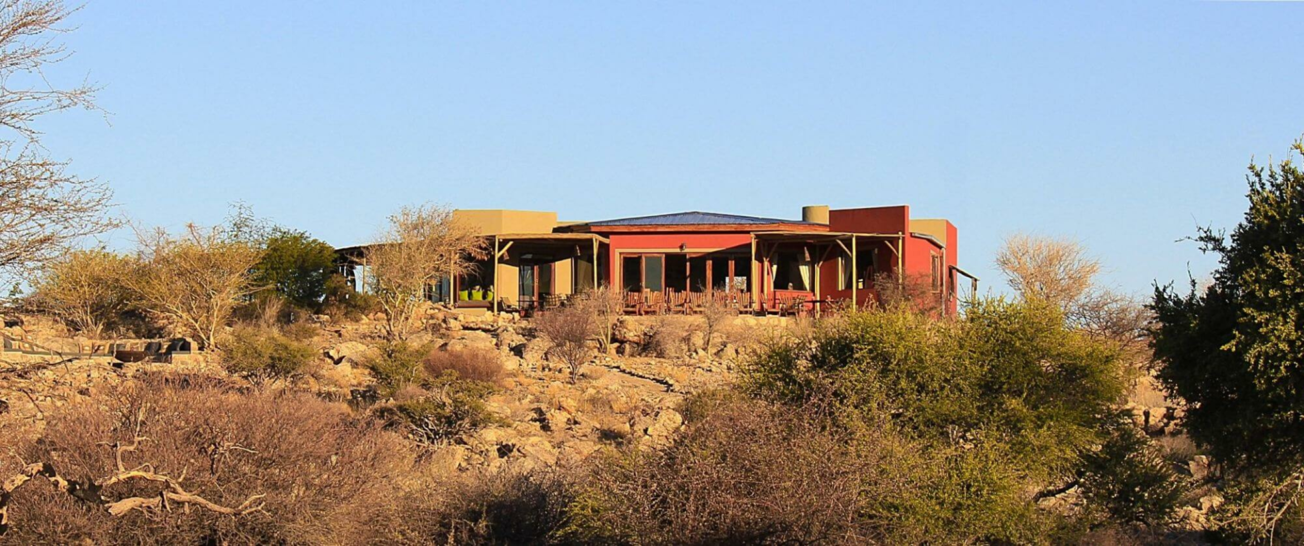 Herzstück der Lodge ist ein umgewandeltes altes Farmhaus mit Restaurant und Lodge. Es gibt auch eine geräumige Terrasse, auf der die Mahlzeiten eingenommen werden, mit Blick auf ein Wasserloch, das von Springboks, Oryxe, Gnus, Strauße und Giraffen regelmäßig besucht wird. Es gibt auch einen Pool