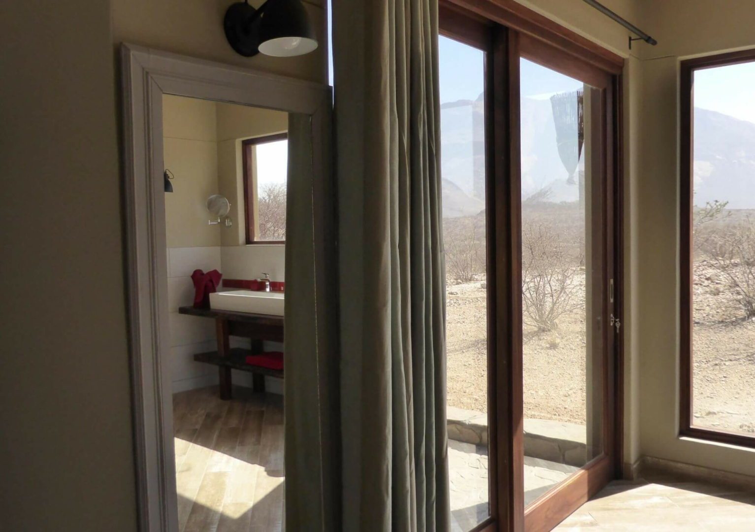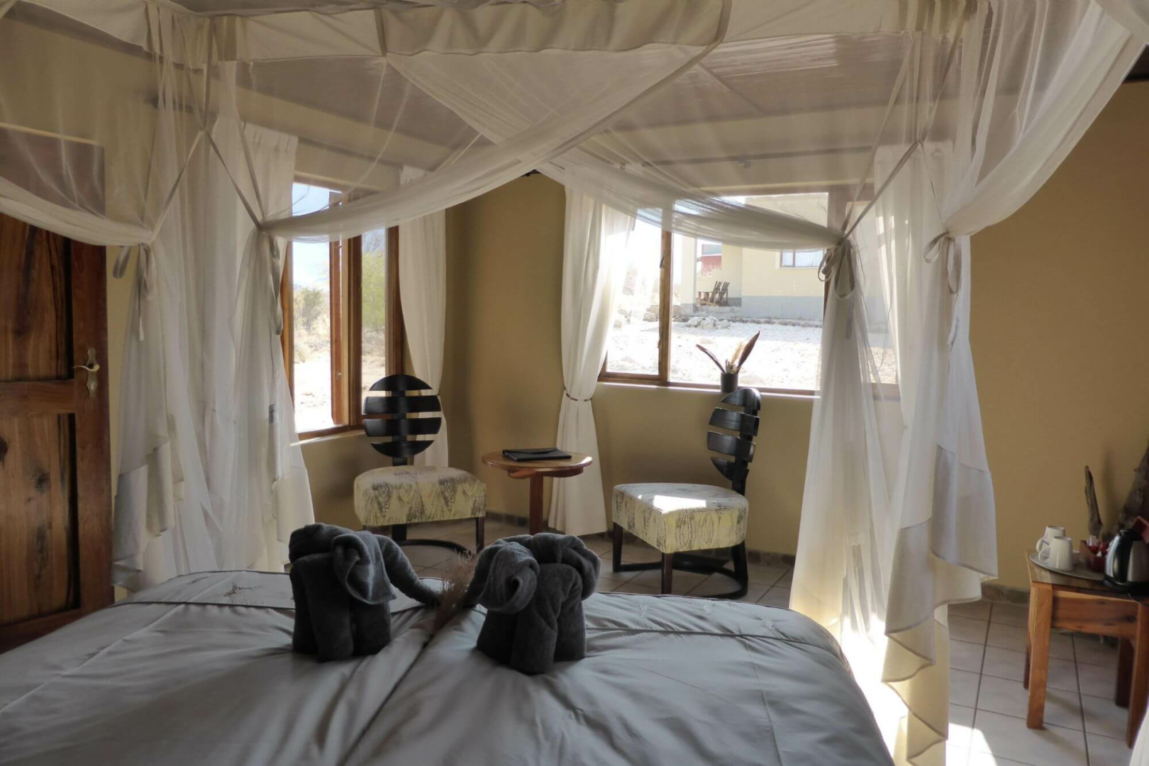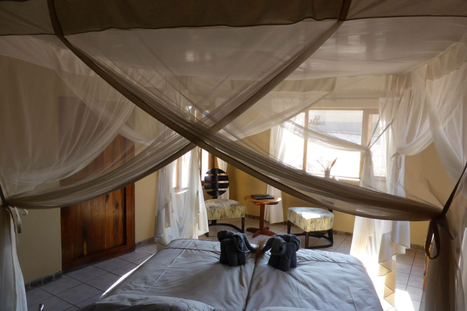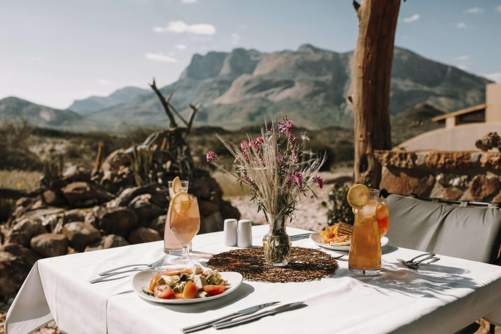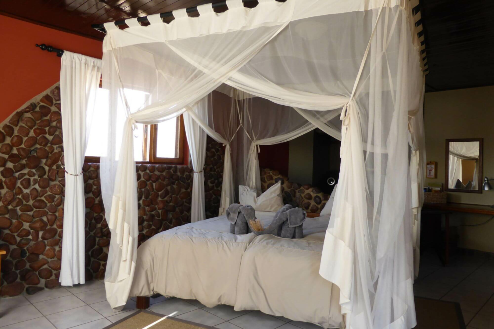 Herzstück der Lodge ist ein umgewandeltes altes Farmhaus mit Restaurant und Lodge. Es gibt auch eine geräumige Terrasse, auf der die Mahlzeiten eingenommen werden, mit Blick auf ein Wasserloch, das von Springboks, Oryxe, Gnus, Strauße und Giraffen regelmäßig besucht wird. Es gibt auch einen Pool