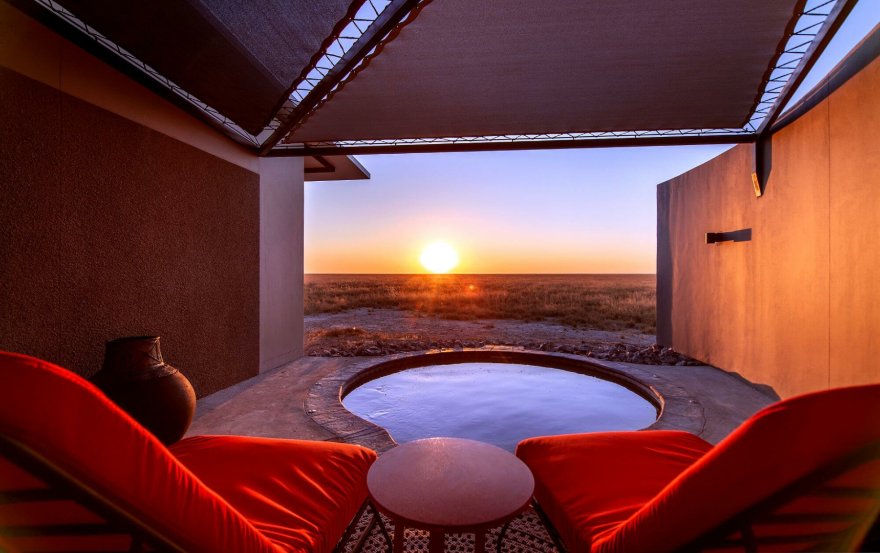 Gäste werden in vierzig genauso opulent gestalteten Suites untergebracht, die mit jeder erdenklichen Annehmlichkeit ausgestattet sind. Das Design widerspiegelt die Mischung aus königlicher und Oshiwambo-Kultur. Die Badezimmer sind herrlich groß und jede Suite kommt mit einem privaten Pool Blick in die fantastische Landschaft.