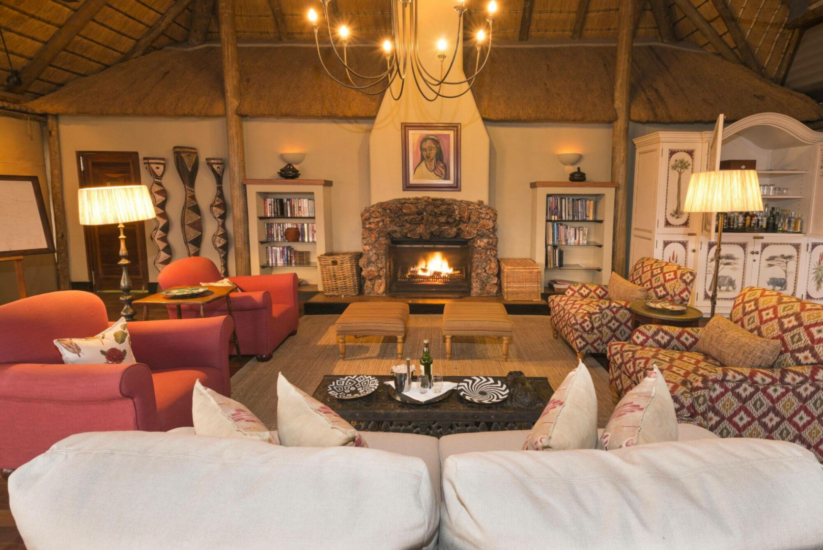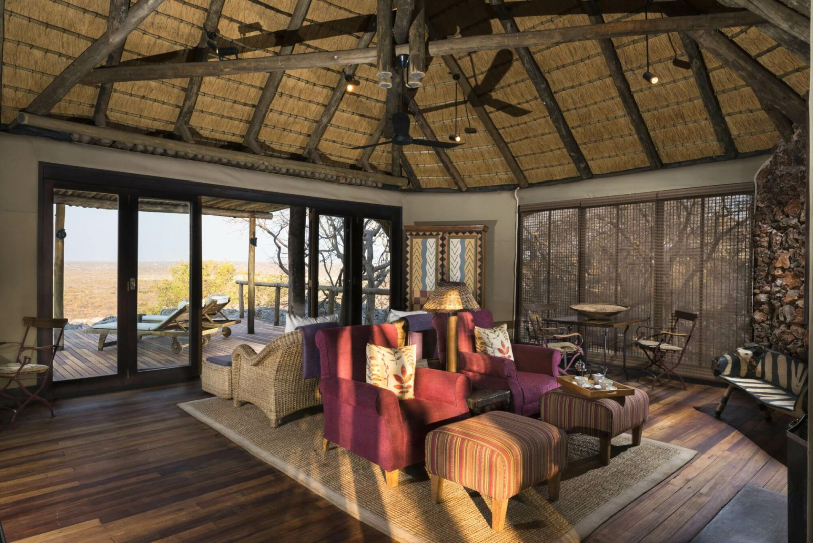 Kernstück der Lodge ist die offene unter Reetdach stehende Hauptlodge mit super komfortablem und sehr luxuriös gestaltetem Loungebereich inklusive Bibliothek, Kamin und Bar und einer großen Terrasse mit einer atemberaubenden Aussicht auf das umliegende Ongava Reservat und ein stark frequentiertes Wasserloch.