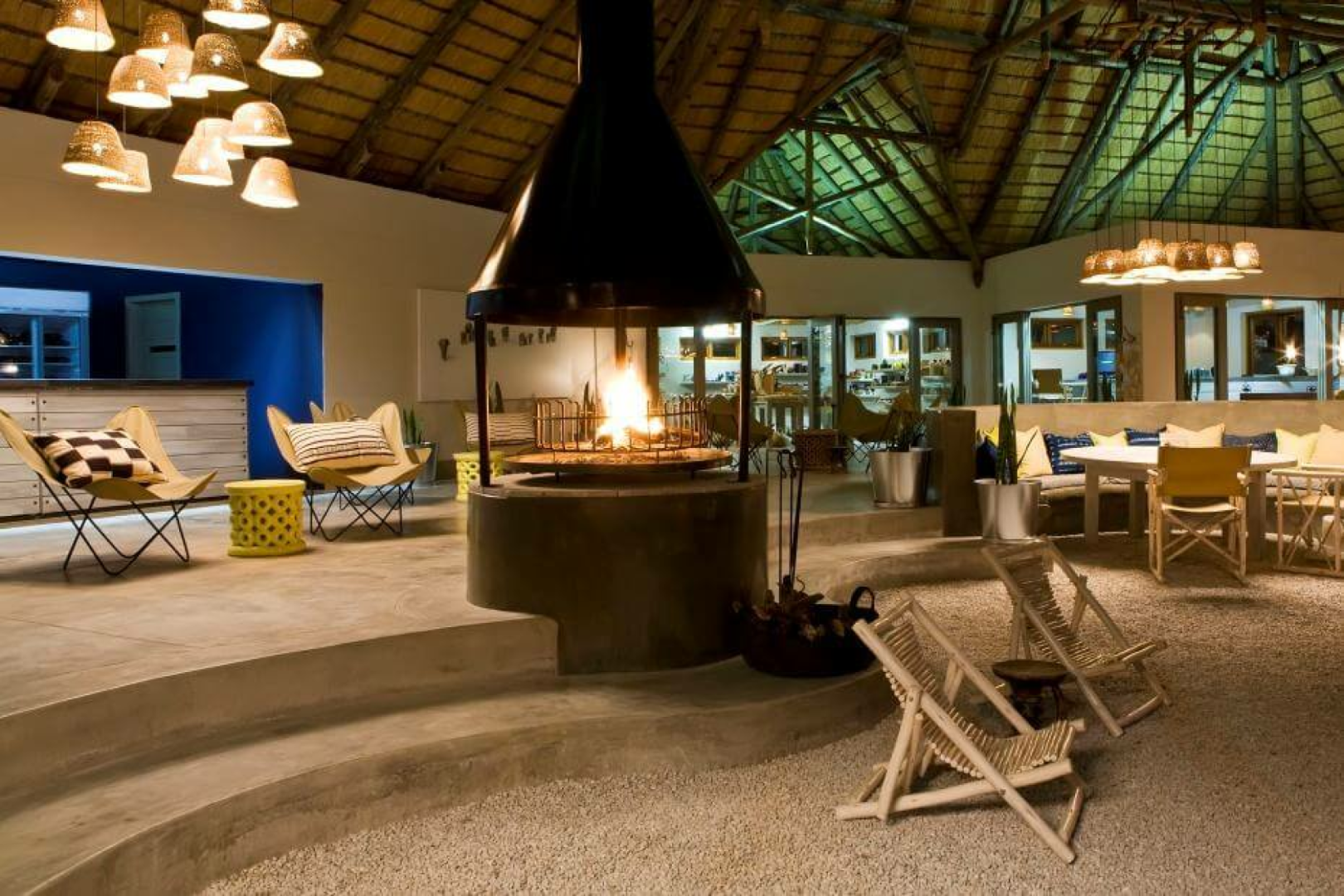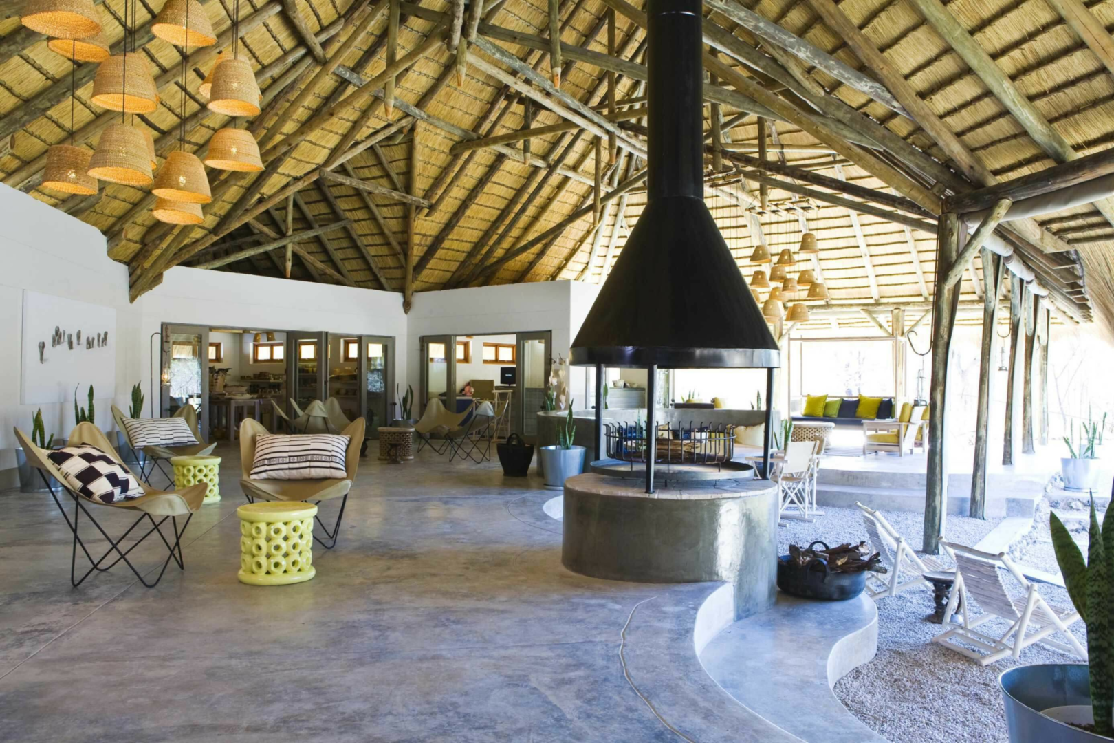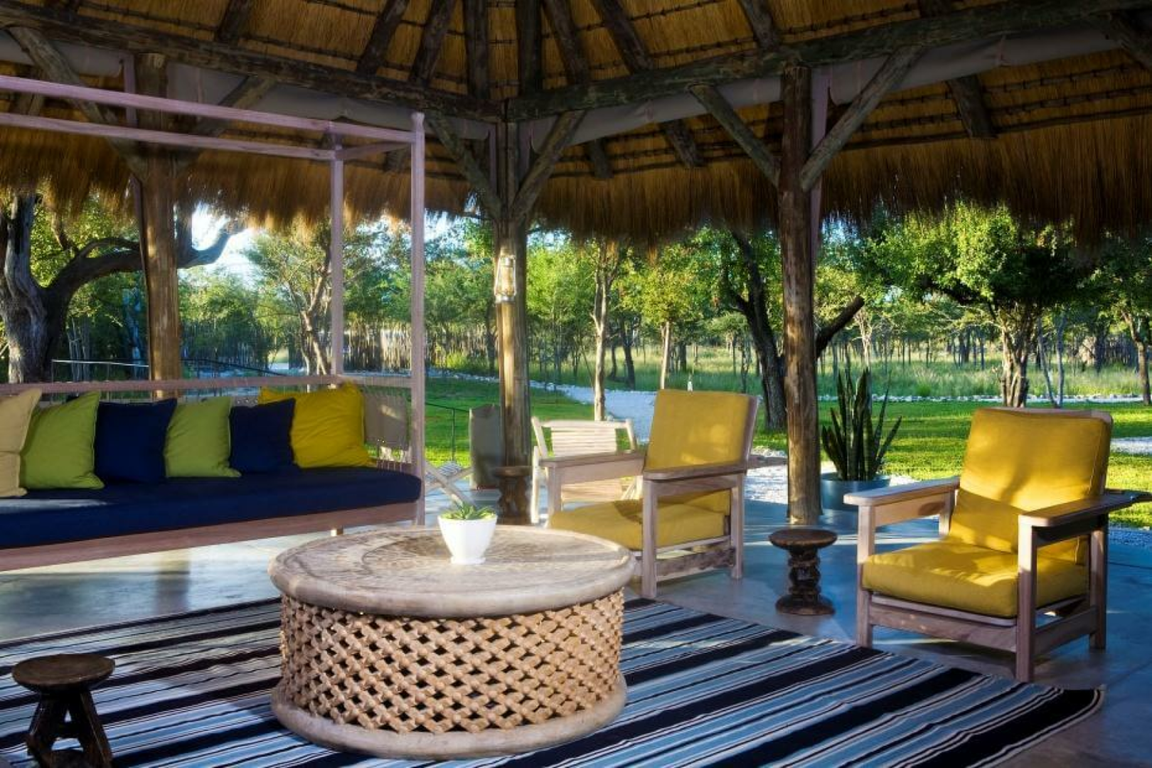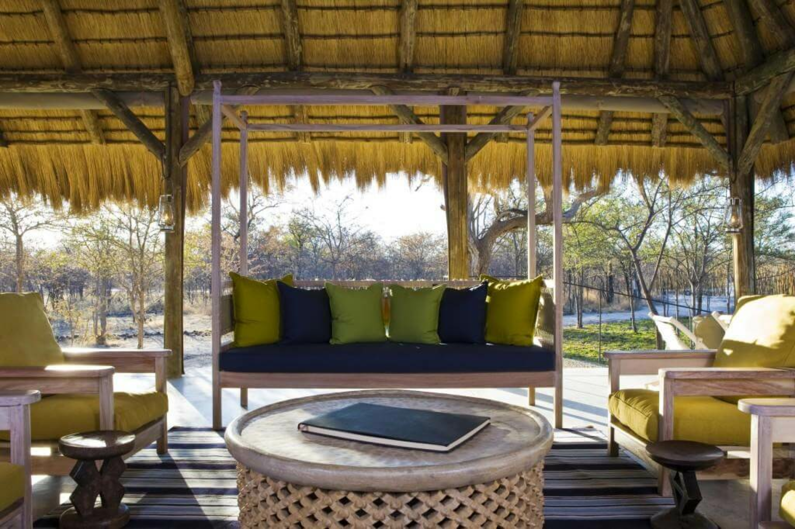 Die öffentliche Bereiche von Mushara Bushcamp sind in einem reetgedeckten, offenen Bau untergebracht. Hier befindet sich ein entspannter farbenfroher Loungebereich mit gemütlichen Sitzecken, kleinen runden Tischen mit Korbstühlen und einigen Regalen voller Magazine und Reisebücher. Die Dekoration ist sehr geschmackvoll und integriert viele natürliche Elemente. Fantastisch gut gelungen und sehr originell ist zum Beispiel der Kiesboden.