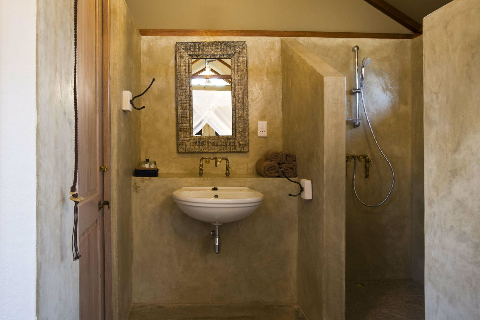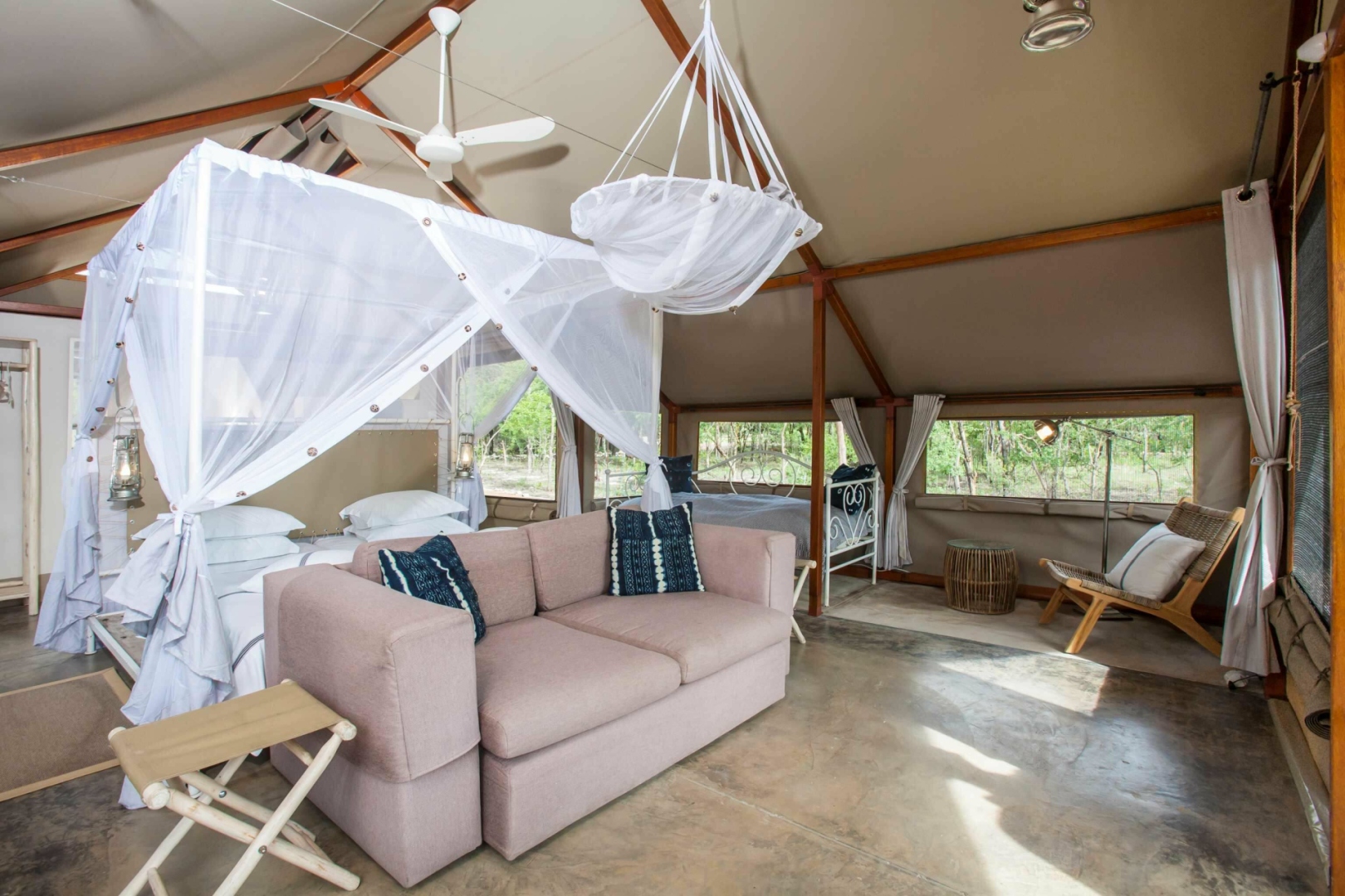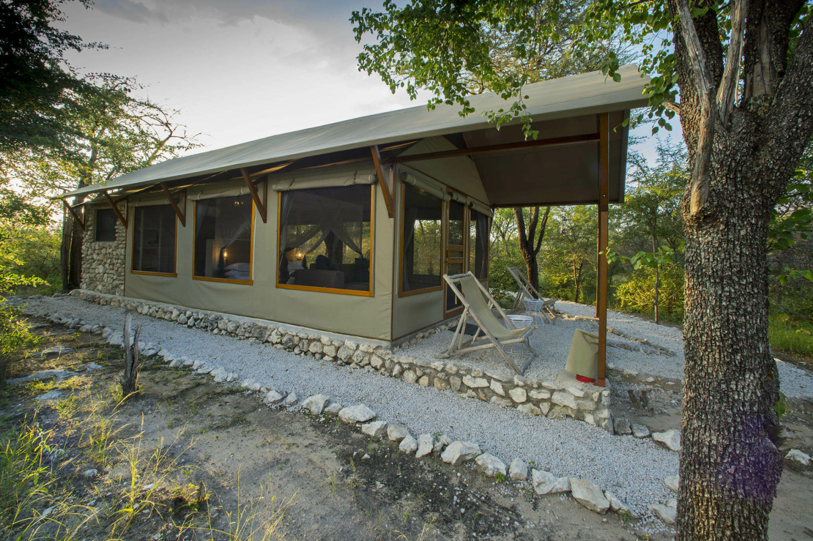 Gäste werden in 16 Luxuszelten untergebracht, die über gepflasterte Wege erreichbar sind. Das Zeltinnere ist wunderbar in sanften Safaritönen eingerichtet. In der Mitte erhebt sich das große Himmelsbett unter Moskitonetz. Es gibt auch eine Tee-/Kaffeetisch. Zu jedem Zelt gehört eine kleine private Veranda mit Sitzmöglichkeiten, sowie ein en-suite Badezimmern mit Innendusche.