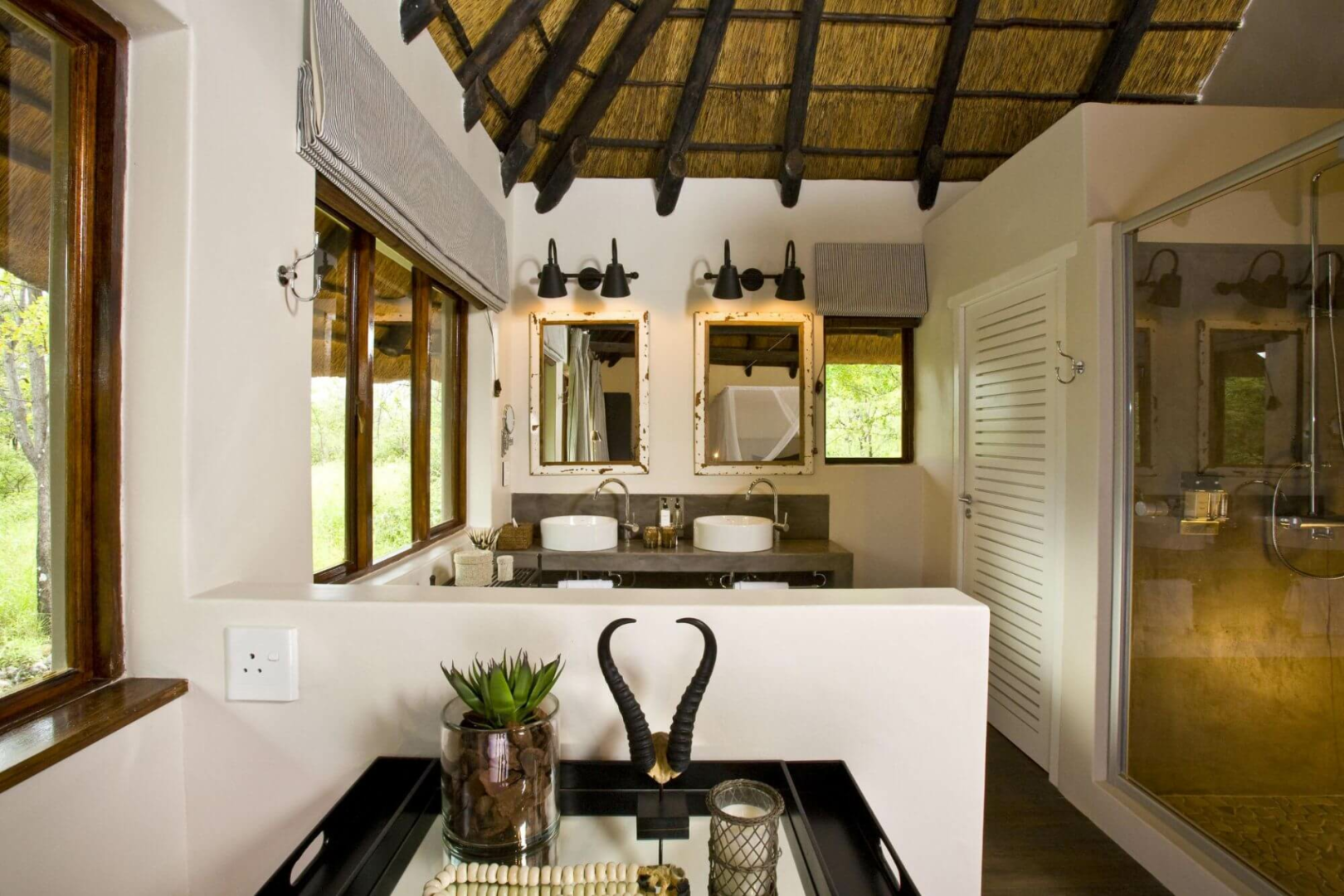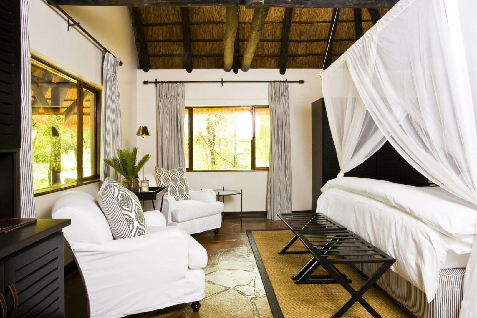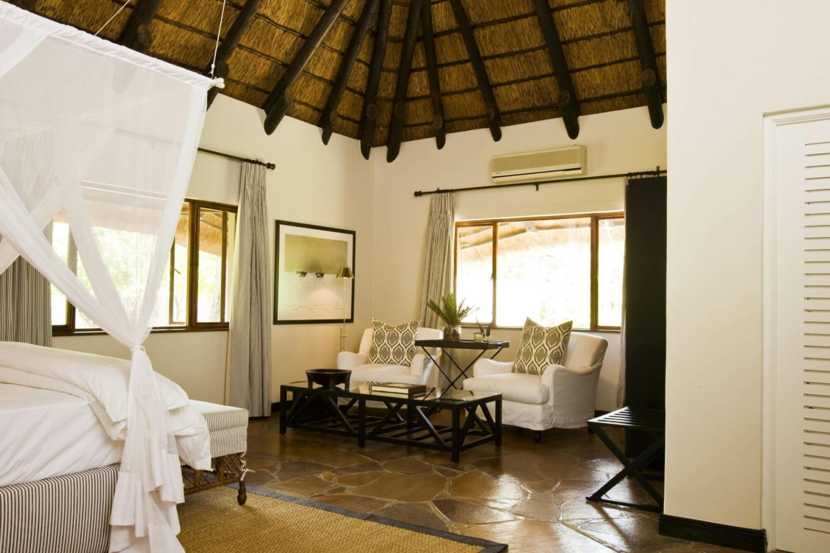 Gäste werden in zehn strohgedeckten Chalets untergebracht, die im Halbkreis um den Pool herum angeordnet sind. Die Chalets sind komfortabel, voll klimatisiert und mit dunklem Holzmobiliar eingerichtet. Der cremefarbige Steinboden, die weißen Sessel und das makellos weiß bezogene Bett wirken edel und elegant. Zu jedem Chalet gehört eine kleine Veranda mit Sitzmöglichkeiten, eine Minibar/Kühlschrank, einem Safe, einer Tee-/Kaffeemaschine und einem Privatbad mit Dusche.