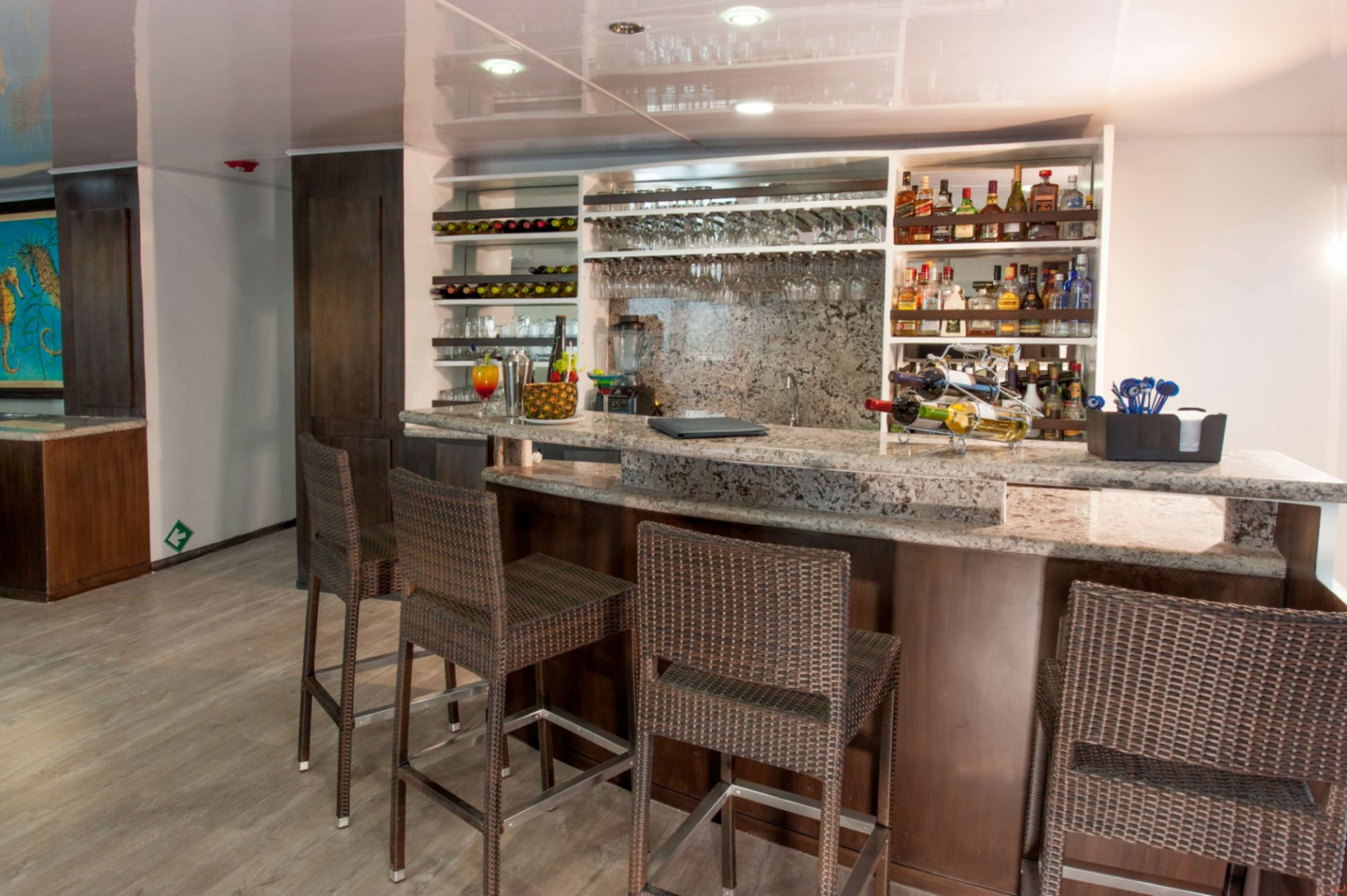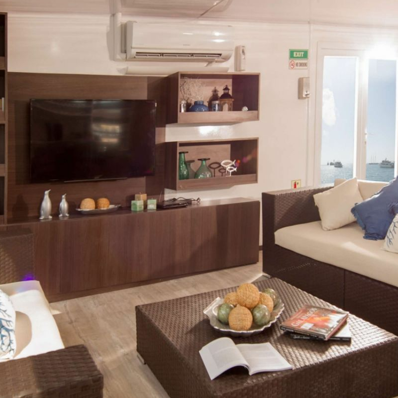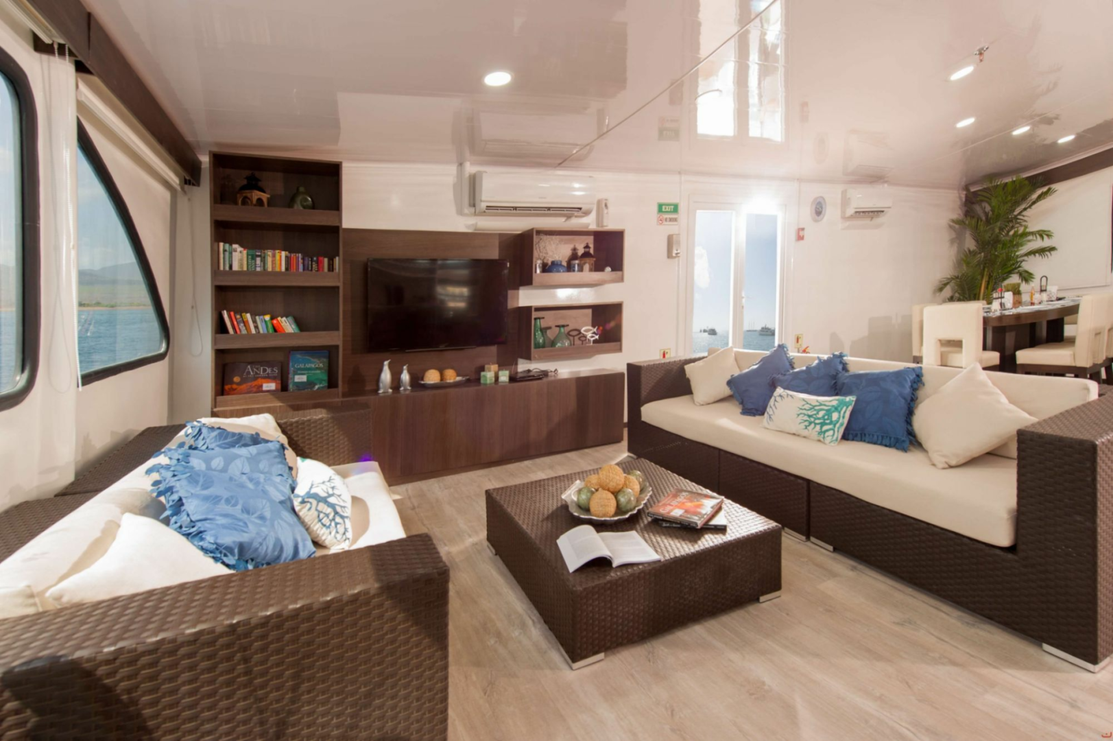 Das Treasure of Galapagos ist ein Katamaran der gehobenen Mittelklasse mit neun sehr ansprechenden Kabinen verschiedener Kategorien, jede von ihnen mit eigenem Balkon. Die Einrichtung ist sehr im Stil der Siebzigerjahre, was auch den Speiseraum betrifft.