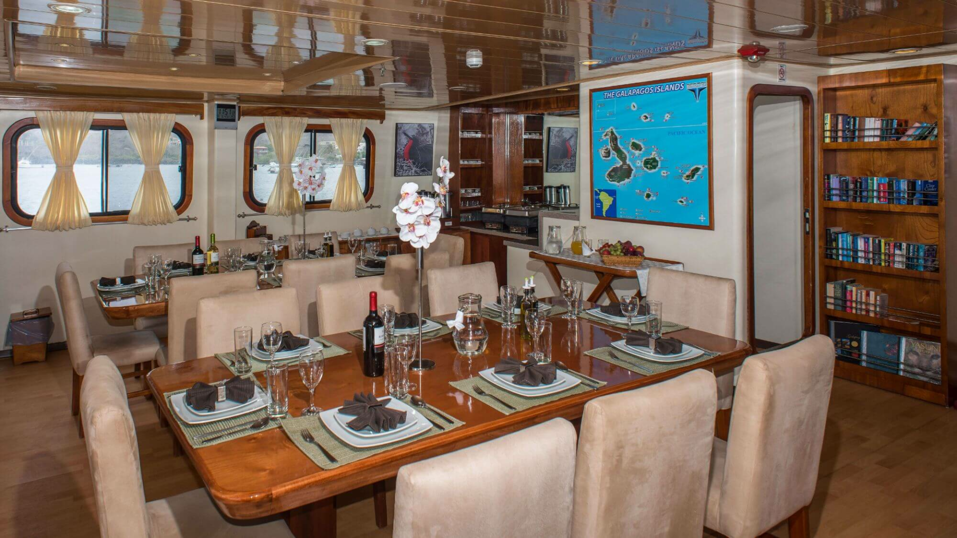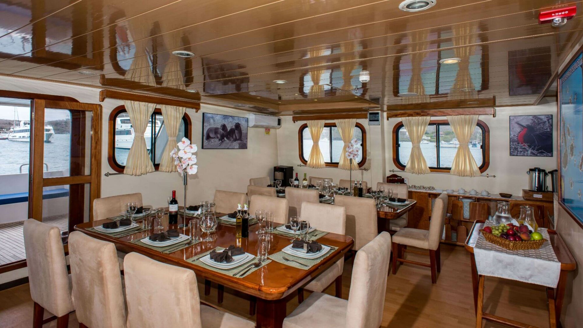 Das Treasure of Galapagos ist ein Katamaran der gehobenen Mittelklasse mit neun sehr ansprechenden Kabinen verschiedener Kategorien, jede von ihnen mit eigenem Balkon. Die Einrichtung ist sehr im Stil der Siebzigerjahre, was auch den Speiseraum betrifft.