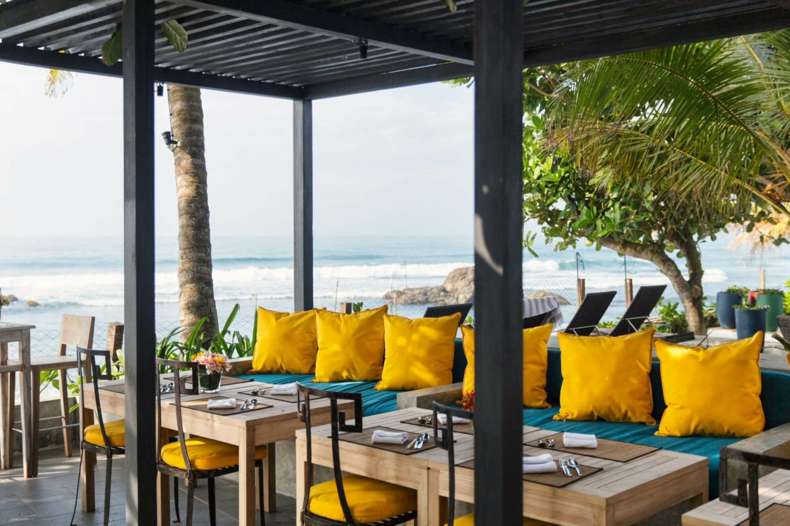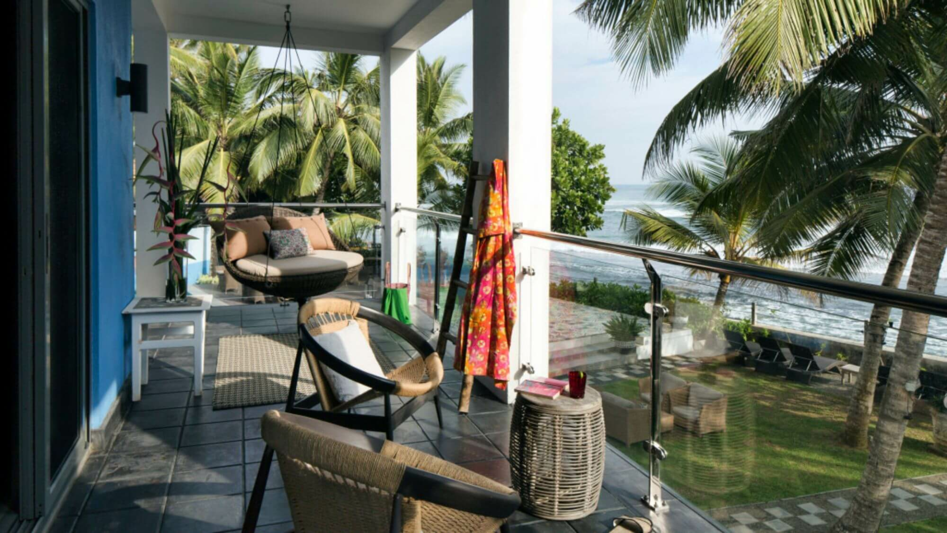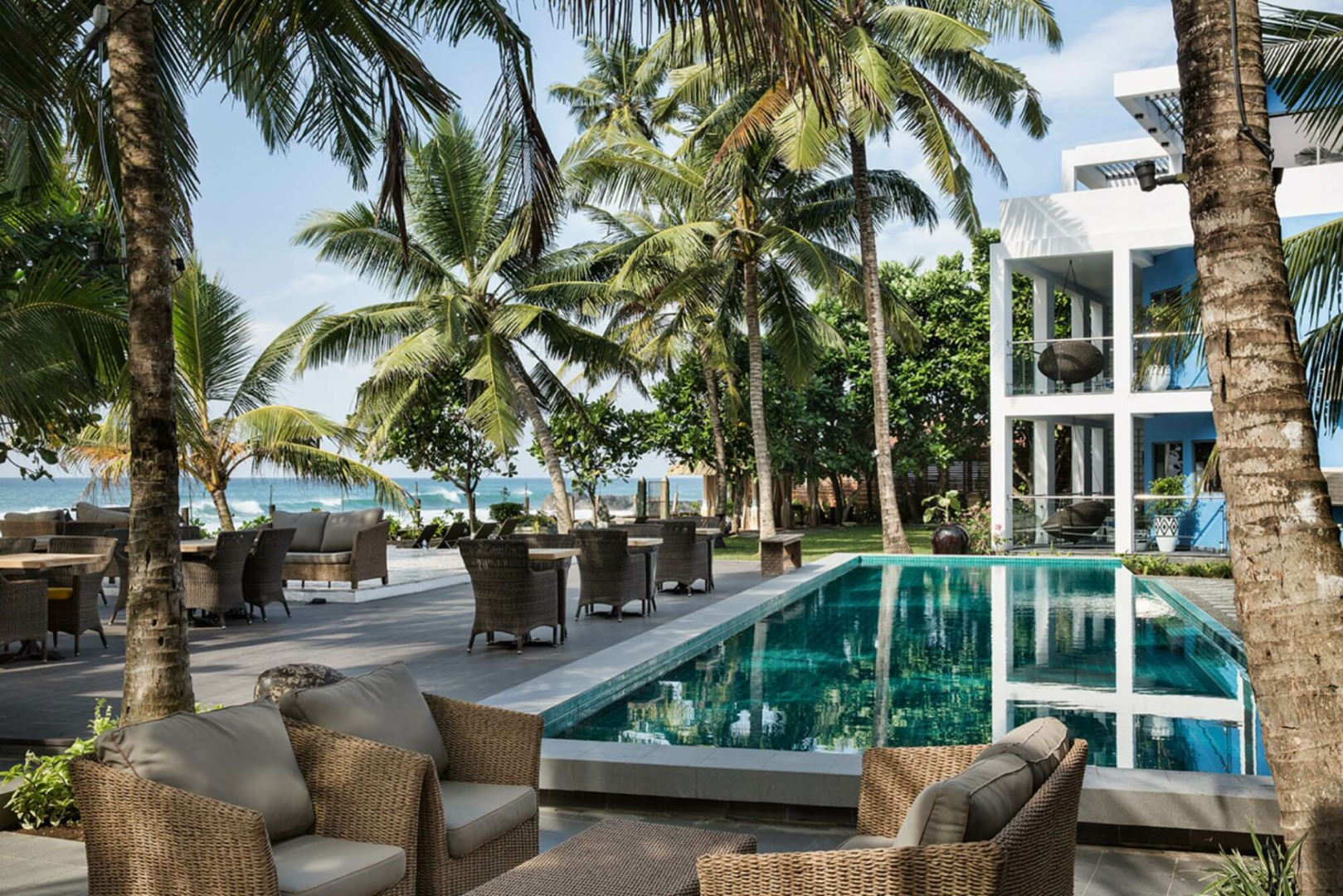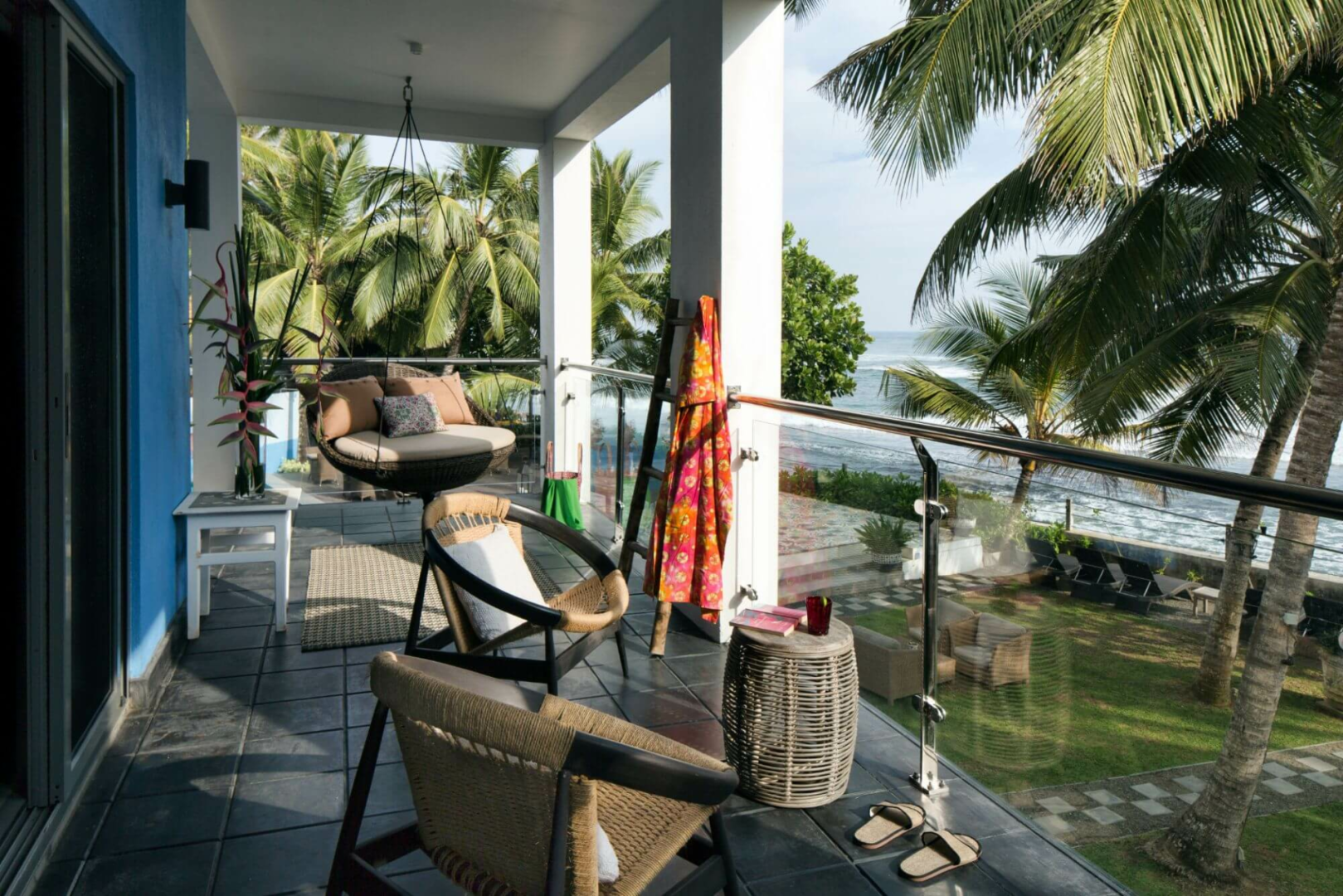 Das Owl and the Pussycat, etwa 20 Autominuten von Galle entfernt, bietet 17 schrullige, große Suites in leuchtenden Farben, luftige, riesige Bäder im Industrie-Look und Meerblick. Die Gemeinschaftsräume sind ebenso künstlerisch gestaltet, mit vielen Kunstwerken an den Wänden und auf den Tischen, Sofas mit bunten Kissen und Bücherregalen aus Holz, die dazu einladen, sich mit Lesestoff zu versorgen, den man draußen am Pool genießen kann.