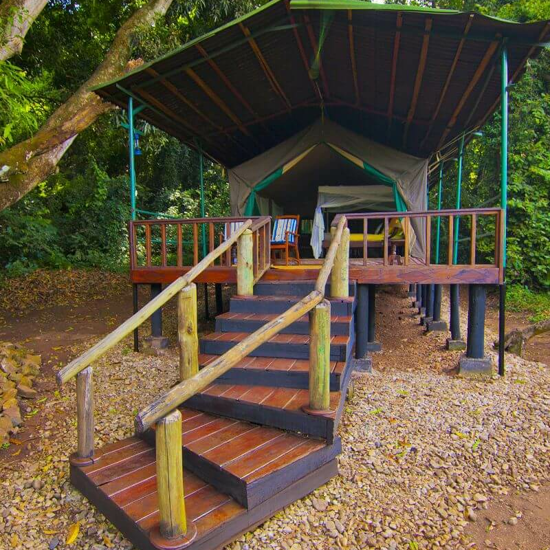 Fünf Minuten Bootsfahrt von der Parkverwaltung entfernt liegt die Gombe Forest Lodge, die einzige Übernachtungsmöglichkeit im Gombe-Stream. Das Camp wird mit einem Schnellboot in 45 Minuten von Kigoma erreicht und bietet recht komfortable, auf Holzplattformen aufgestellte Luxuszelte mit Strom und heißem Wasser. Service und Verpflegung sind von höchstem Niveau.