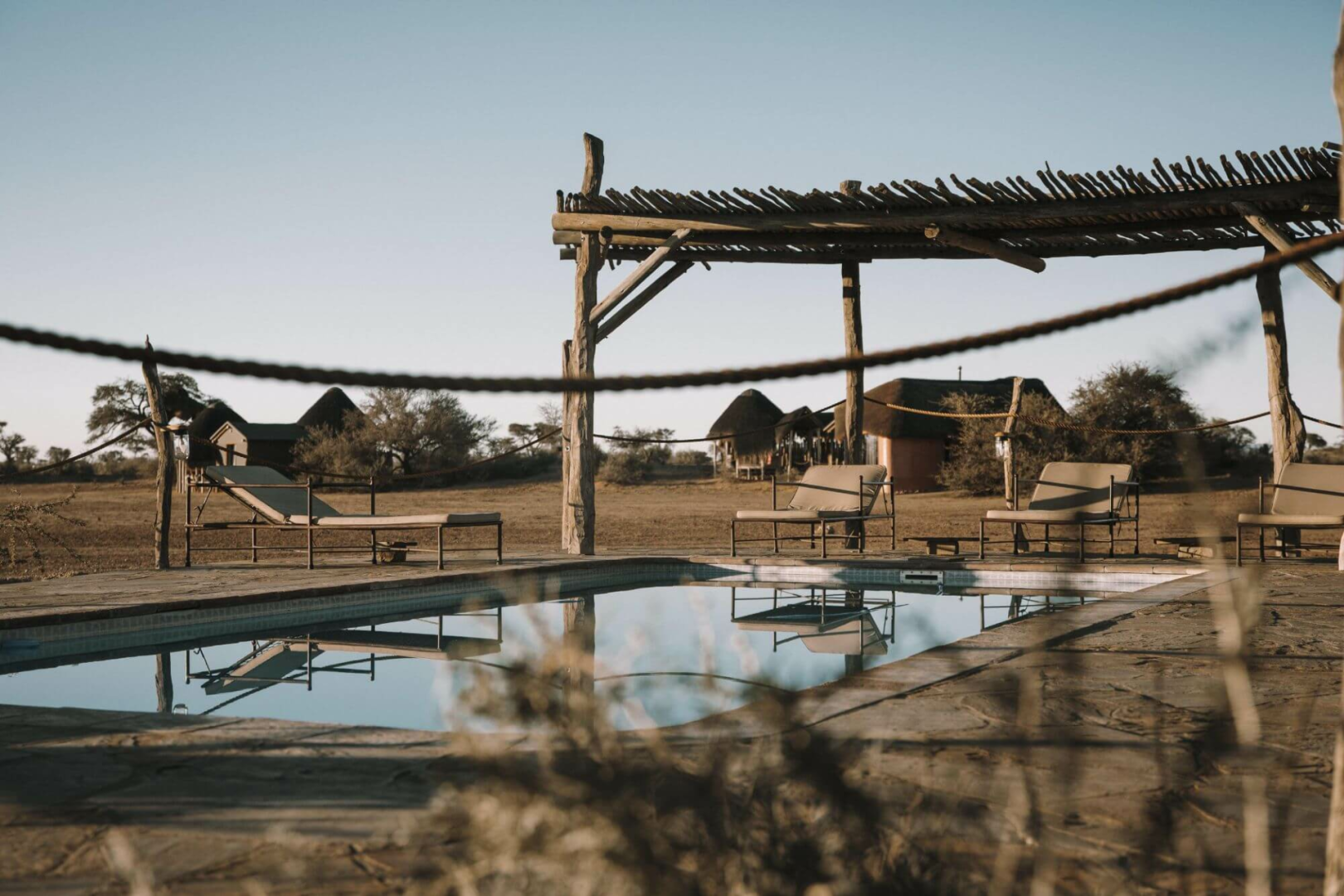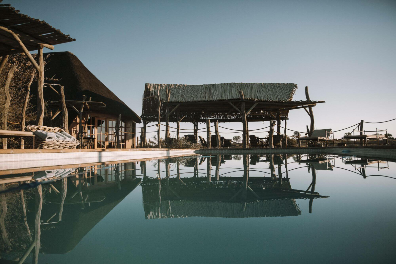 Herzstück der Lodge ist ein schönes Hauptgebäude unter Reetdach, das ein trockenes Vlei (See) überblickt.