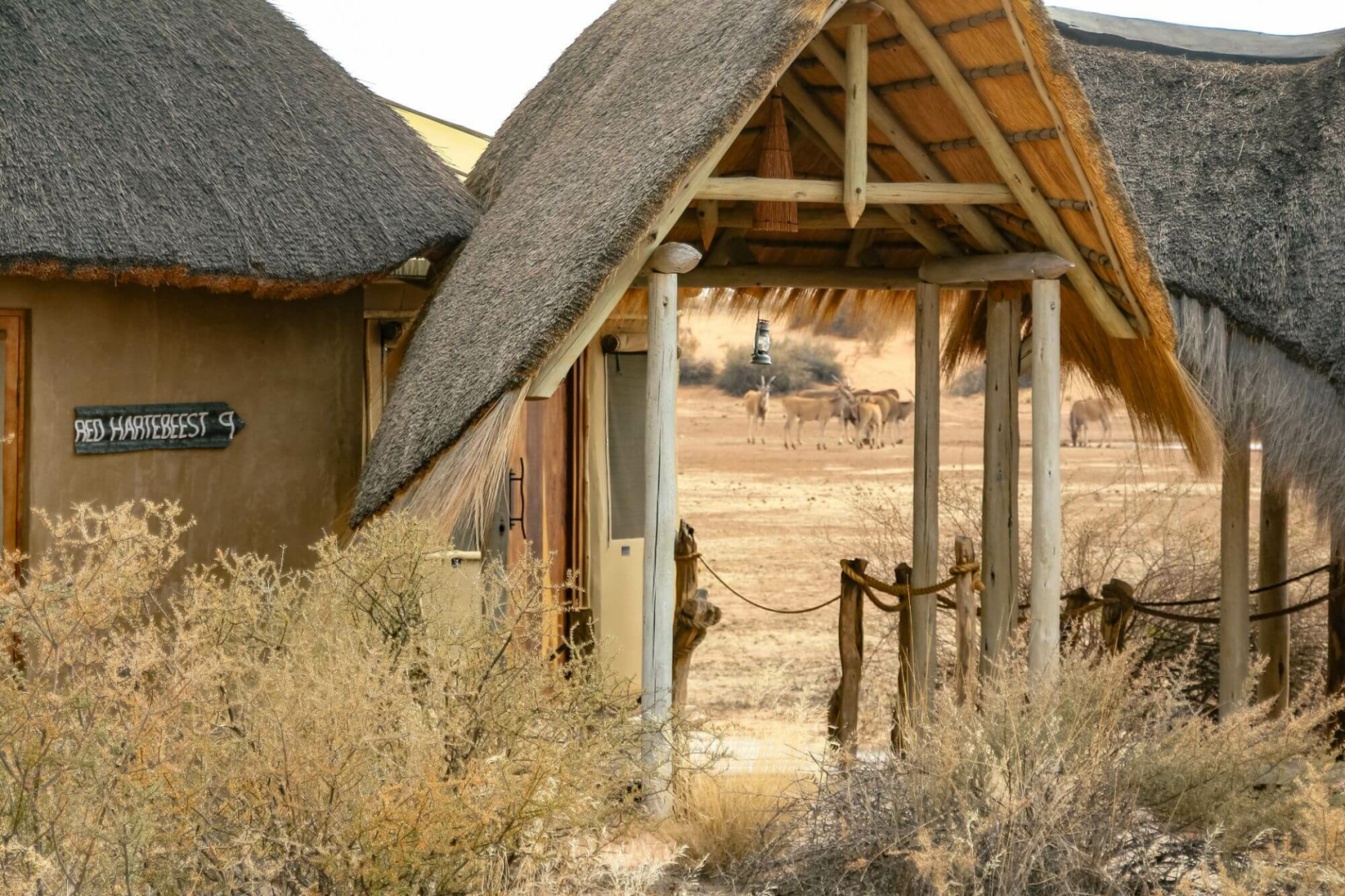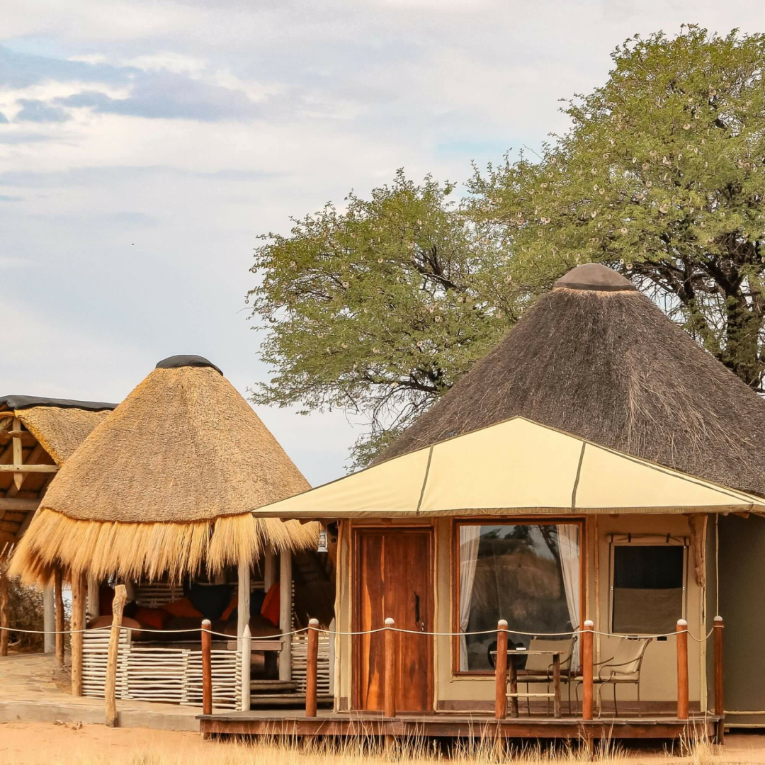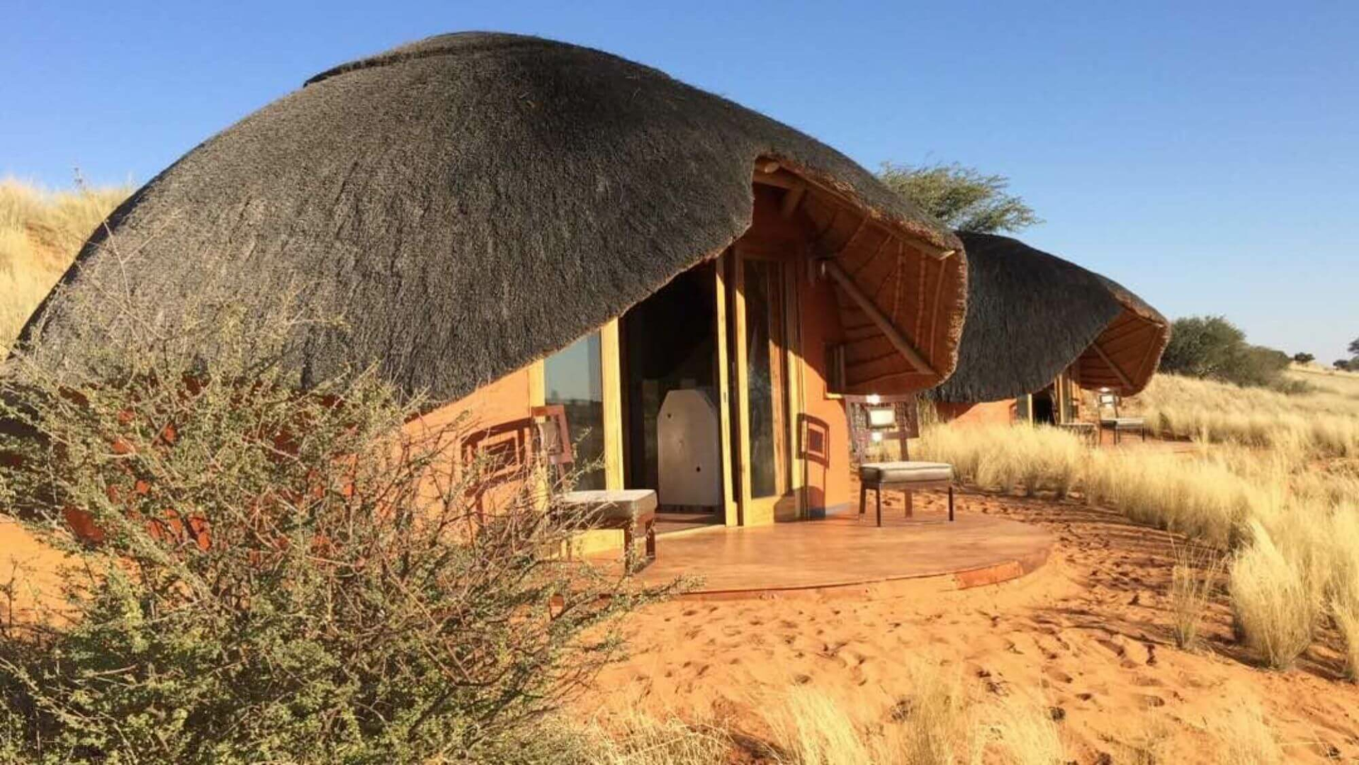 Gäste werden in 12 einzelnen, runden Bungalows unter Reetdach, die aus einer Mischung aus Stroh, Leinen und Stein gebaut sind. Von der privaten Terrasse mit Tagesbett blickt man auf die klassischen roten Dünen der Kalahari. Im Inneren findet man ein großes Bett, große Balkonfenster, eine kleine Sitzecke mit Rattansesseln, eine Kommode und einen Kleiderschrank. Die Zimmer sind geräumig und komfortabel. Die Terrakotta-Wände, der polierte Holzböden ausgelegt mit Tierfellteppichen, die schön gestaltete rote Mosaikbäder, die schweren Möbeln und ein moderner Holzofen aus Stahl verleihen das Zimmer ein urgemütliches Gefühl.