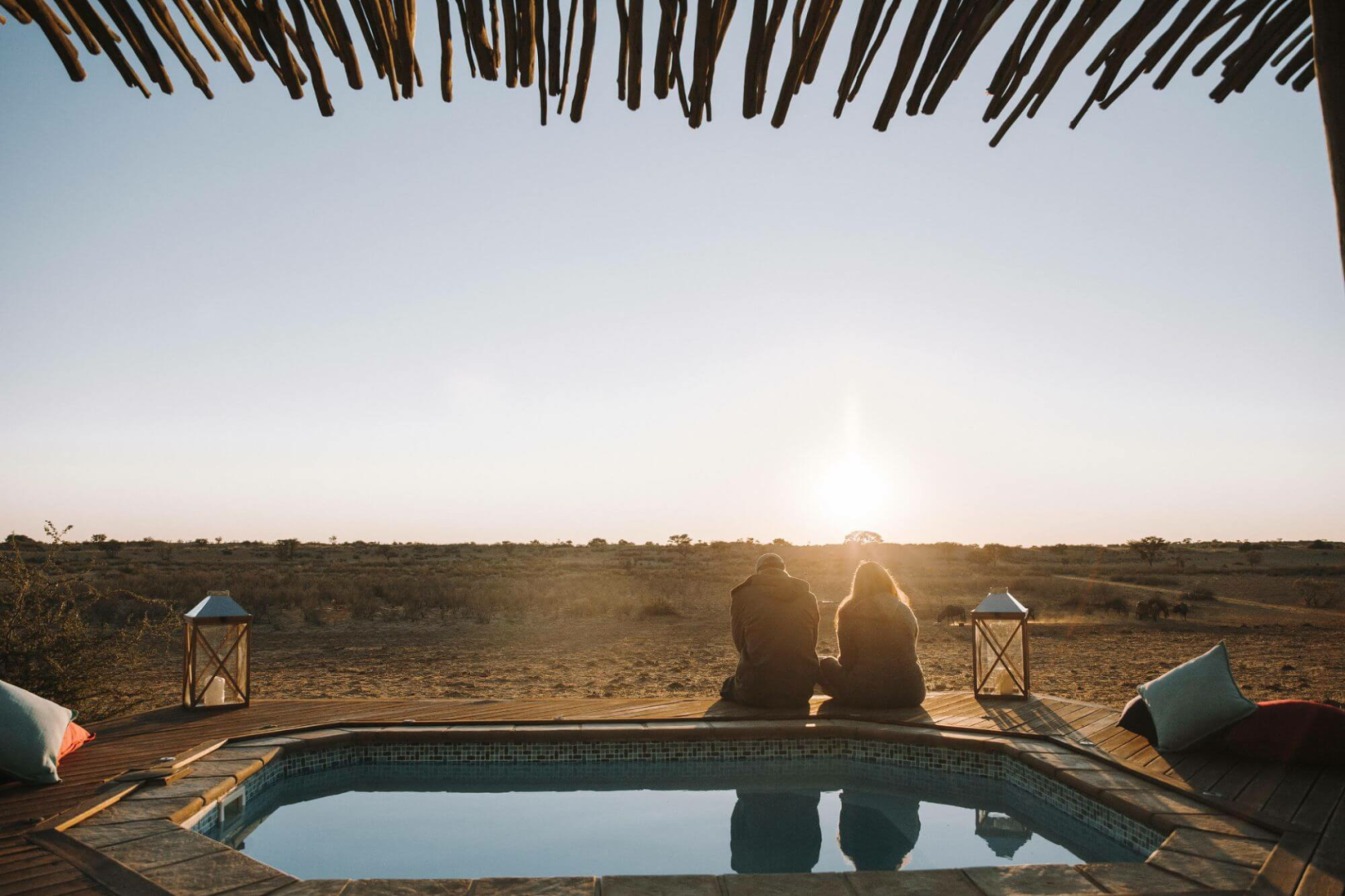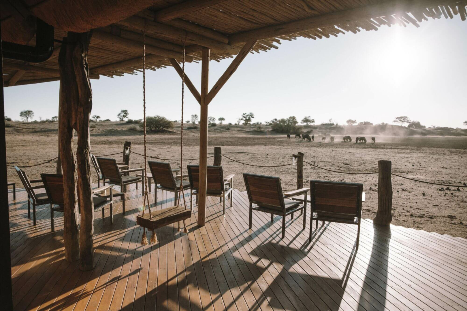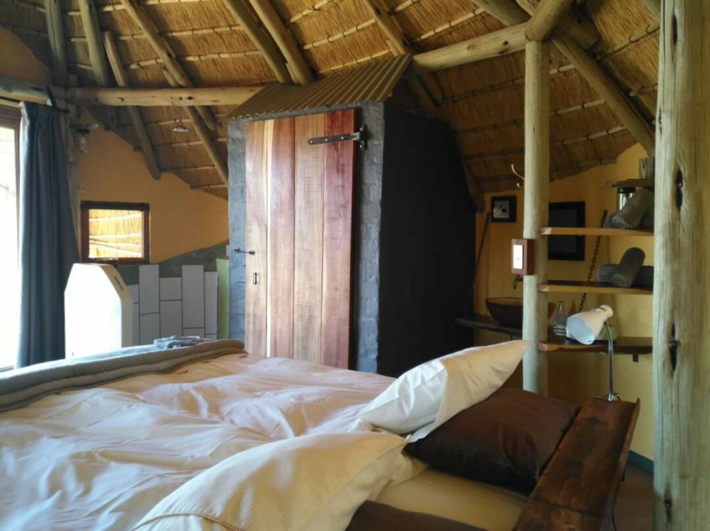 Gäste werden in 12 einzelnen, runden Bungalows unter Reetdach, die aus einer Mischung aus Stroh, Leinen und Stein gebaut sind. Von der privaten Terrasse mit Tagesbett blickt man auf die klassischen roten Dünen der Kalahari. Im Inneren findet man ein großes Bett, große Balkonfenster, eine kleine Sitzecke mit Rattansesseln, eine Kommode und einen Kleiderschrank. Die Zimmer sind geräumig und komfortabel. Die Terrakotta-Wände, der polierte Holzböden ausgelegt mit Tierfellteppichen, die schön gestaltete rote Mosaikbäder, die schweren Möbeln und ein moderner Holzofen aus Stahl verleihen das Zimmer ein urgemütliches Gefühl.