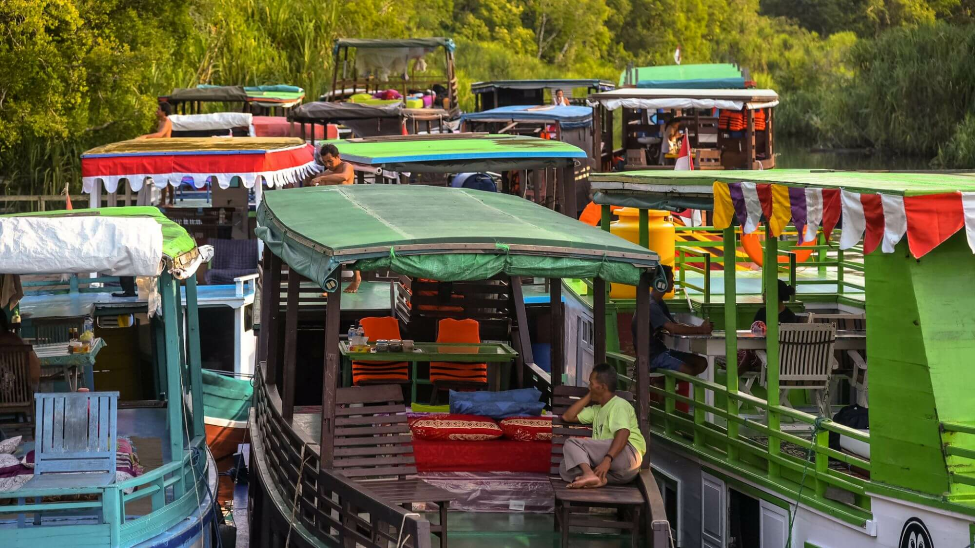 Die Übernachtung an Bord des Klotoks ist recht simpel. Man schläft einfach auf dem Oberdeck. Tagsüber dient das Deck als Aussichtsplattform, von der man Ausschau nach der Tierwelt am Ufer hält. Hier werden auch die Mahlzeiten serviert. In der Nacht werden Matrazen mit Moskitonetzen ausgelegt und das Oberdeck in einen Freiluft-Schlafsaal verwandelt. Badezimmer, Küche und Schlafdeck für die Besatzung befinden sich im Unterdeck. Und, ganz wichtig, es gilt immer: ein Klotok pro geschlossene Gesellschaft.