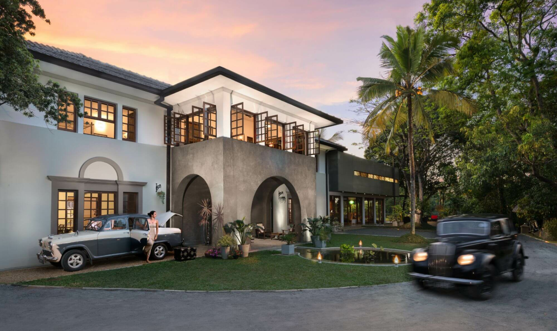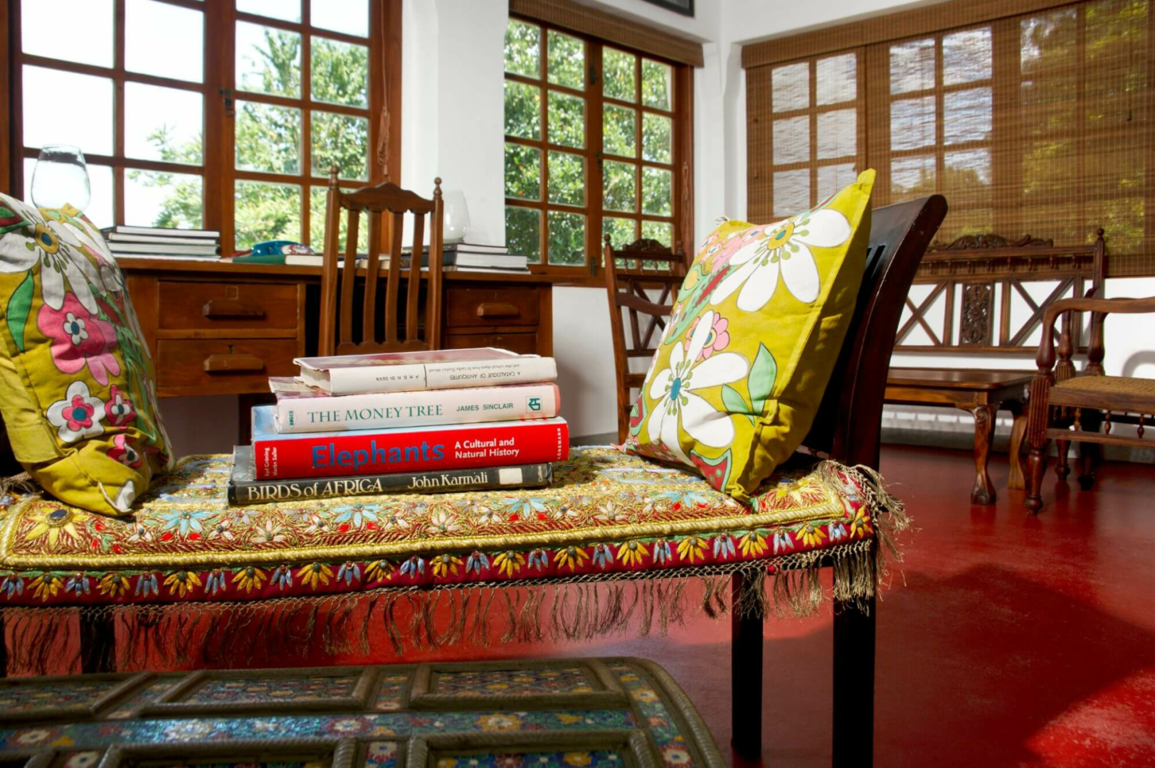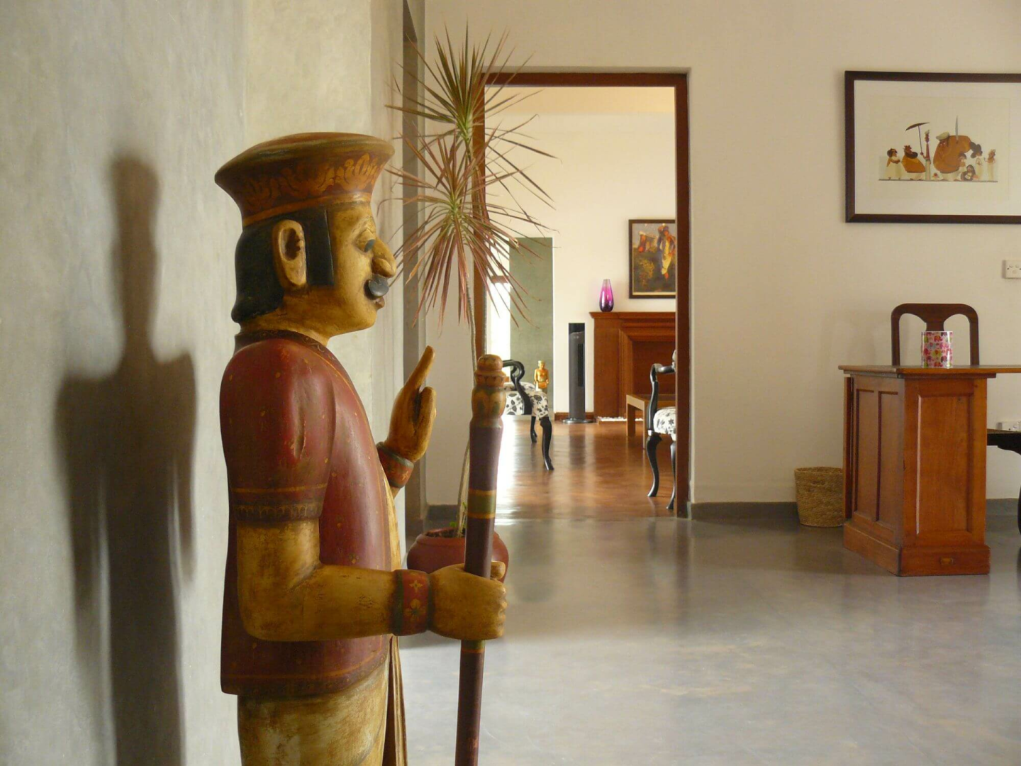 Das zweistöckige, altmodische, weiß getünchte Gebäude steht prominent vor dem Parkplatz. Im Erdgeschoss befinden sich sehr elegante öffentliche Räume mit Lounge- und Essbereichen, die zu einem Garten mit einem großen Swimmingpool mit Blick auf die Hügel führen. Helle Papierwände und viele Artefakte, Statuetten und schrullige Couches verleihen dem Ort ein leicht bizarres, sehr persönliches Aussehen.