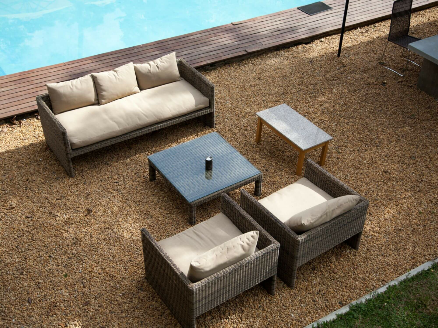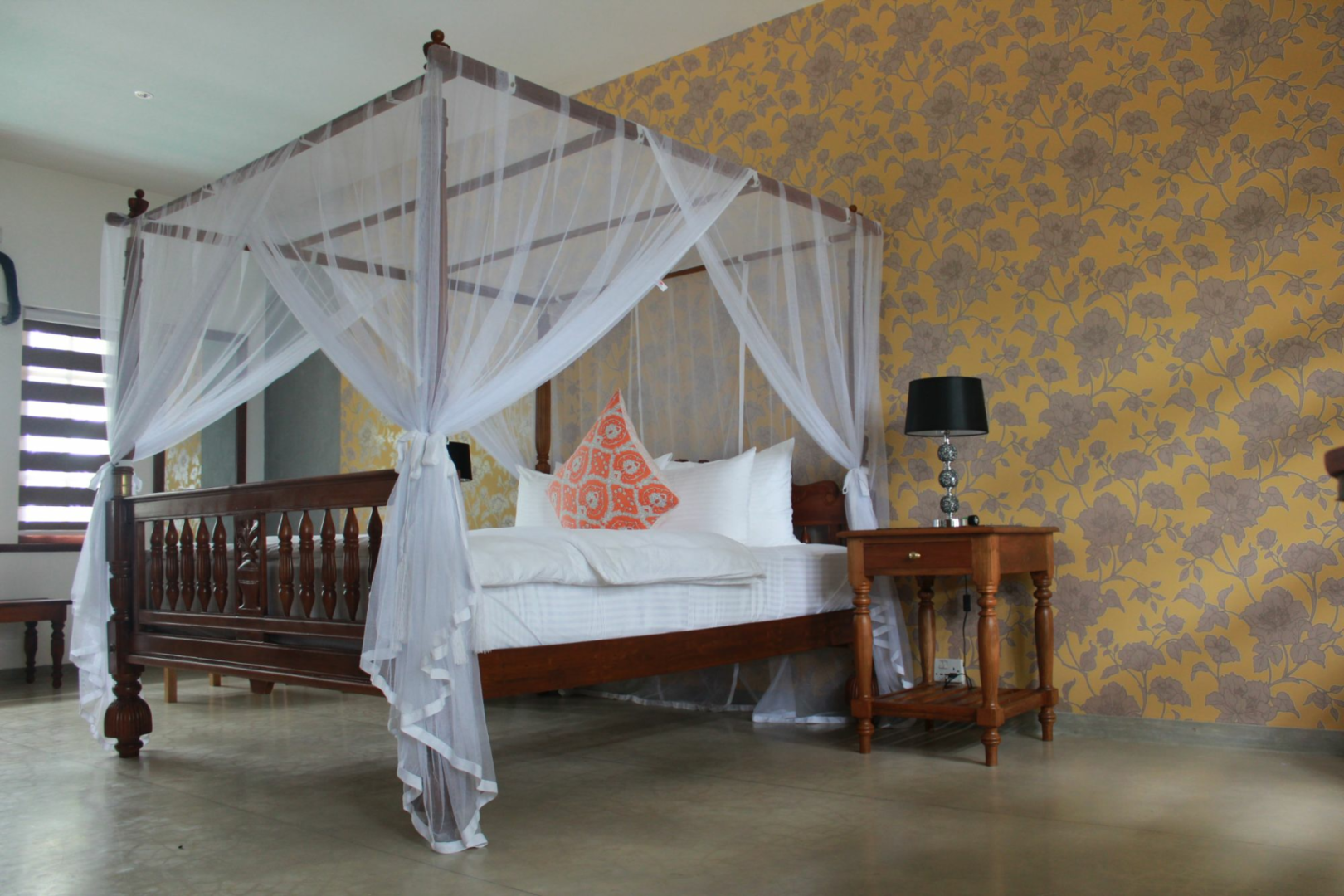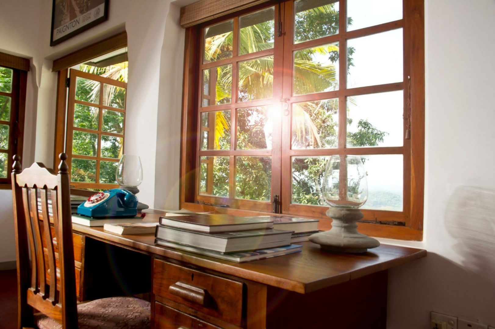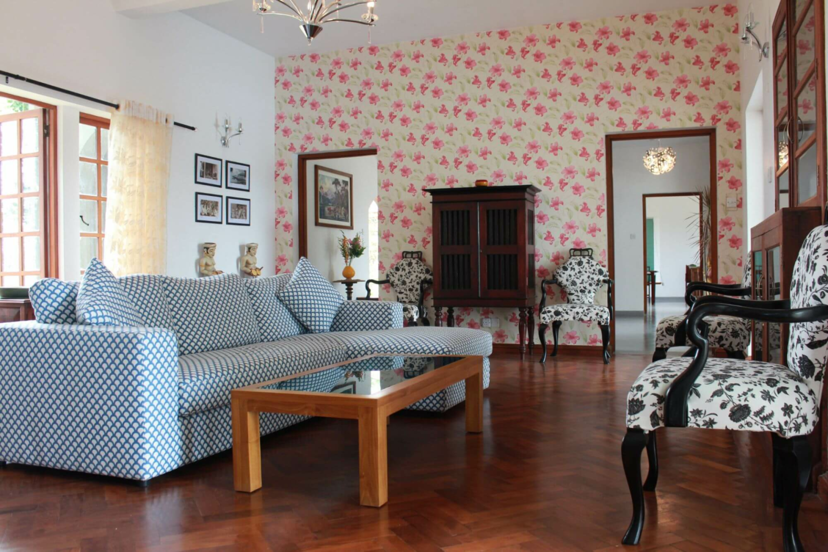Das zweistöckige, altmodische, weiß getünchte Gebäude steht prominent vor dem Parkplatz. Im Erdgeschoss befinden sich sehr elegante öffentliche Räume mit Lounge- und Essbereichen, die zu einem Garten mit einem großen Swimmingpool mit Blick auf die Hügel führen. Helle Papierwände und viele Artefakte, Statuetten und schrullige Couches verleihen dem Ort ein leicht bizarres, sehr persönliches Aussehen.