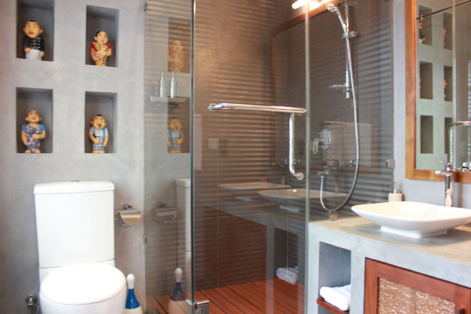 Alle sieben Zimmer unterschiedlicher Kategorien sind sehr gemütlich eingerichtet und verfügen über einen Balkon mit Blick auf den Garten und einen sehr schönen Schreibtisch mit altmodischen Möbeln, einem alten Telefon und einer Kerzenlampe. Das Badezimmer ist mit zwei Waschbecken und einem riesigen Duschbereich ausgestattet.