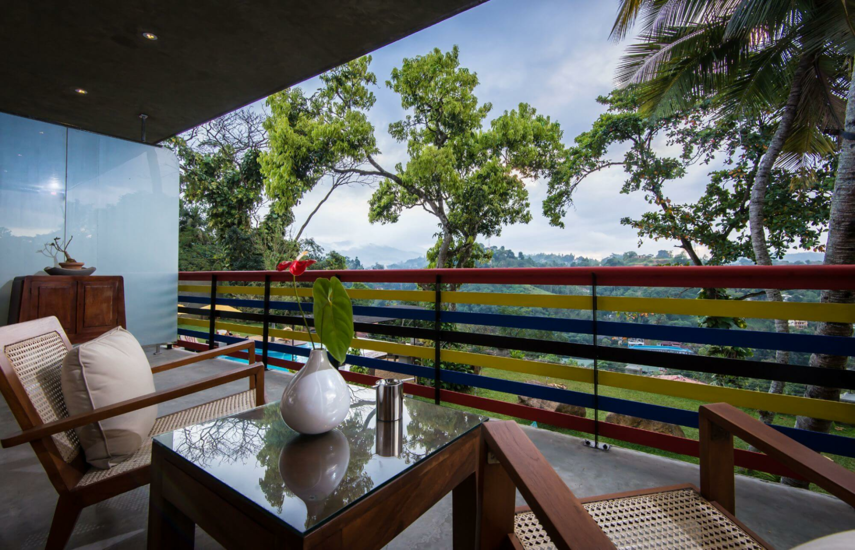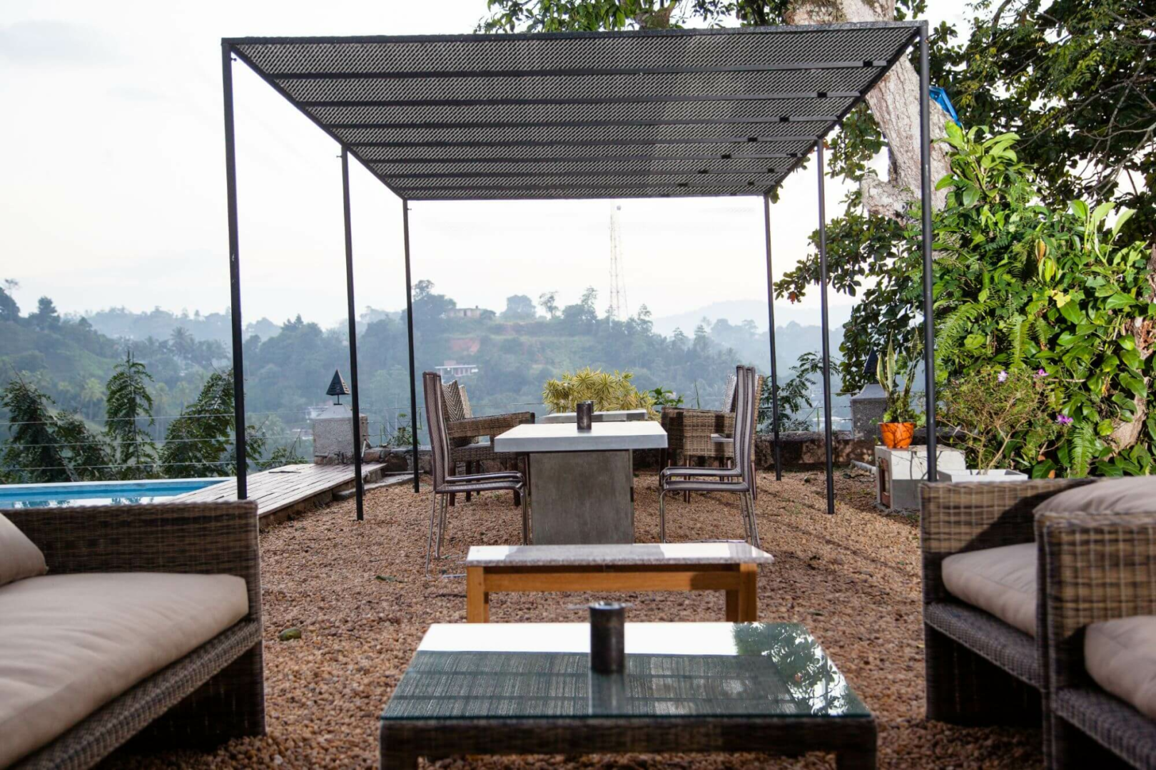 Das Hotel liegt hoch über der Stadt in einer ruhigen Hügellandschaft mit Blick auf Kandy und die dahinter liegenden Berge.