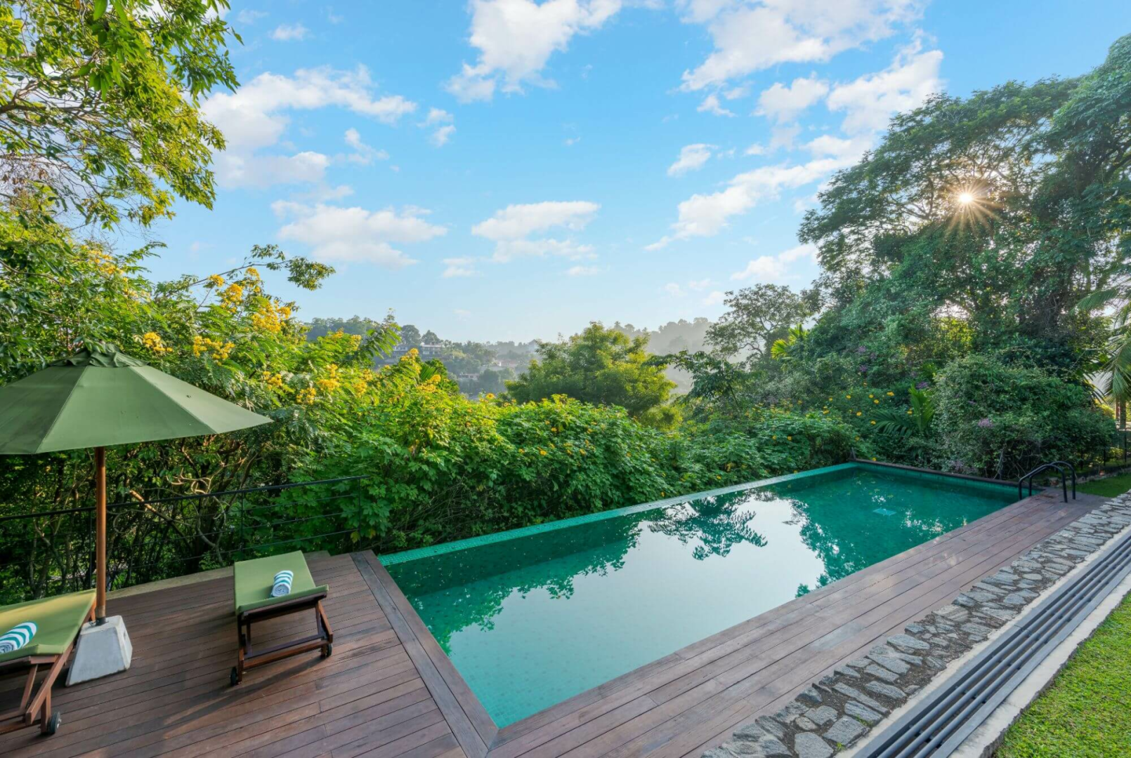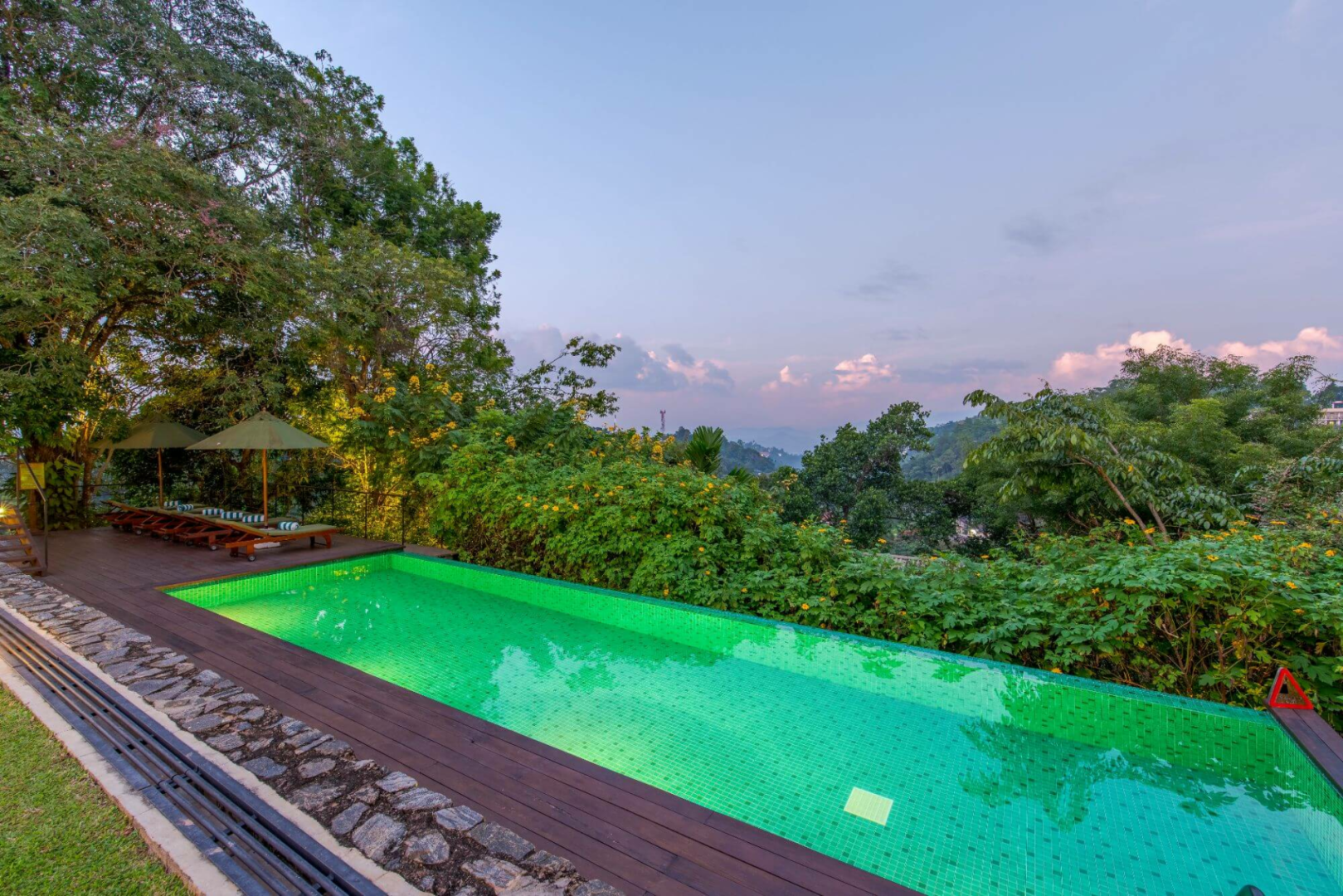Das Boutique-Hotel liegt auf einem Hügel und bietet einen weiten Blick Kandy.