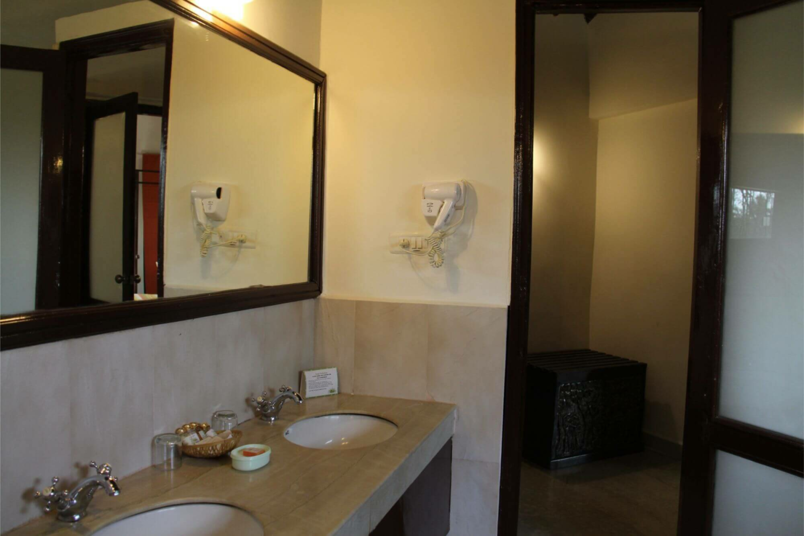 Man betritt die Lodge über das große Haus, wo das Restaurant untergebracht ist. Direkt hinter dem Haus liegt der große Pool. Alle Wohneinheiten liegen verteilt in der parkähnlichen Anlage. Die nicht sehr ansprechend aussehenden Standardzimmerblocks, die jeweils zwei Zimmer beherbergen, sind dezent, könnten aber auch in der Stadt sein. Man hat auch die Wahl zu etwas gehobeneren Deluxe-Zimmern, die aber den Aufpreis nicht wert ist. Überall im Garten sind Schilder mit komischen und völlig unpassenden Sprüchen, die für eine Dschungellodge überhaupt nicht geeginet sind, aufgestellt.