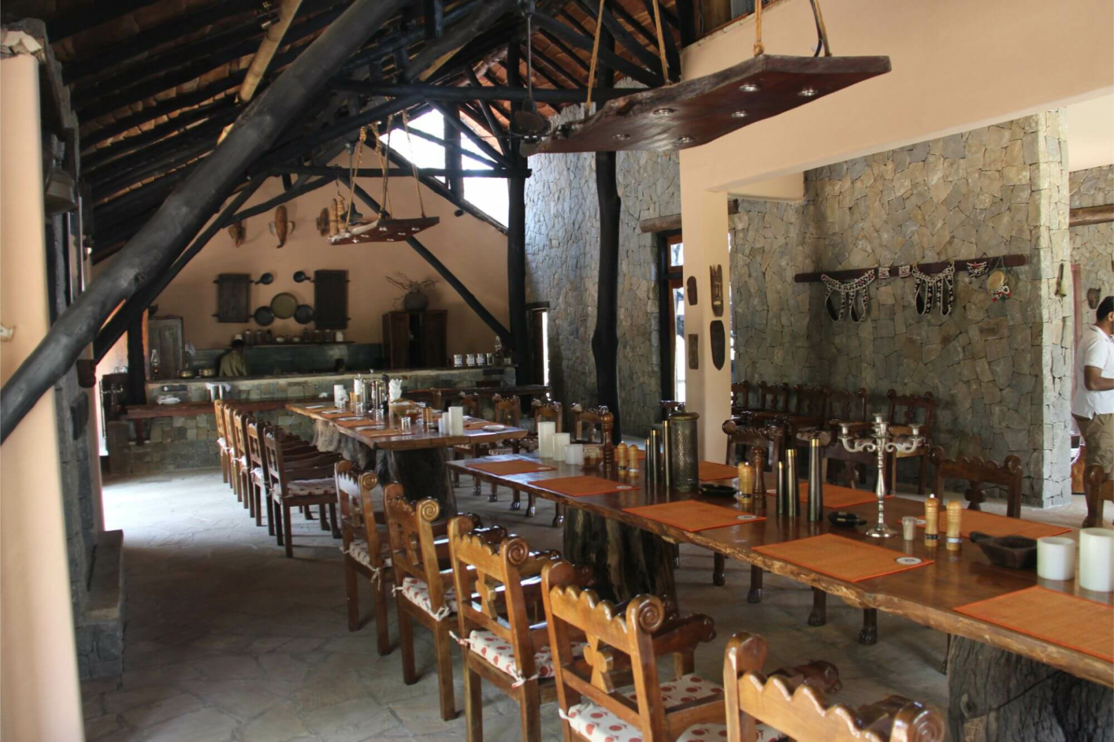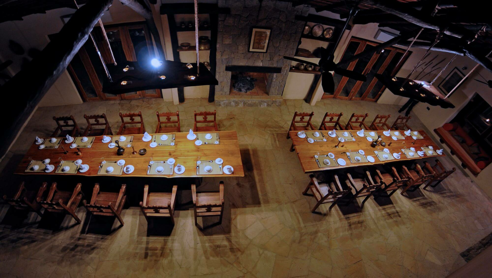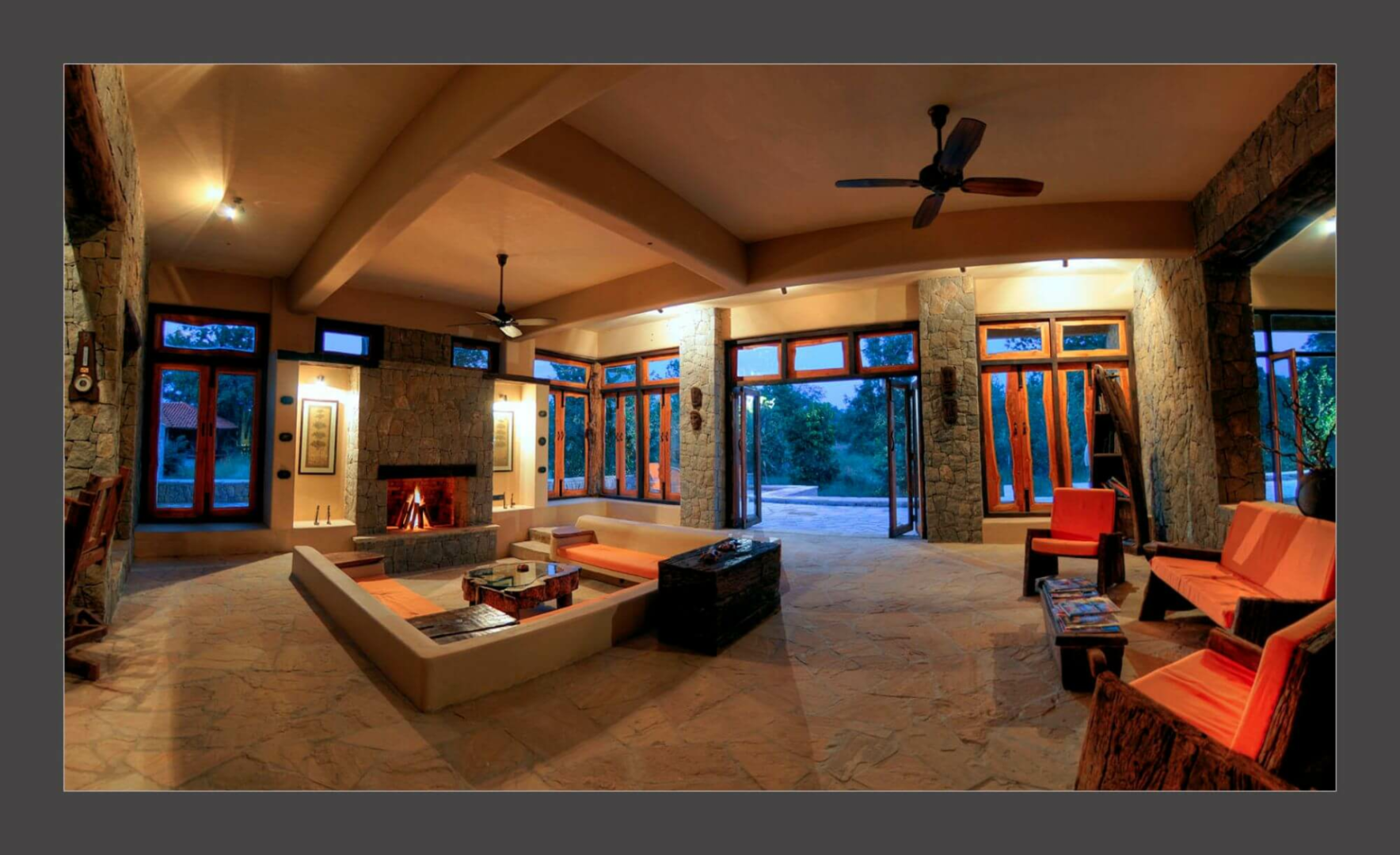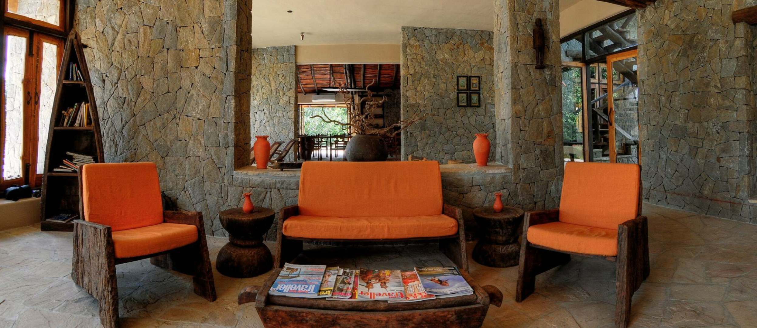Sonst ist die Lodge wie alle anderen Pugdundee Anwesen sehr angenehm und eine solide Wahl für die Luxusklasse, bei der man nichts falsch machen kann. Man erreicht das Hauptgebäude über einen langen Weg vorbei an dem schön eingerichteten Souvenirshop. Die Begrüßung erfolgt mit Tika (dem roten Punkt am Stirn) und anschließend gelangt man ins luftige und große Haupthaus. Links vom Eingang befinden sich eine wunderschöne Bibliothek und ein Vortragsraum, wo jeden Abend Vorträge und Doku-Filme gezeigt werden. Rechts hat man den schönen Speiseraum, wo die gemeinsamen Mahlzeiten serviert werden. Die Standorte für die Mahlzeiten sind zahlreich und wechseln jeden Abend, wobei in den heißen Monaten März und April eher im Inneren zu Mittag gegessen wird, in den kühleren Monaten findet man zahlreichen Locations auf dem Gelände.