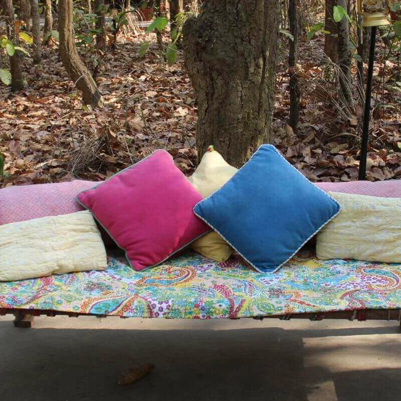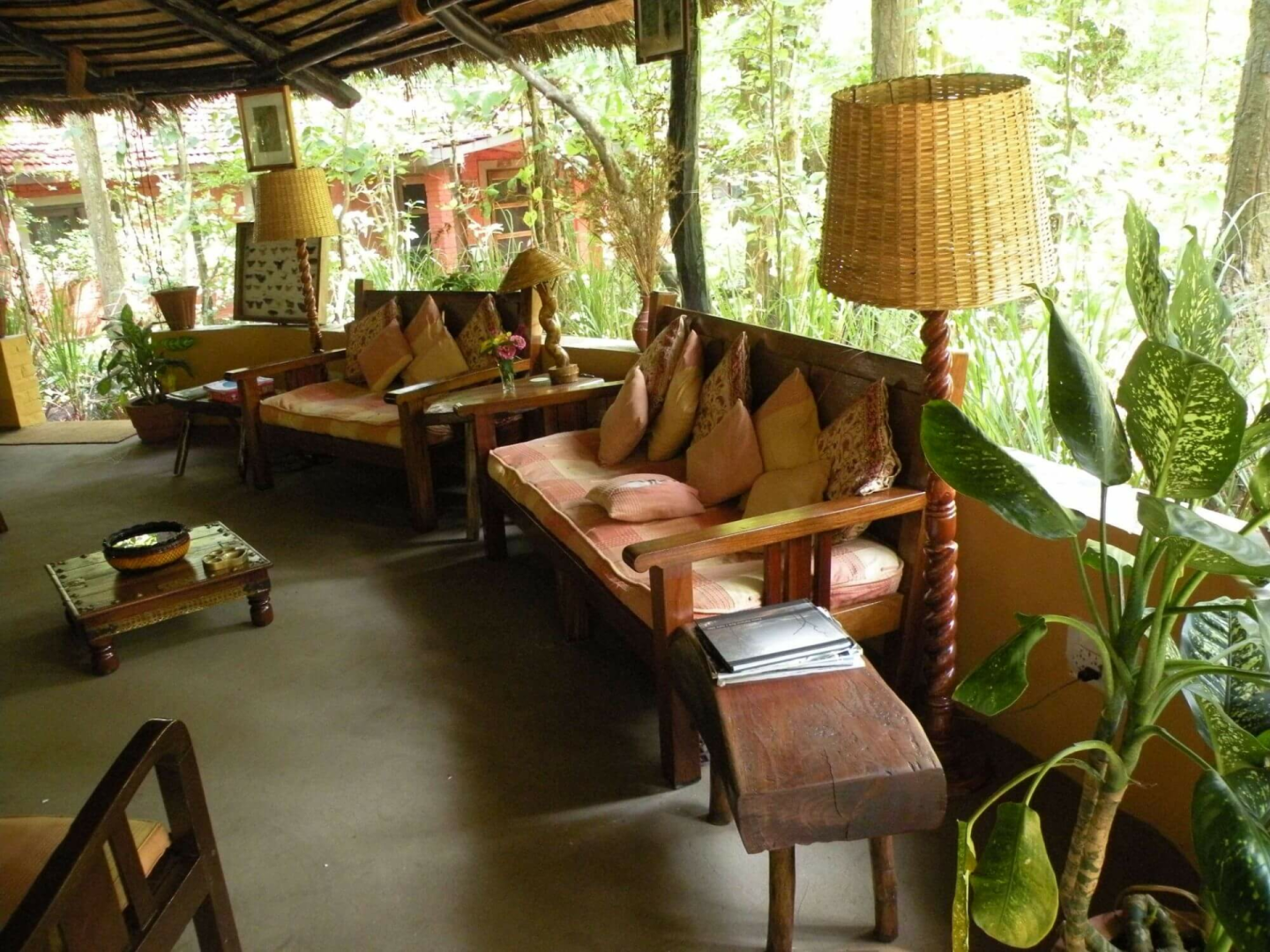 Man erreicht die Lodge vom Parkplatz aus über einen schönen Pfad, der sich gerade aus durch den Salbaum-Wald spannt. Der Weg endet an einer großen sonnigen Lichtung, wo sich ein kleiner Gebetstempel, ein sehr schöner farbenfroher Loungebereich und das halboffene Haupthaus befinden, in dem auch die Mahlzeiten serviert werden.