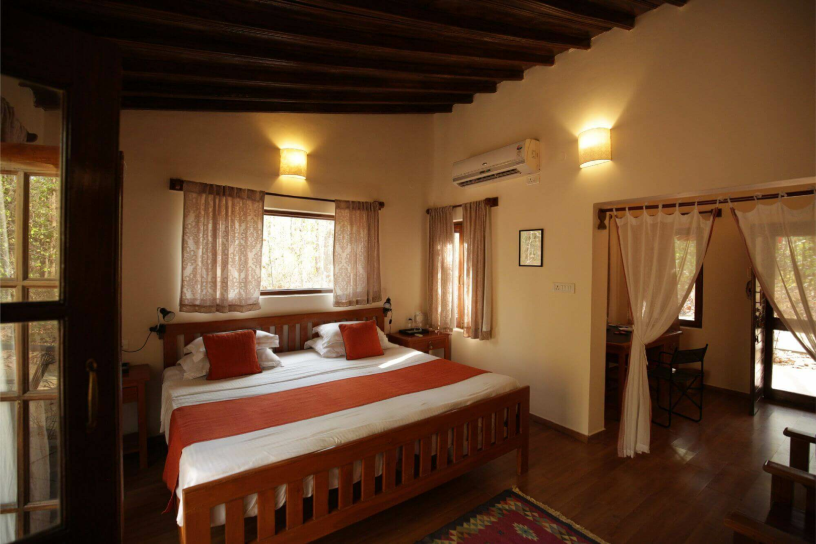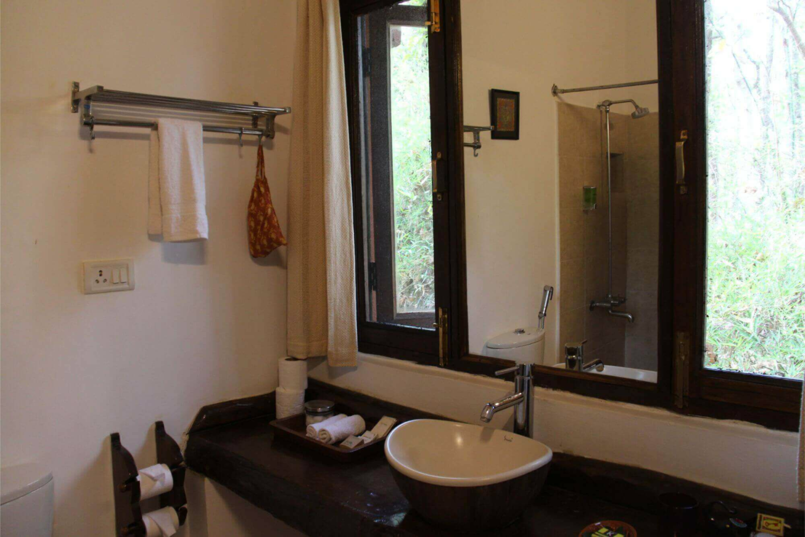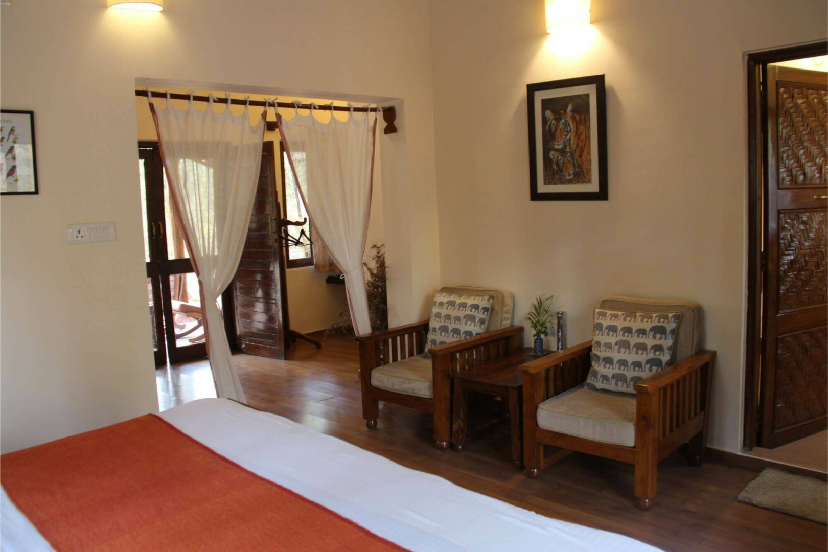 Auf der positiven Seite muss man erwähnen, dass 50 % des Personals weiblich ist. Selbst die Managerin ist eine Frau und professionelle Köchin. Die Kundschaft ist gemischt, aber überwiegend indisch. Die Lage inmitten des Waldes direkt angrenzend zum Nationalpark ist natürlich von großem Vorteil. Auch wenn man keine Versprechungen zu einer tatsächlichen Begegnung machen soll, passieren Leoparden und sogar Tigersichtungen hier tatsächlich.