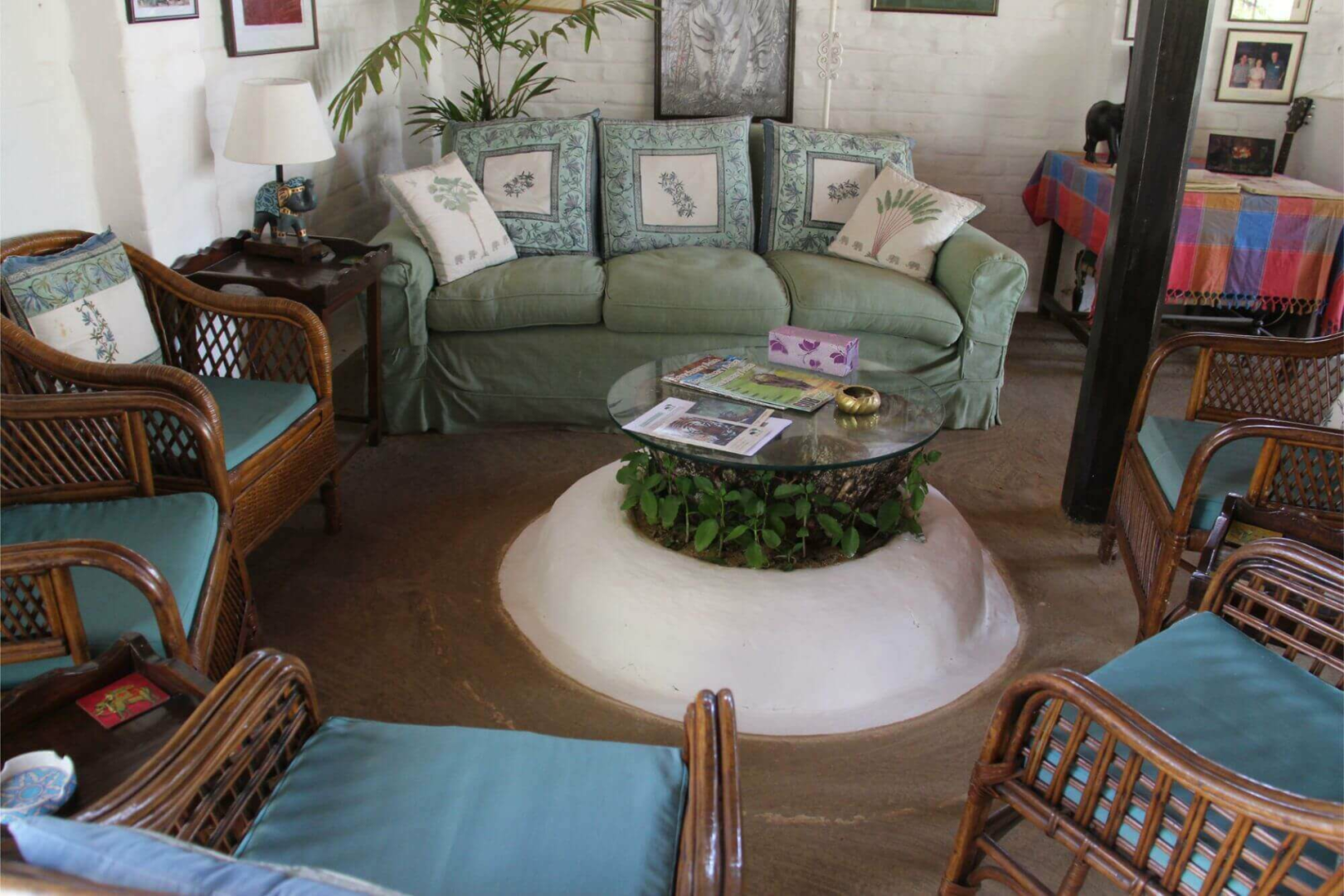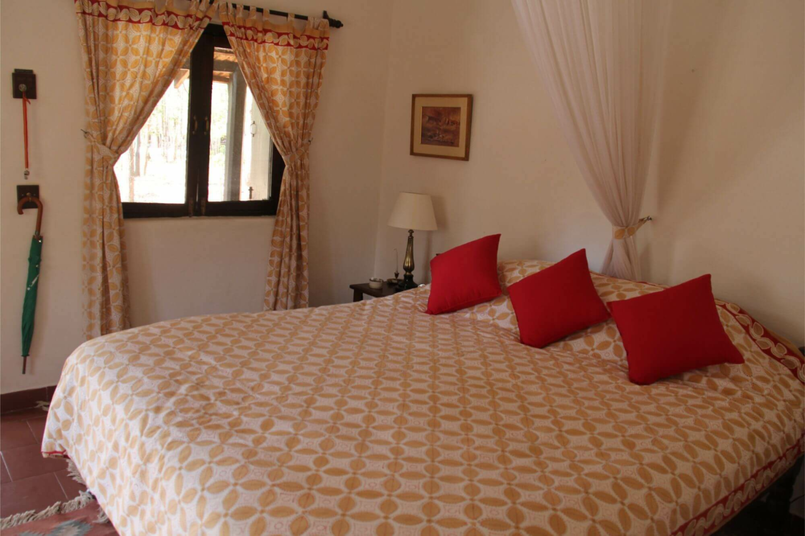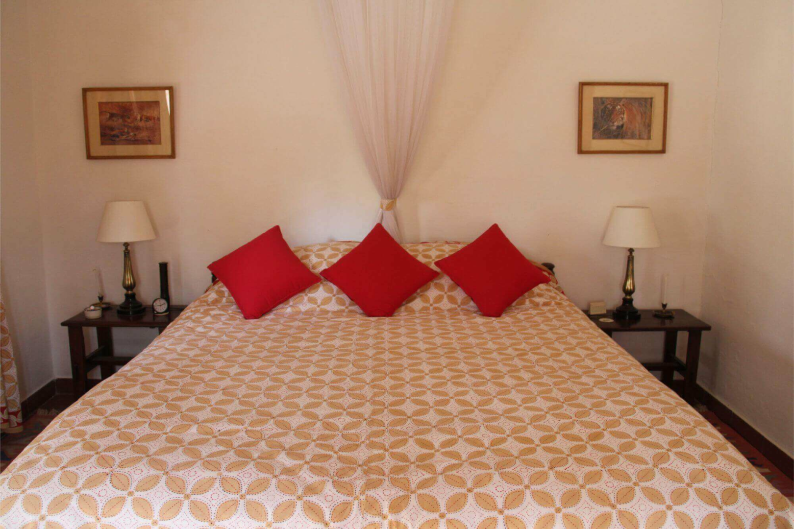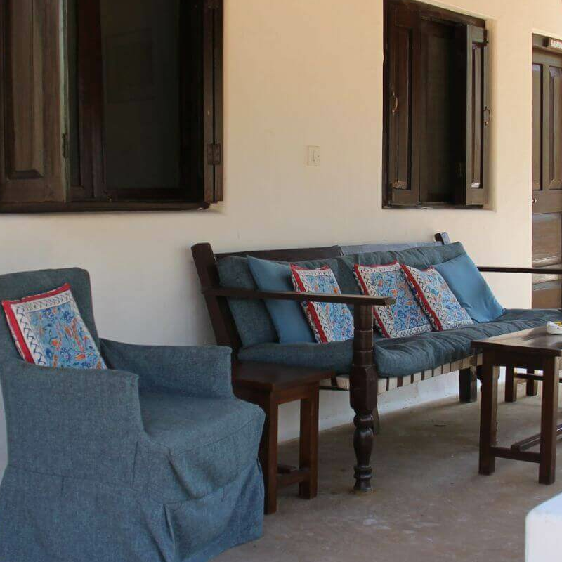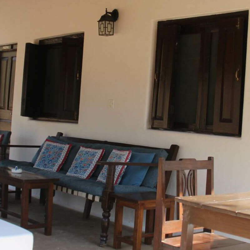 Sonst besteht das Camp aus einem simplen, großen und offenen weißen Haus, wo Lounge und Esstisch eingerichtet sind, sowie aus zwölf Cottages, die jeweils zwei Zimmer unterbringen. Die Zimmer sind nicht super spektakulär, dafür aber sehr farbenfroh und versprühen einen ländlichen gemütlichen Charakter, der sehr einladend ist. Jedes Zimmer hat natürlich seine eigene Sitzecke draußen. Vor einem der Bungalows liegt eine natürliche Wasserstelle, die nie austrocknet. Für die Tiere der Umgebung ist das ein Magnet zum Zeitpunkt der Hochsaison.